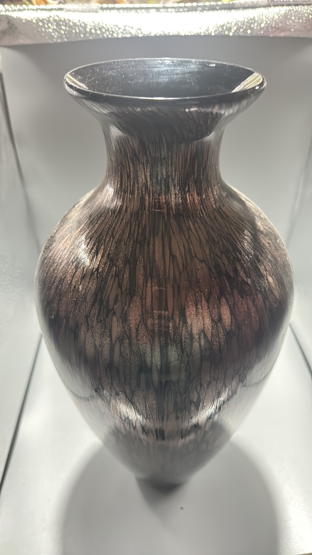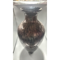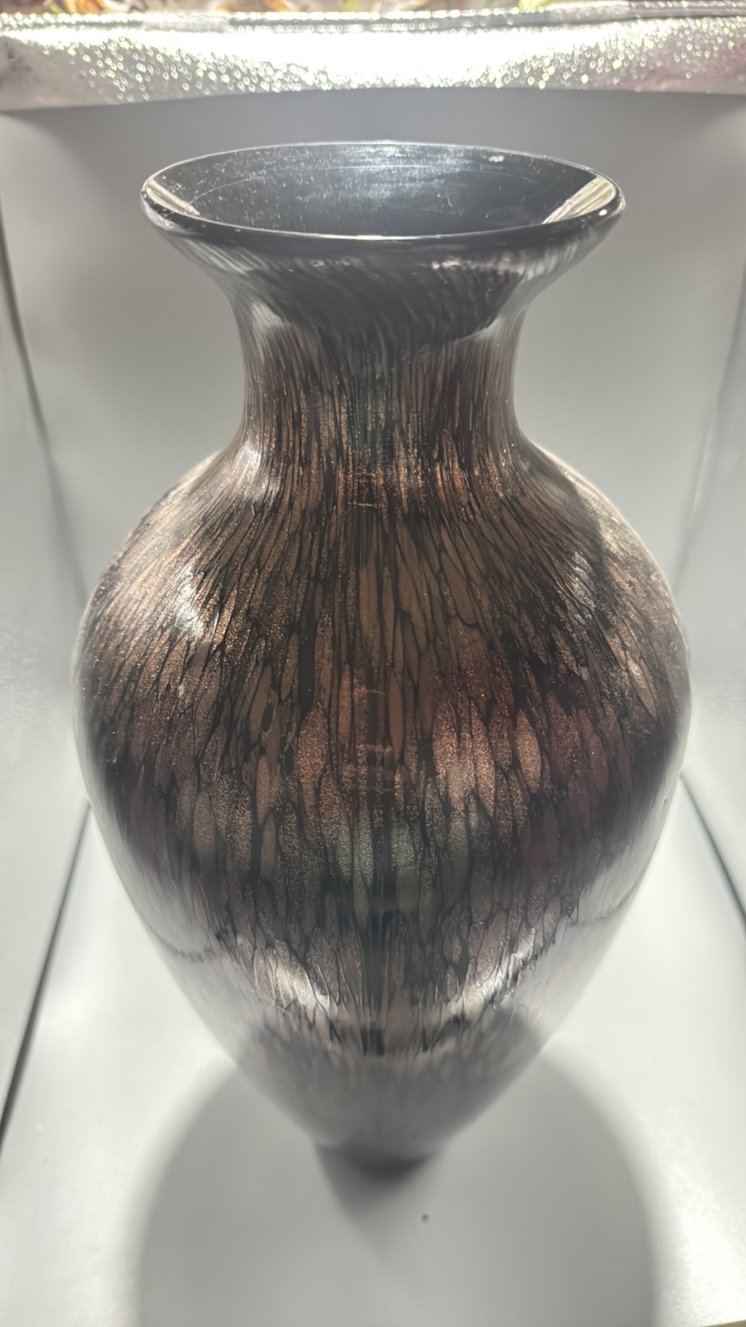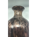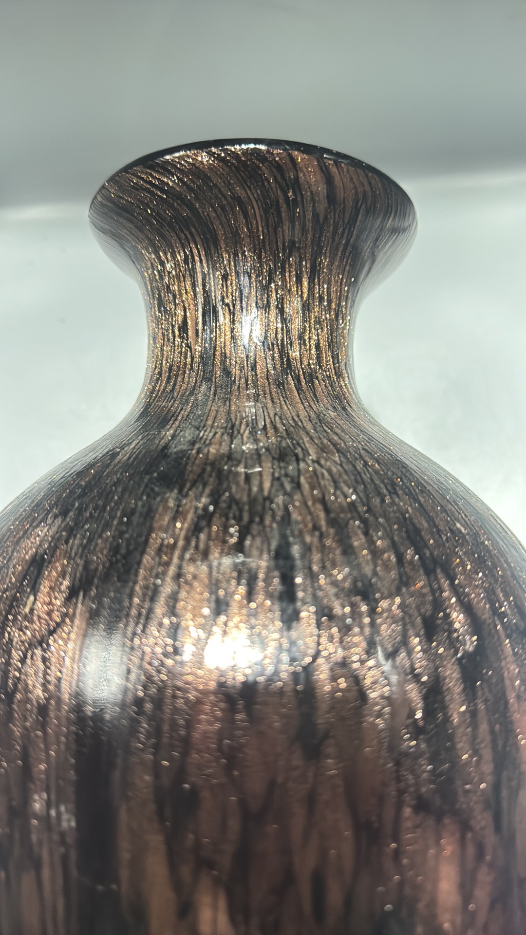Black and copper-toned blown art glass vase with flared rim, slender neck and ovoid body, decorated with shimmering aventurine-like striations.