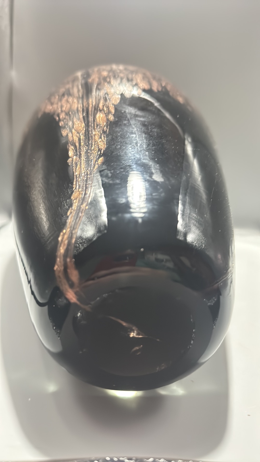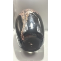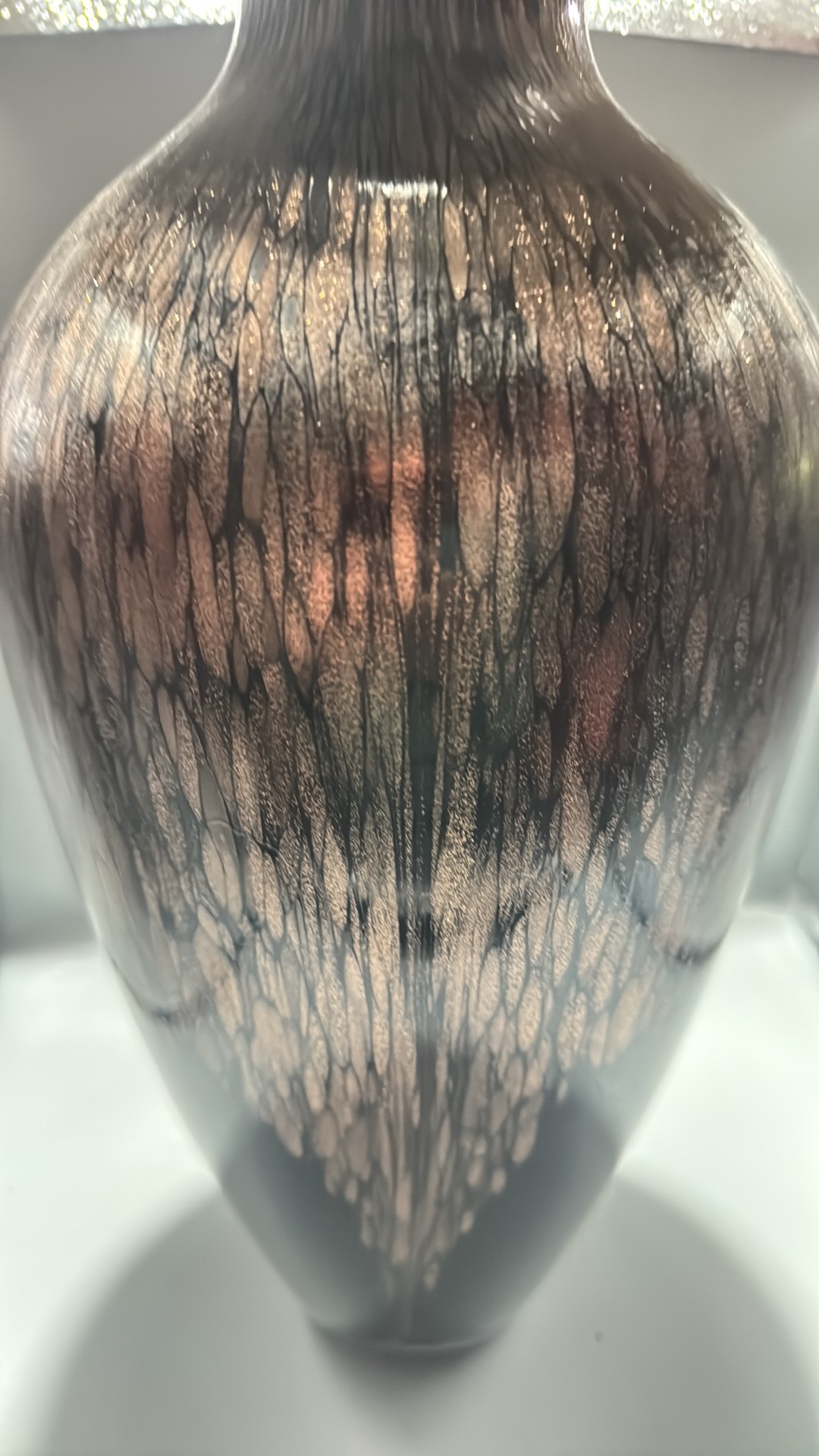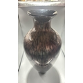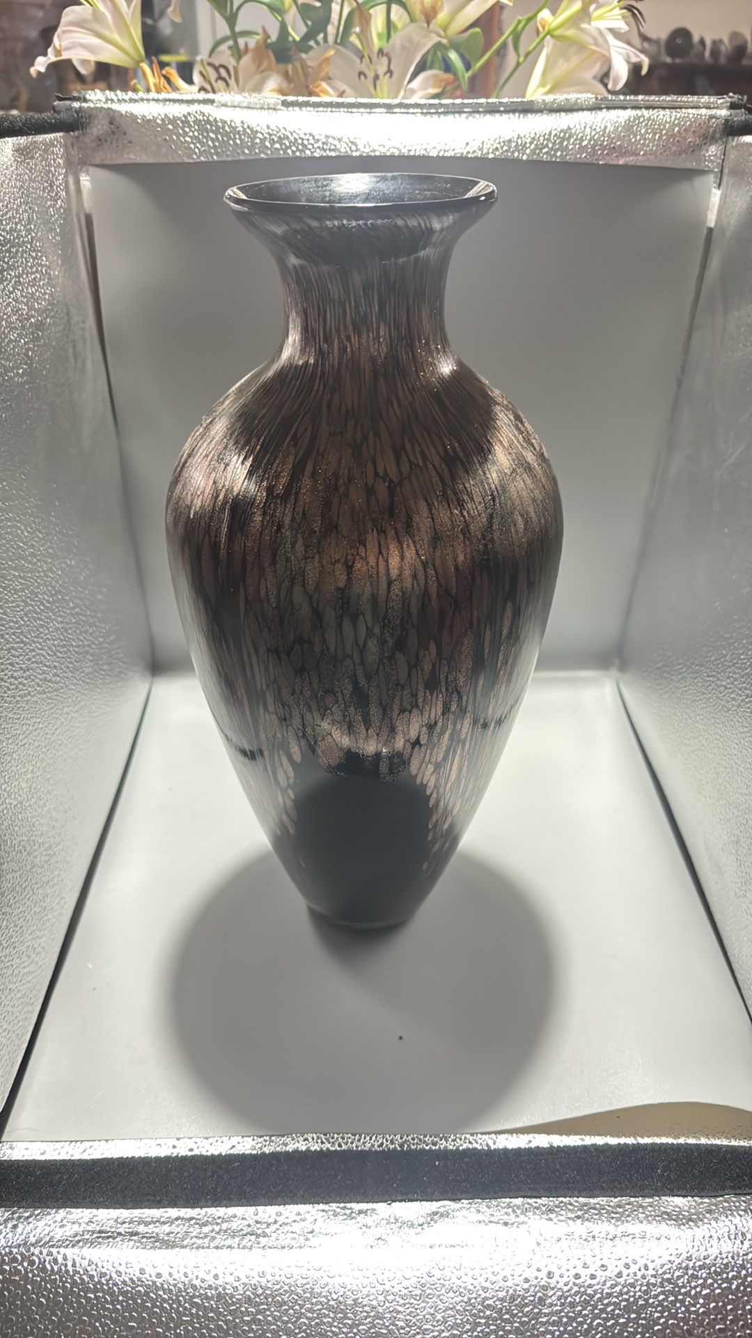 Black and copper-toned blown art glass vase with flared rim, slender neck and ovoid body, decorated with shimmering aventurine-like striations.