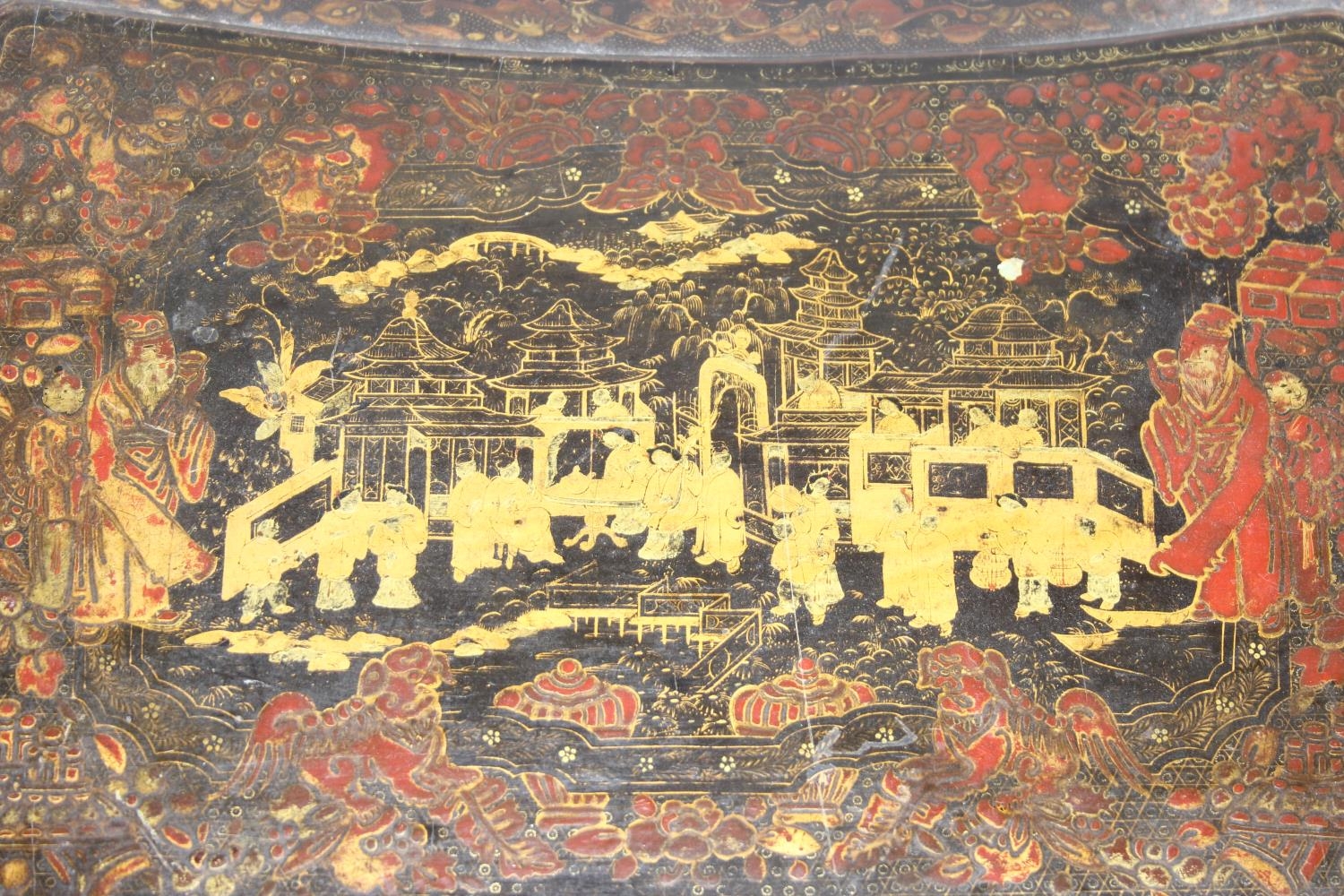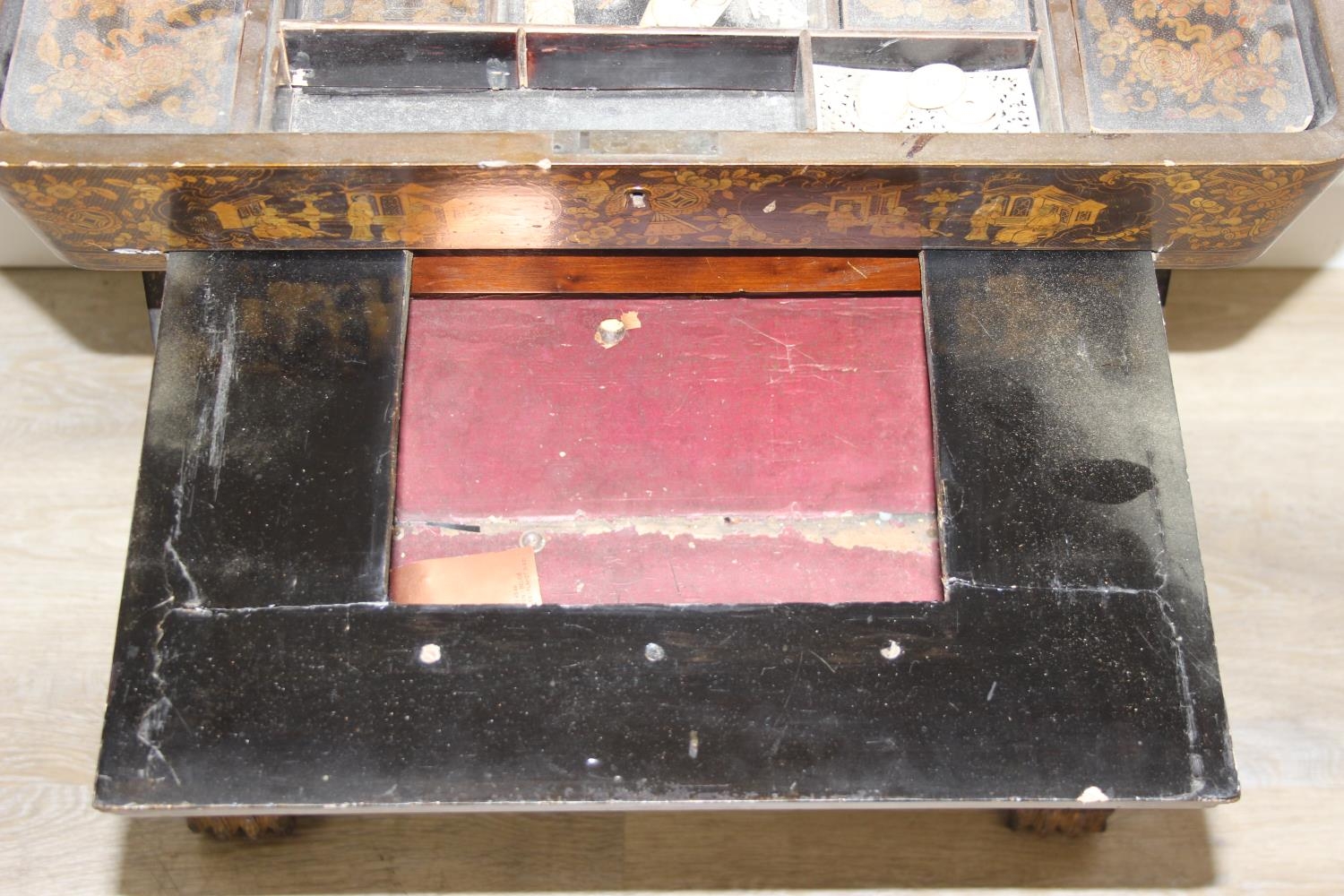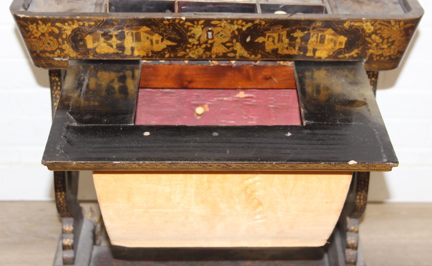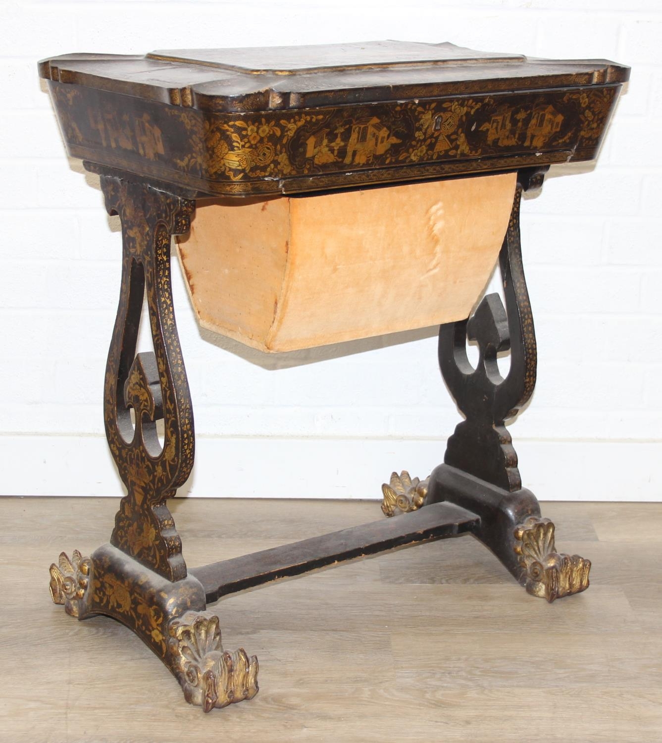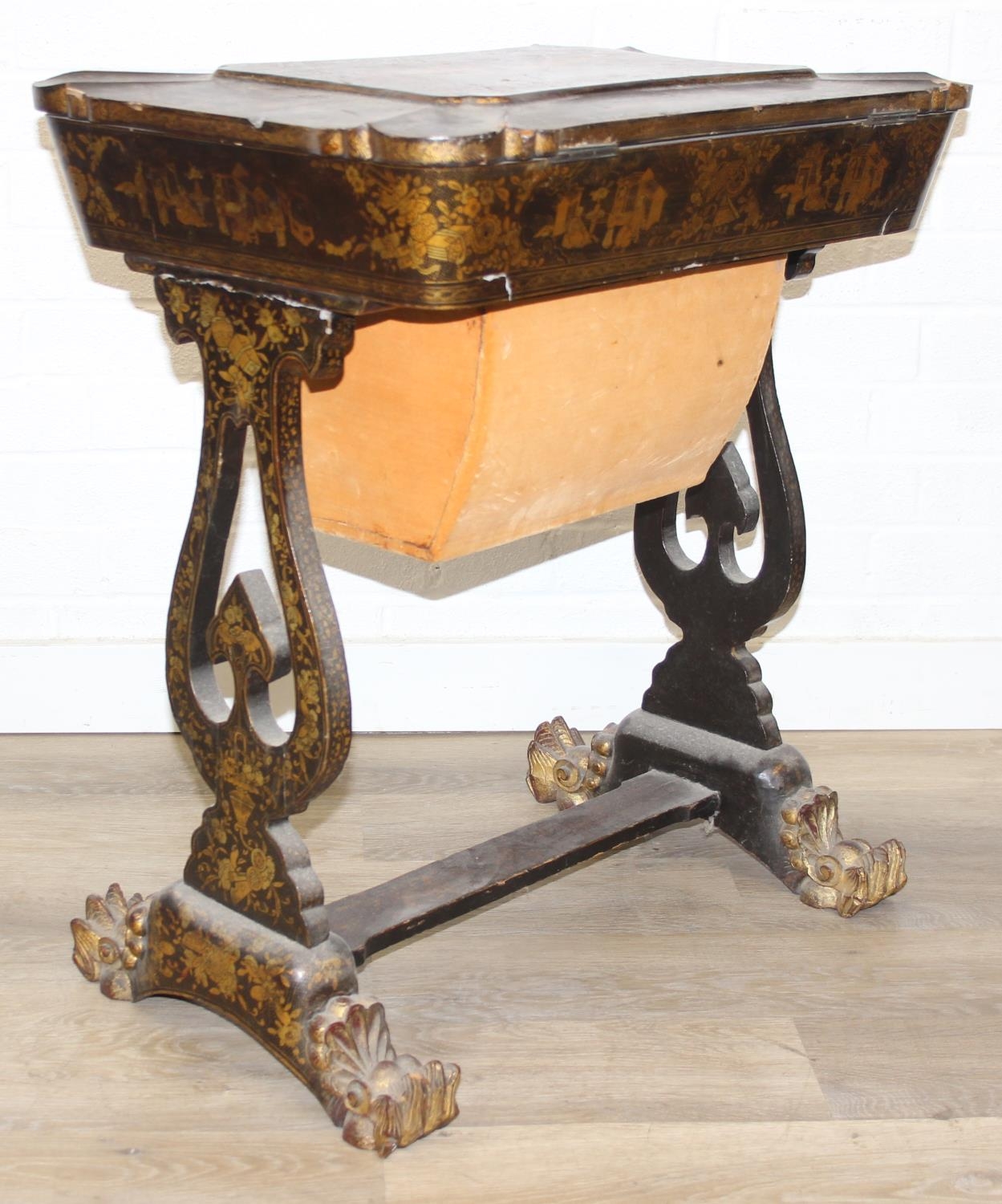 A 19th century Chinese export lacquer work table or sewing table, the top with rounded corners, decorated with chinoiserie scenes enclosing a fitting interior and some sewing accessories above a sliding velvet bag, raised on lyre shaped supports joined by an under-tier, on lion paw fee, 62cm x 44cm x 71cm