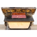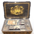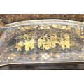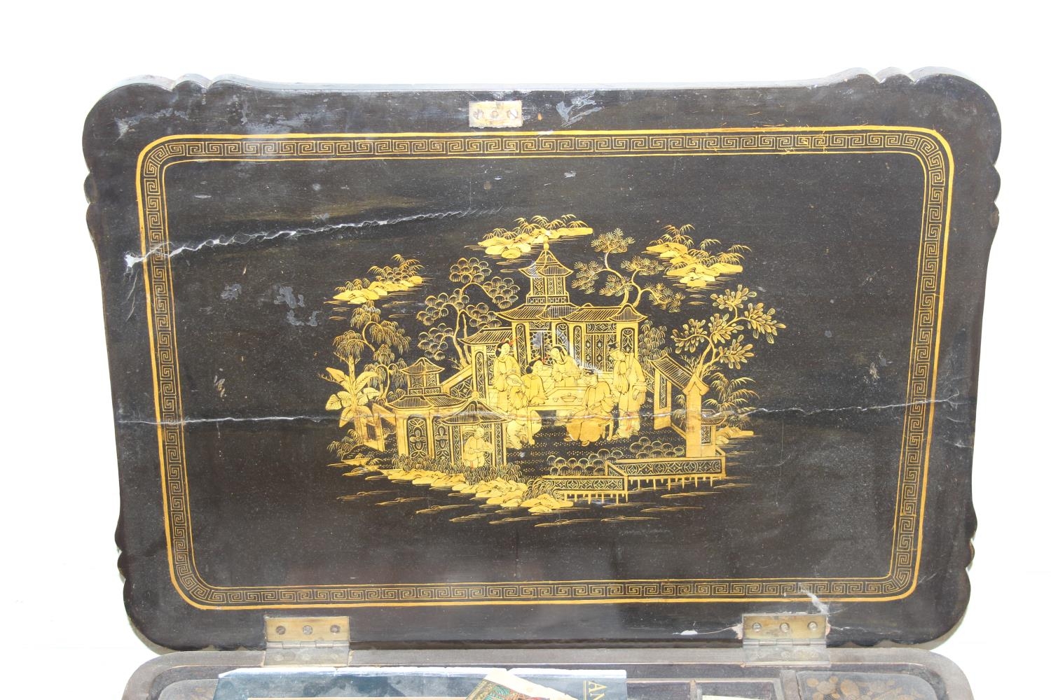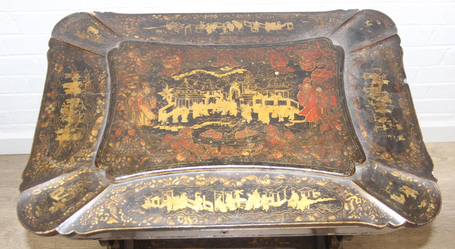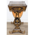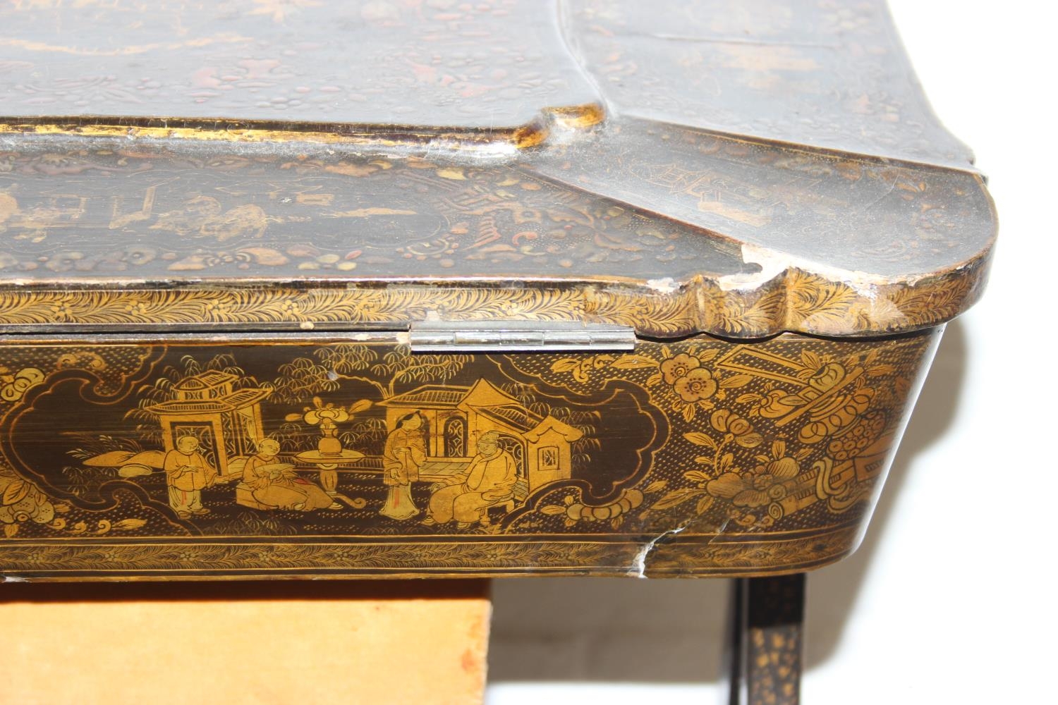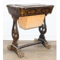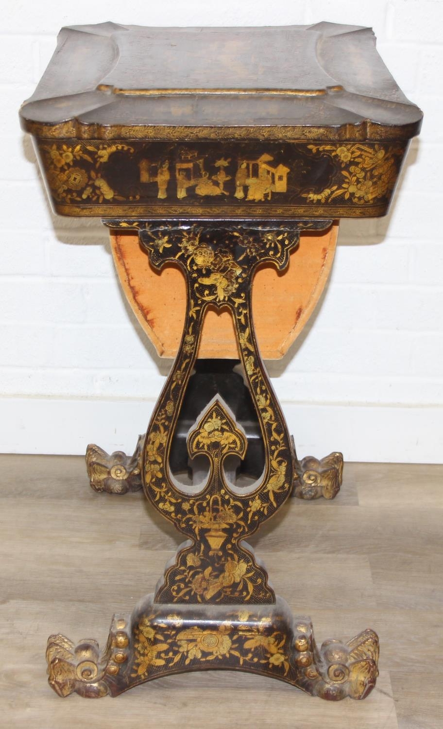 A 19th century Chinese export lacquer work table or sewing table, the top with rounded corners, decorated with chinoiserie scenes enclosing a fitting interior and some sewing accessories above a sliding velvet bag, raised on lyre shaped supports joined by an under-tier, on lion paw fee, 62cm x 44cm x 71cm