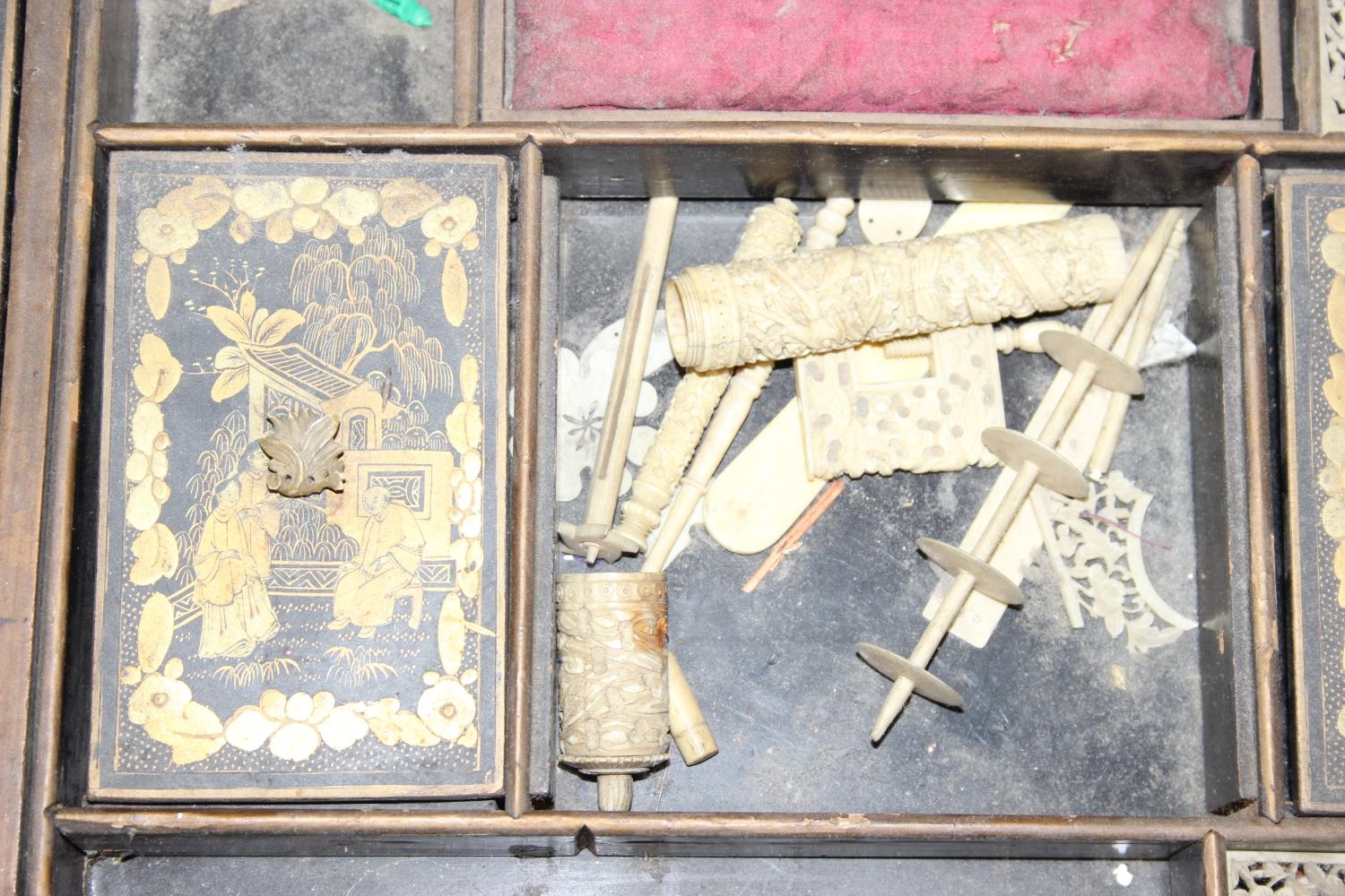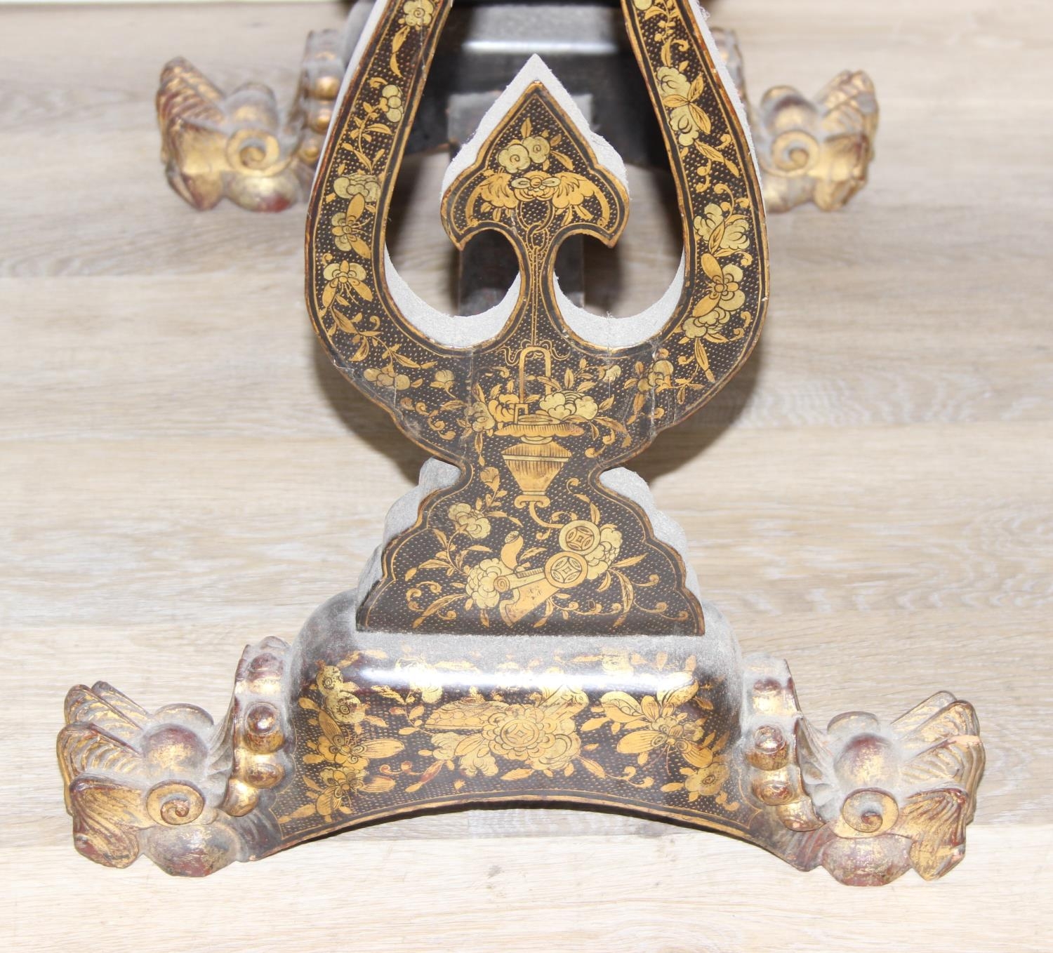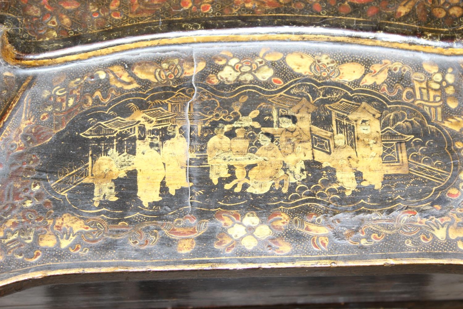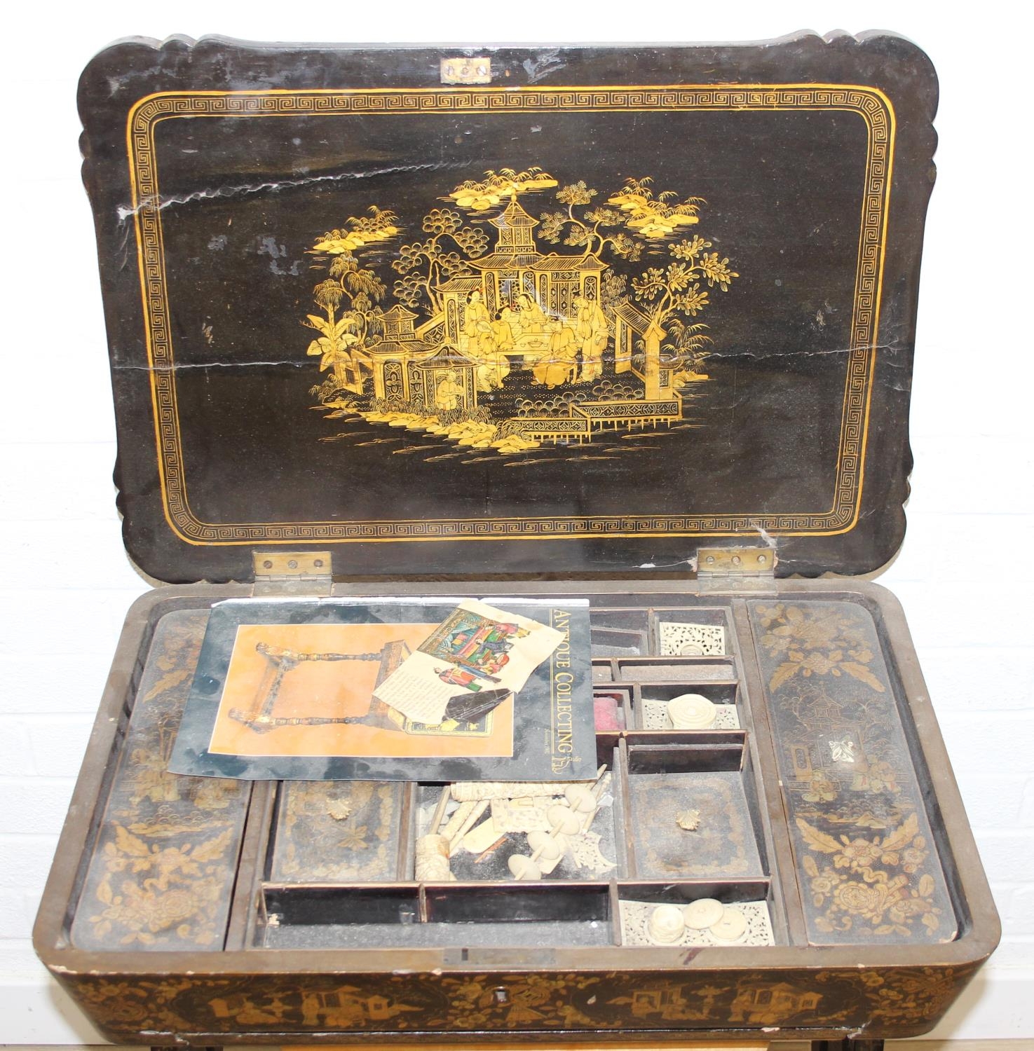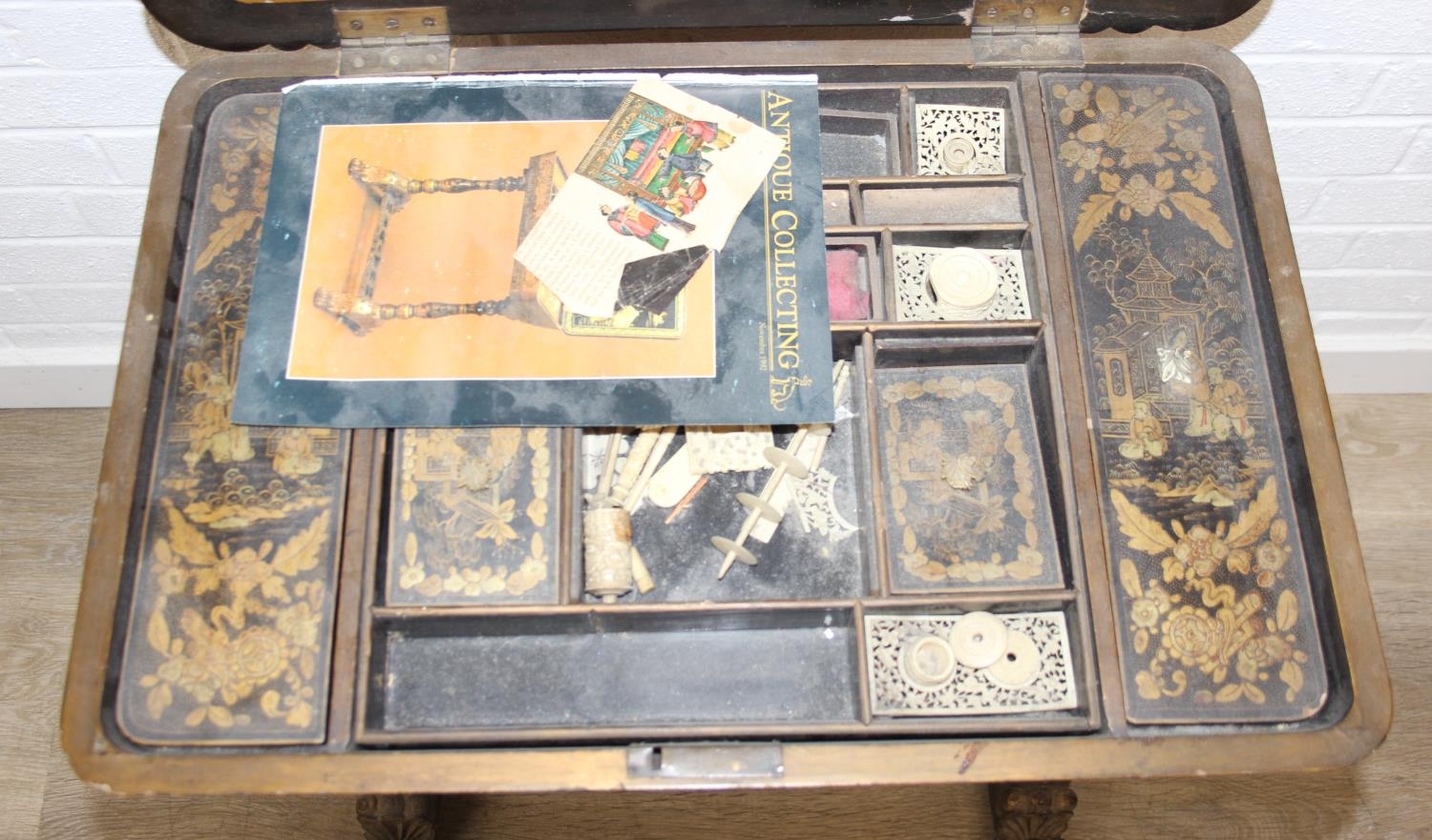 A 19th century Chinese export lacquer work table or sewing table, the top with rounded corners, decorated with chinoiserie scenes enclosing a fitting interior and some sewing accessories above a sliding velvet bag, raised on lyre shaped supports joined by an under-tier, on lion paw fee, 62cm x 44cm x 71cm