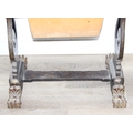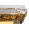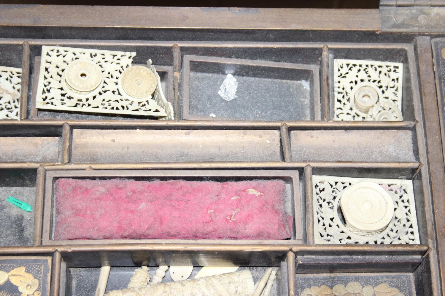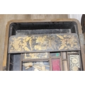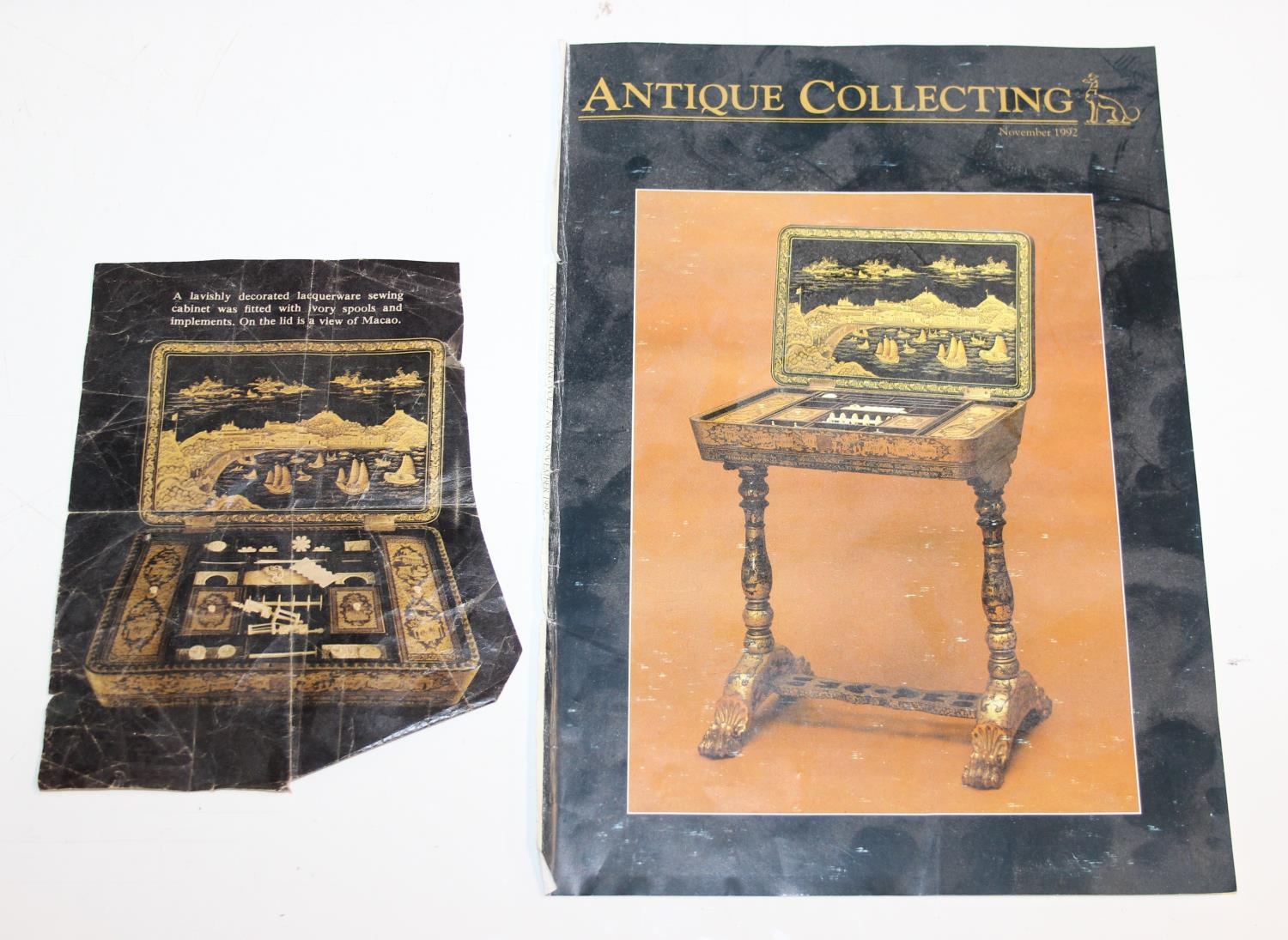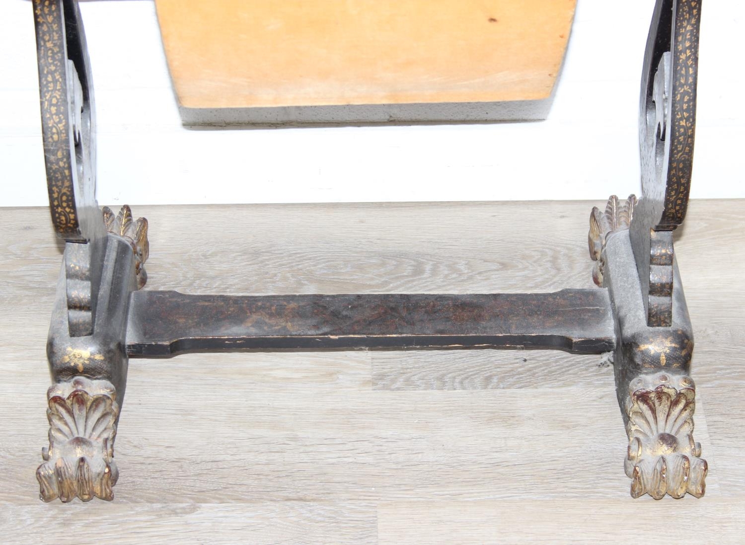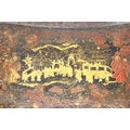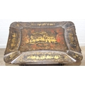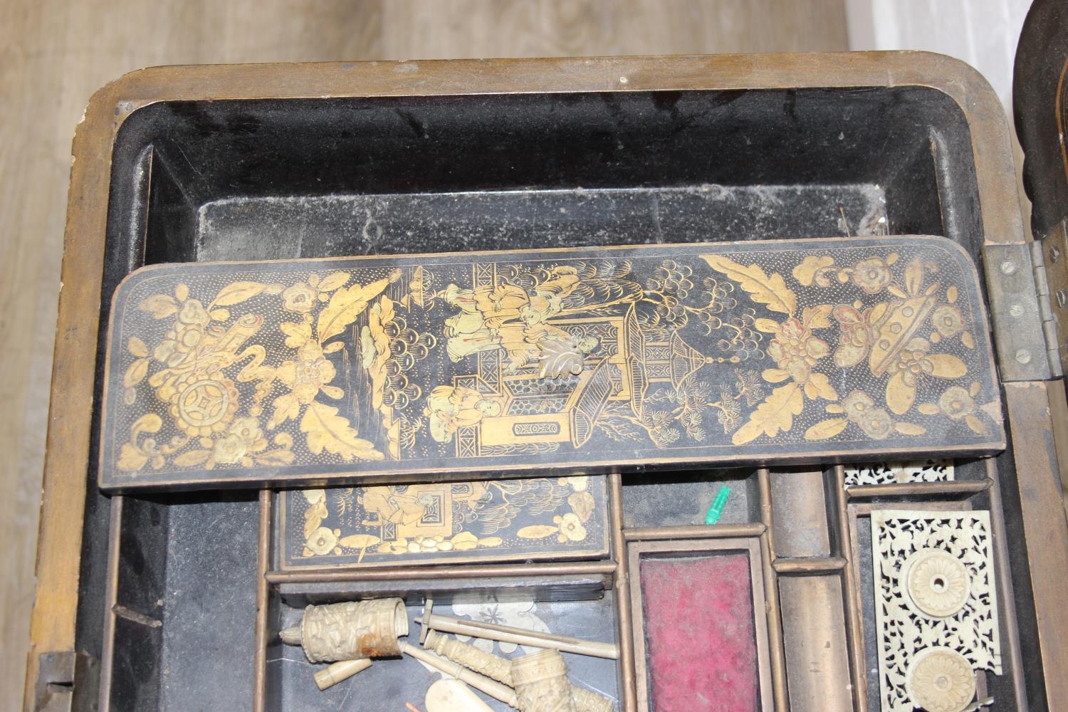 A 19th century Chinese export lacquer work table or sewing table, the top with rounded corners, decorated with chinoiserie scenes enclosing a fitting interior and some sewing accessories above a sliding velvet bag, raised on lyre shaped supports joined by an under-tier, on lion paw fee, 62cm x 44cm x 71cm