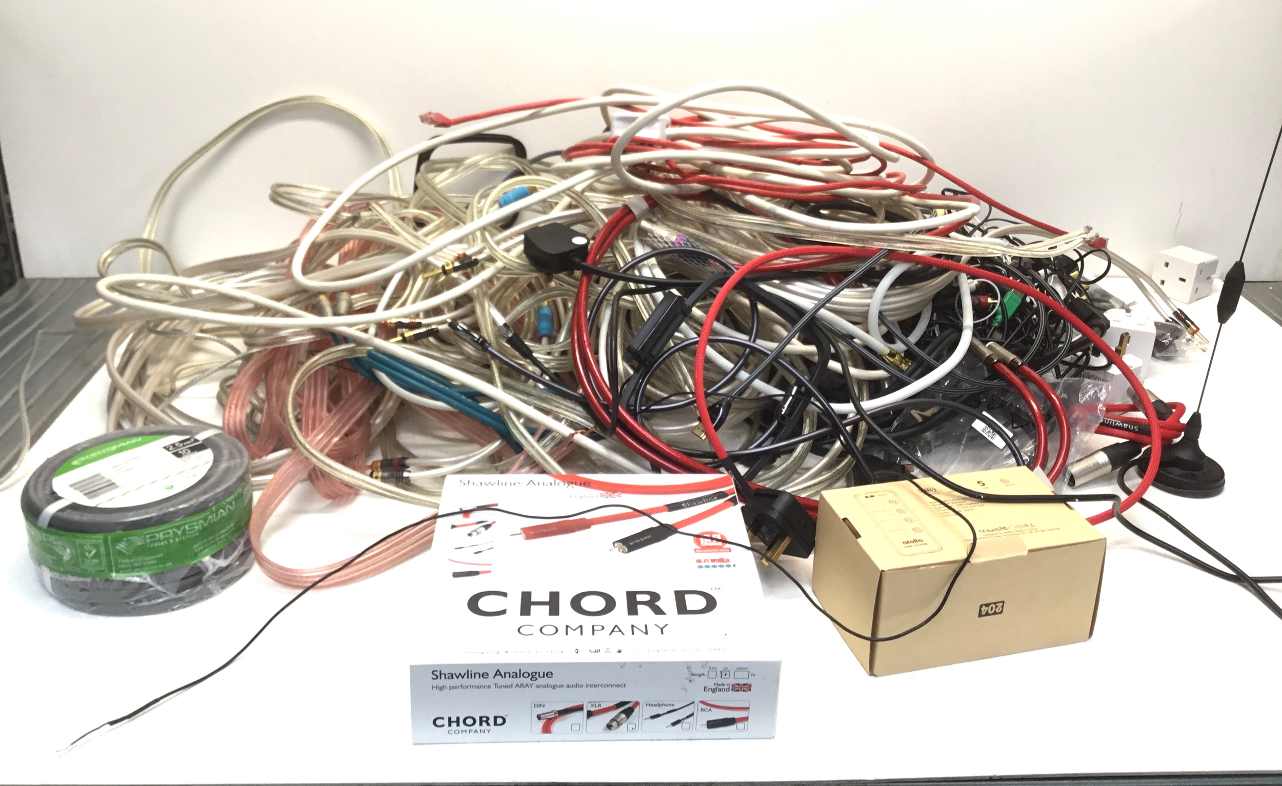 A large quantity of speaker cables and other peripherals