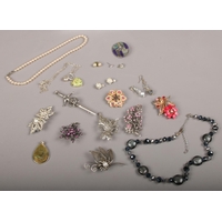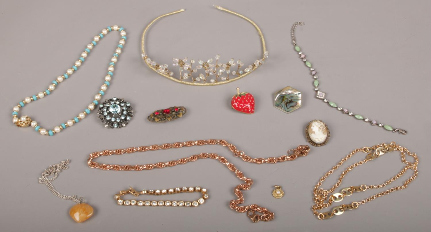 A tray of costume jewellery including a tiara, cameo brooch and a strawberry brooch etc.