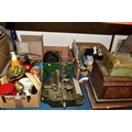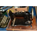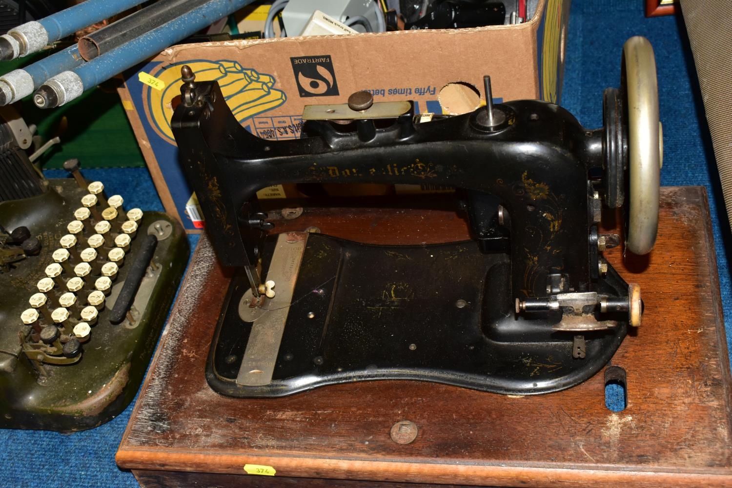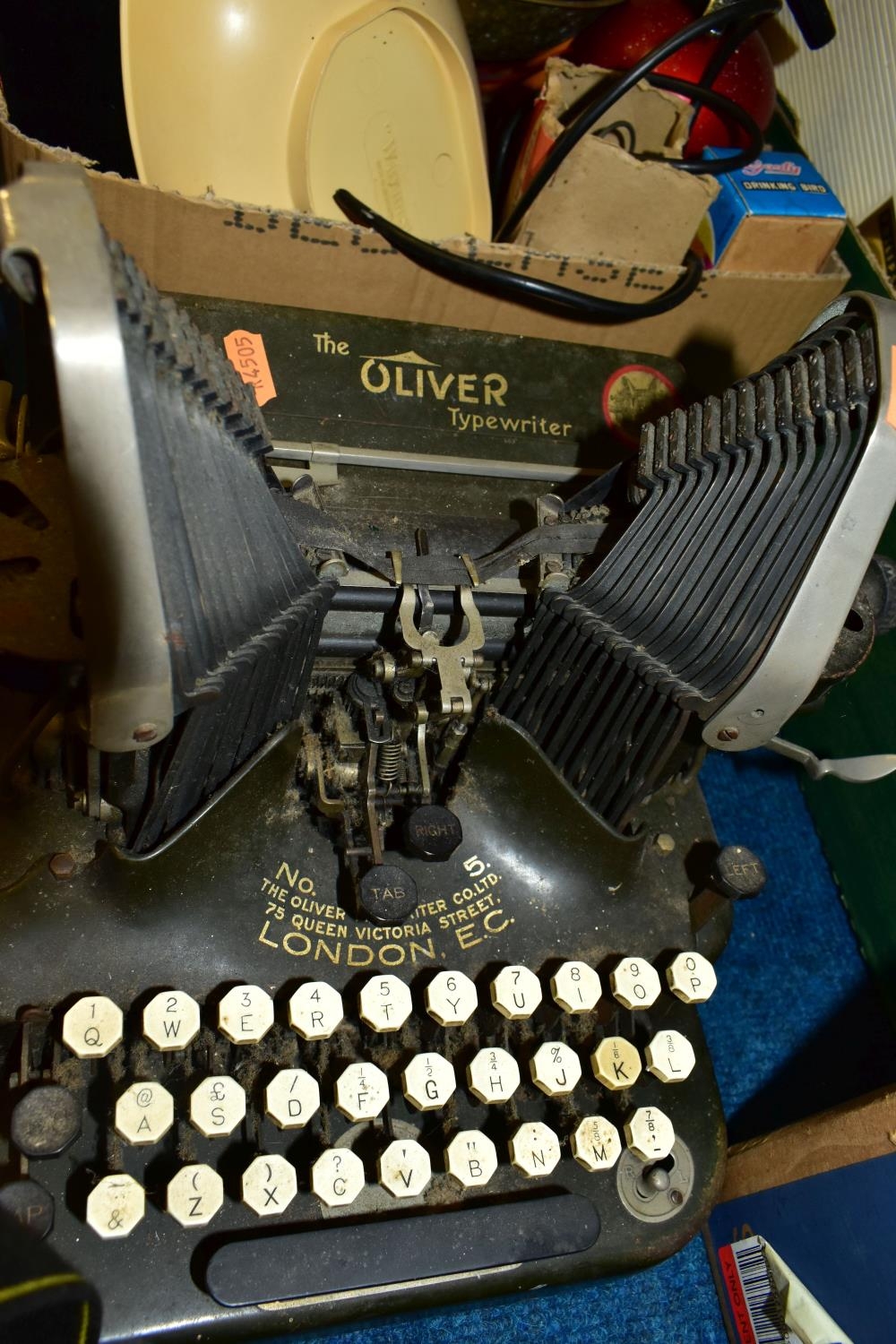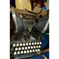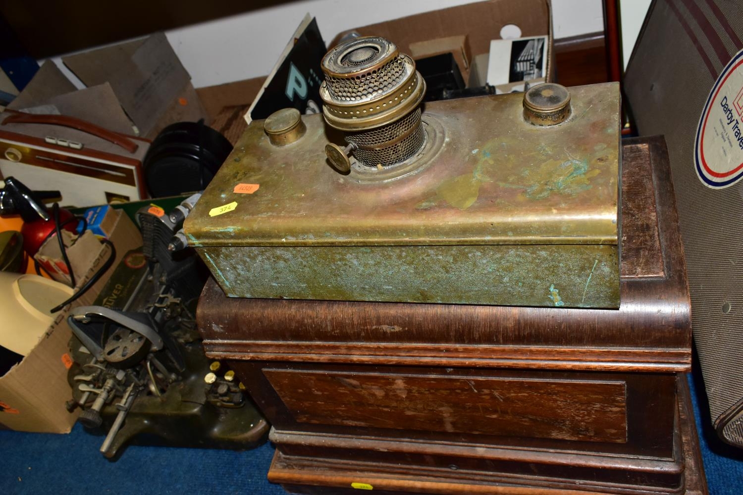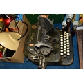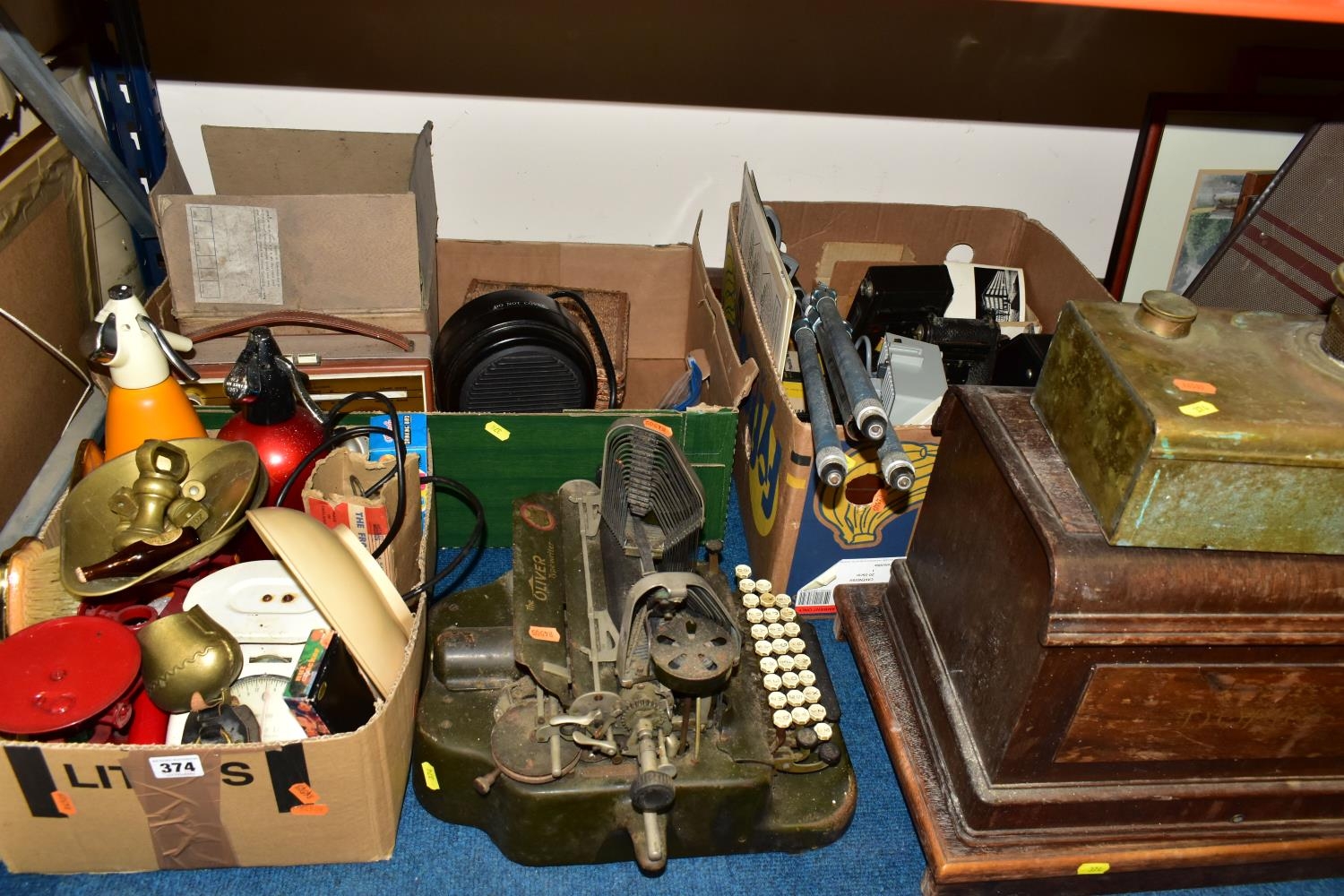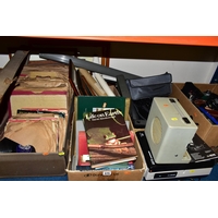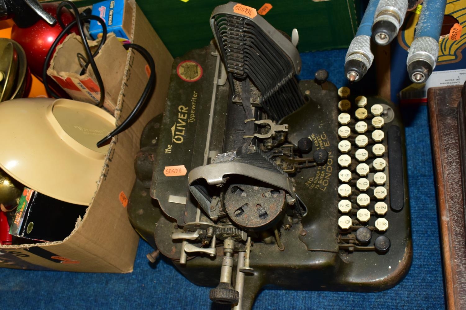 THREE BOXES AND LOOSE TYPEWRITER, SEWING MACHINE, PHOTOGRAPHIC EQUIPMENT AND VINTAGE HOUSEHOLD ITEMS, to include an Oliver Typewriter No 5, a cased Domestic sewing machine, folding cameras including a Zeiss Ikon Nettar, a Samsung WB500 digital camera, a Phillips transistor radio, a Super Aladdin oil lamp, vintage razors and shaving accessories, etc (3 boxes + loose) (sd)