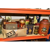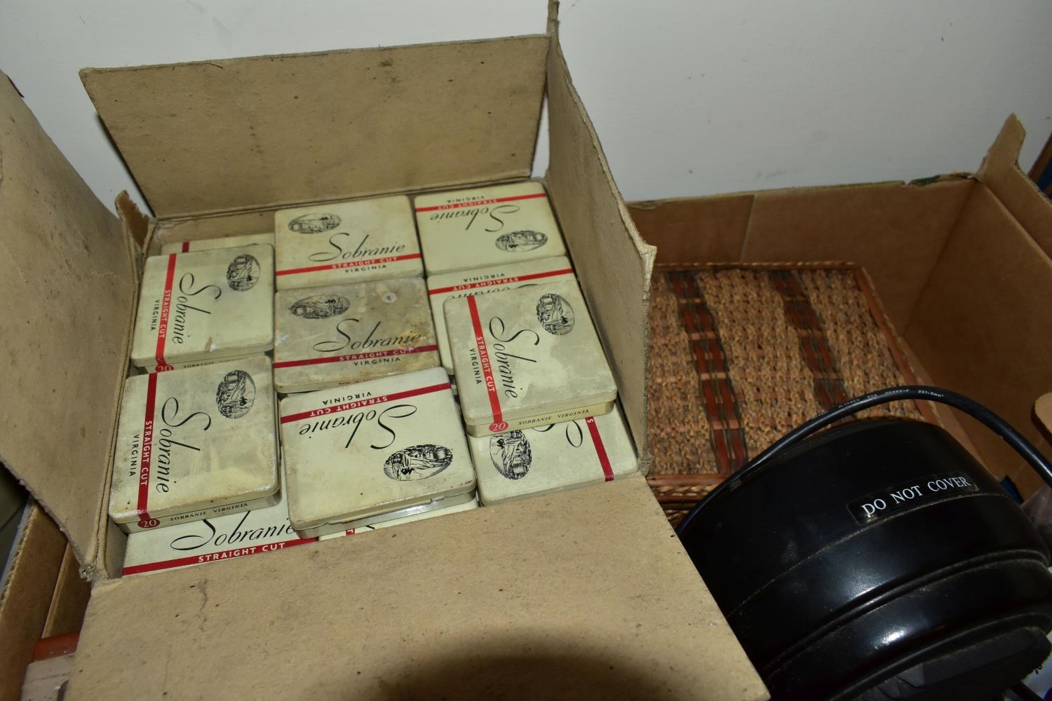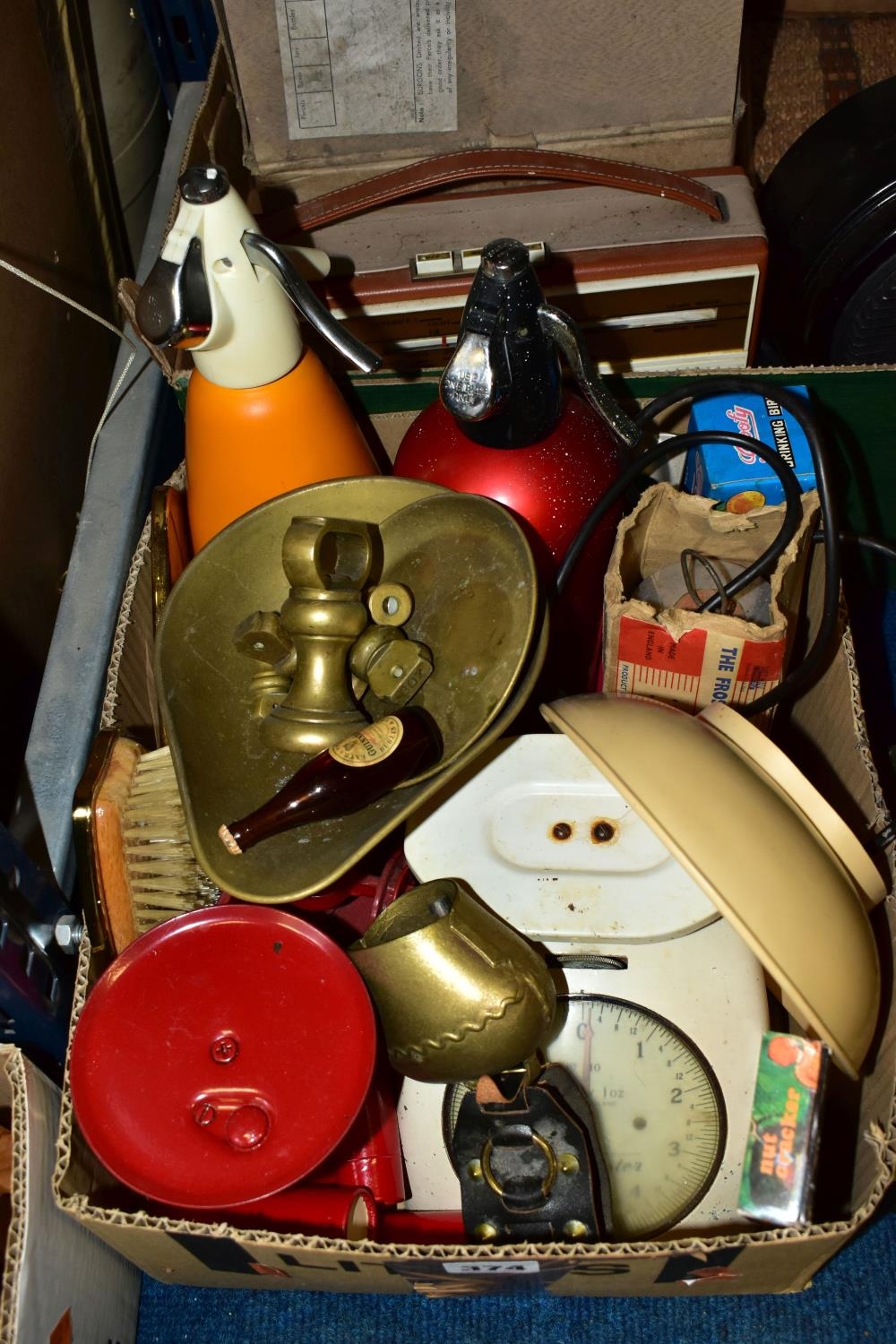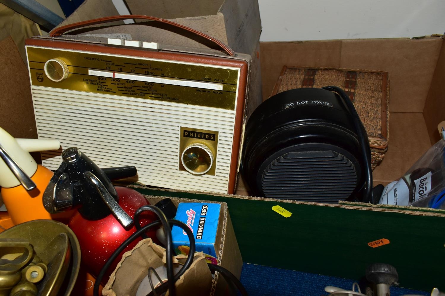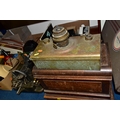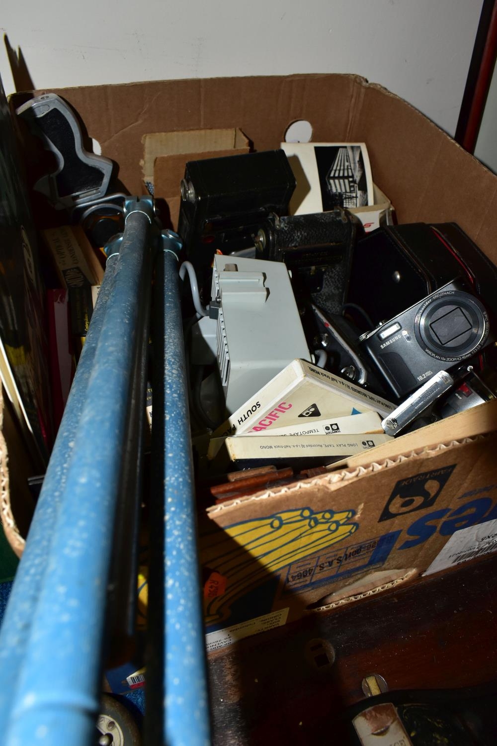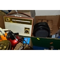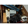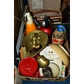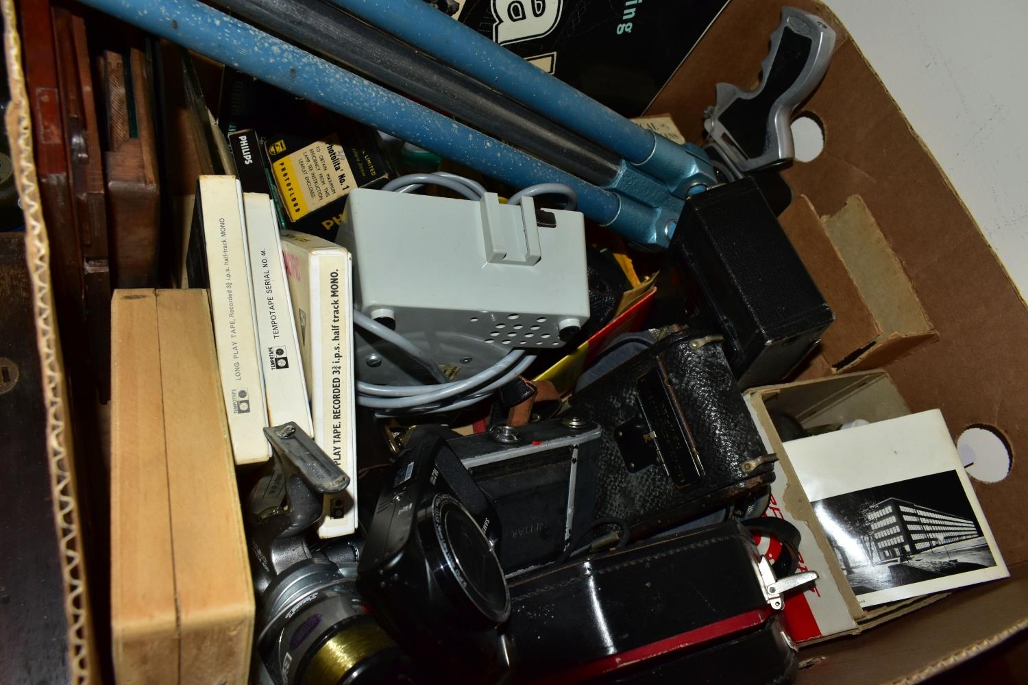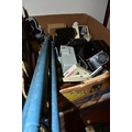 THREE BOXES AND LOOSE TYPEWRITER, SEWING MACHINE, PHOTOGRAPHIC EQUIPMENT AND VINTAGE HOUSEHOLD ITEMS, to include an Oliver Typewriter No 5, a cased Domestic sewing machine, folding cameras including a Zeiss Ikon Nettar, a Samsung WB500 digital camera, a Phillips transistor radio, a Super Aladdin oil lamp, vintage razors and shaving accessories, etc (3 boxes + loose) (sd)