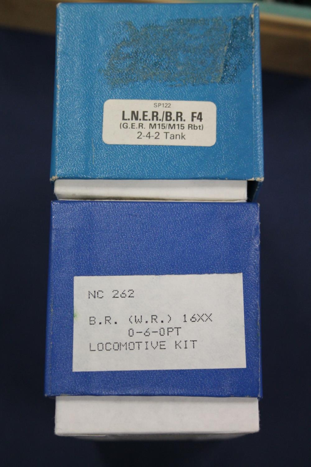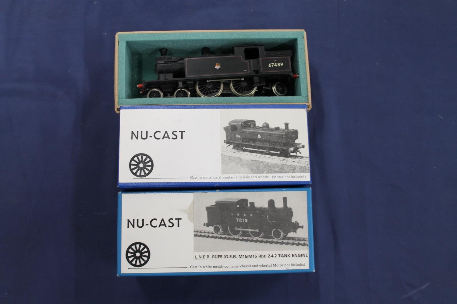 Three Nu-Cast (Nucast) OO gauge super detailed model kit locomotives including NC262 0-6-0 PT tank locomotive, SP122 2-4-2 tank locomotive 67157 BR black (built) and 4-4-2 tank locomotive 67489 BR black, each boxed but not checked for completeness. (3)