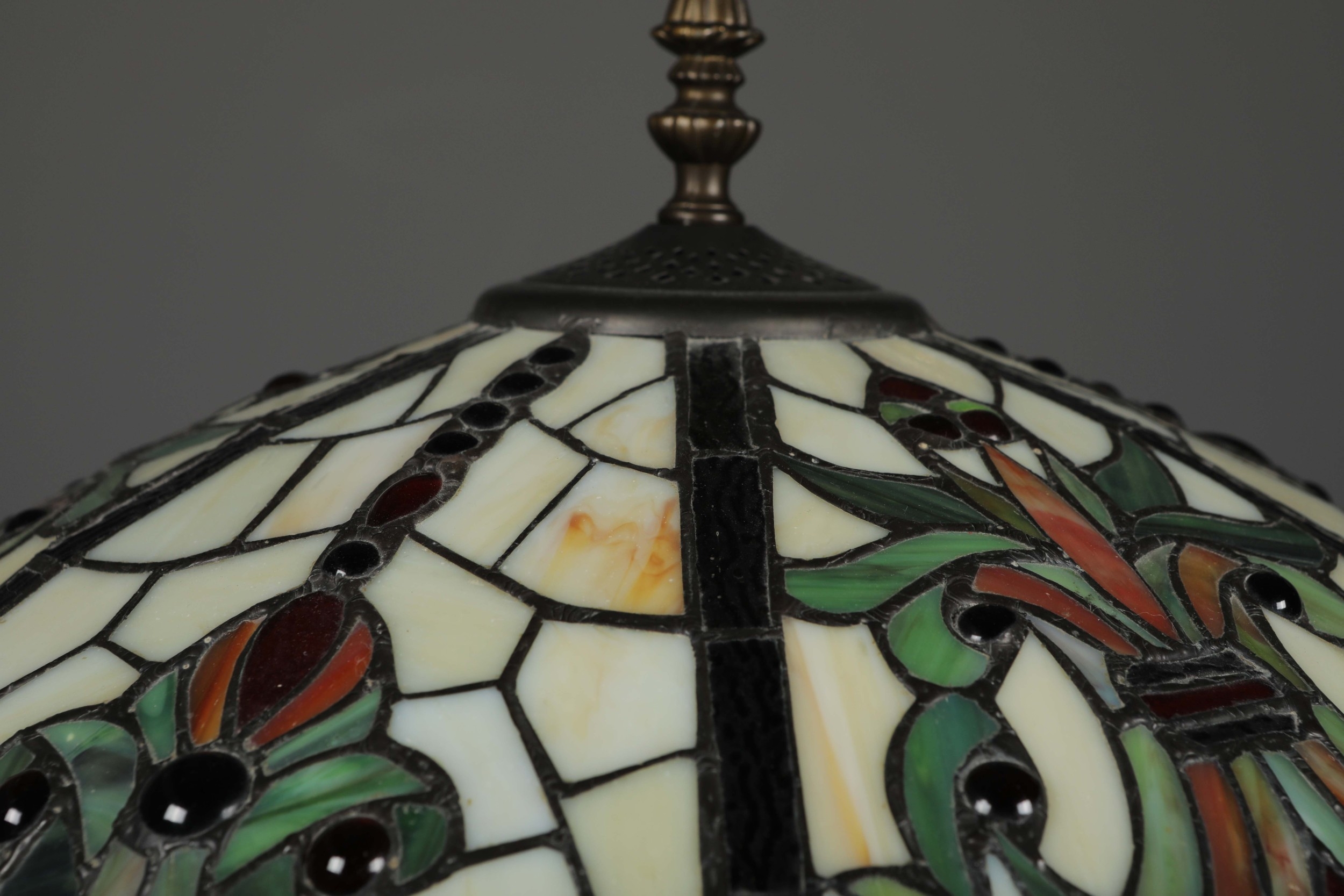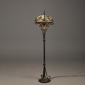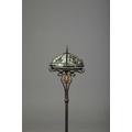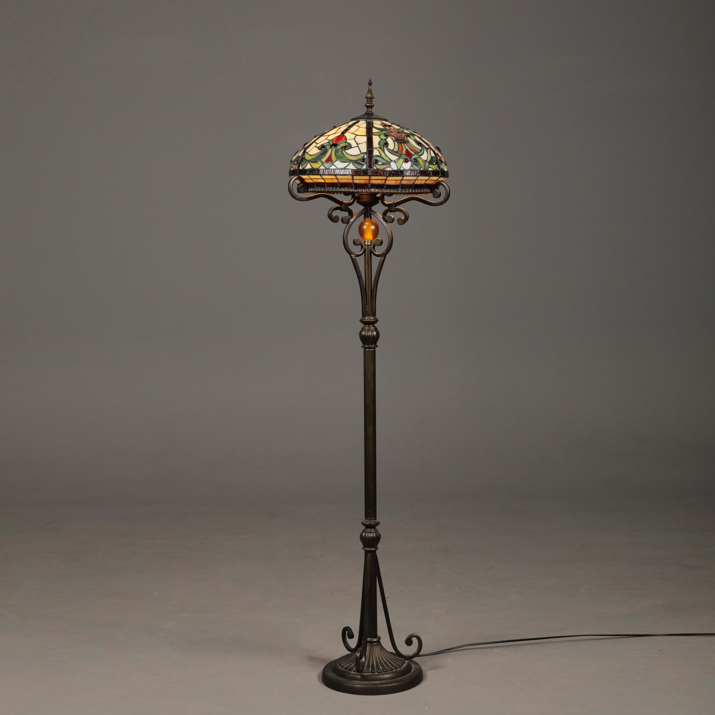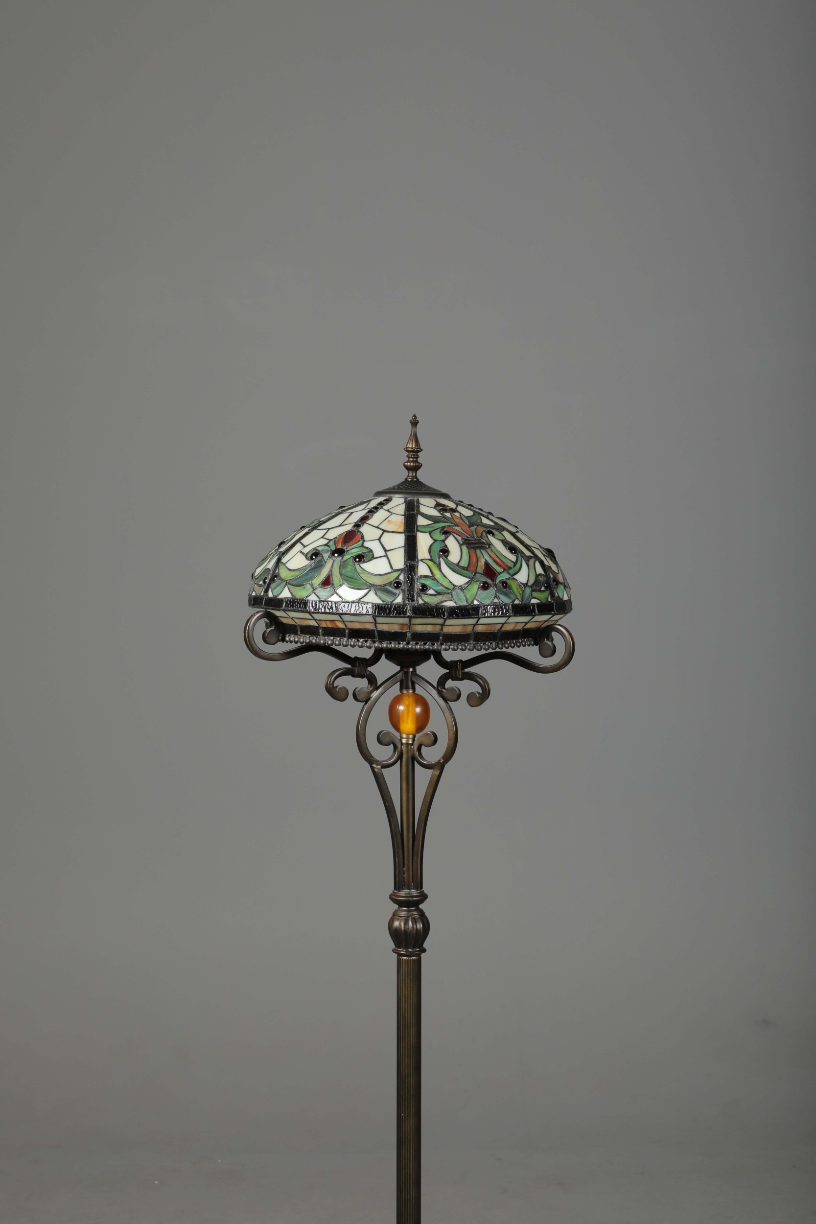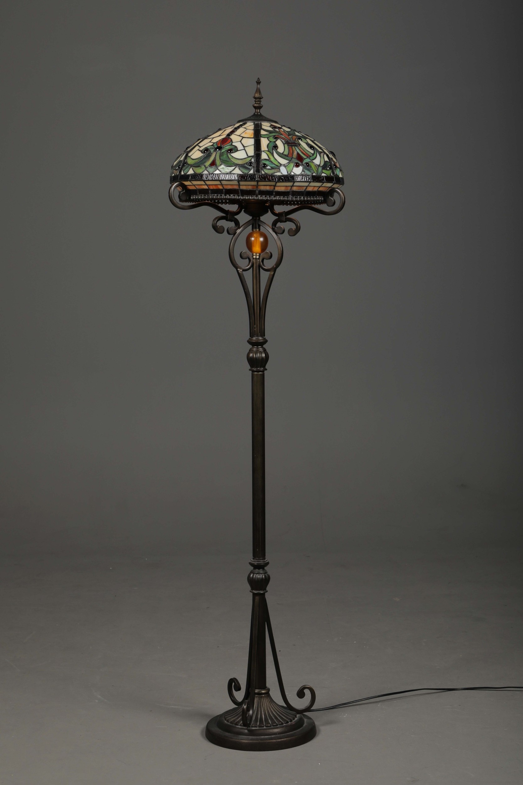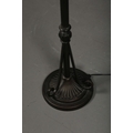 TIFFANY STYLE FLOOR LAMP. the glass shade in a symmetrical stylised foliage design, raised on a scrolled bronzed base, 155cm high.