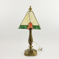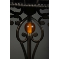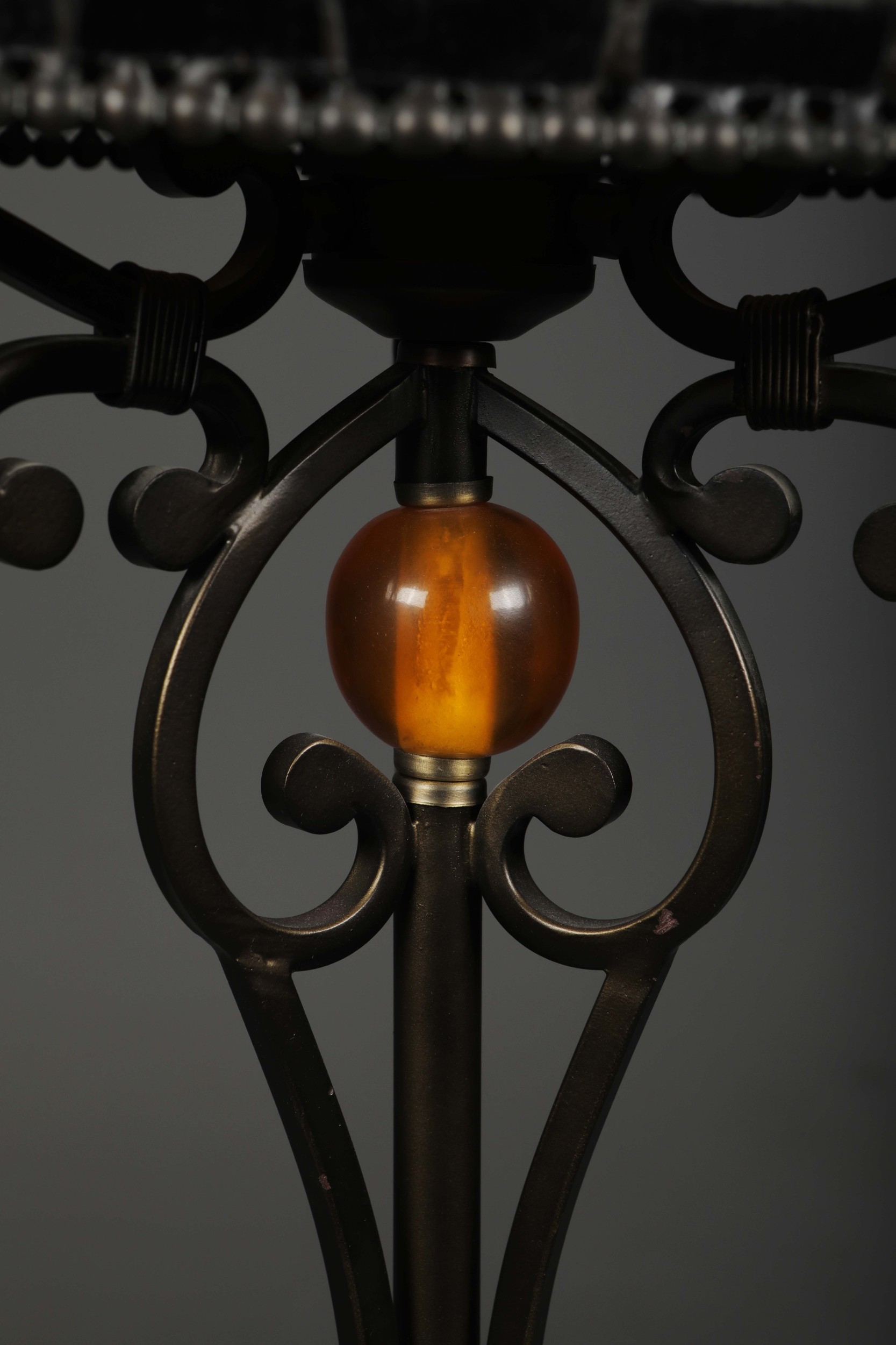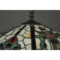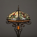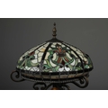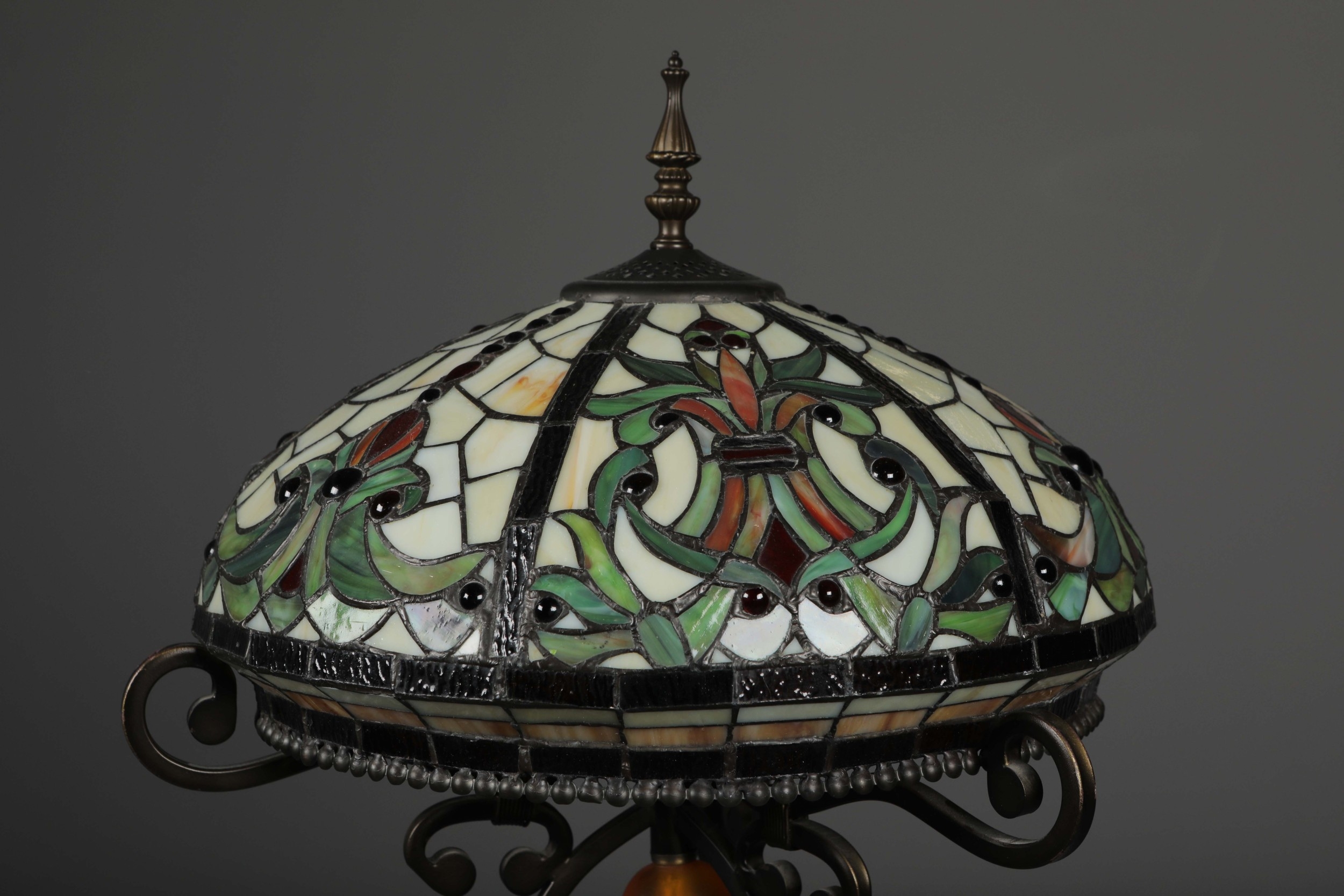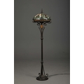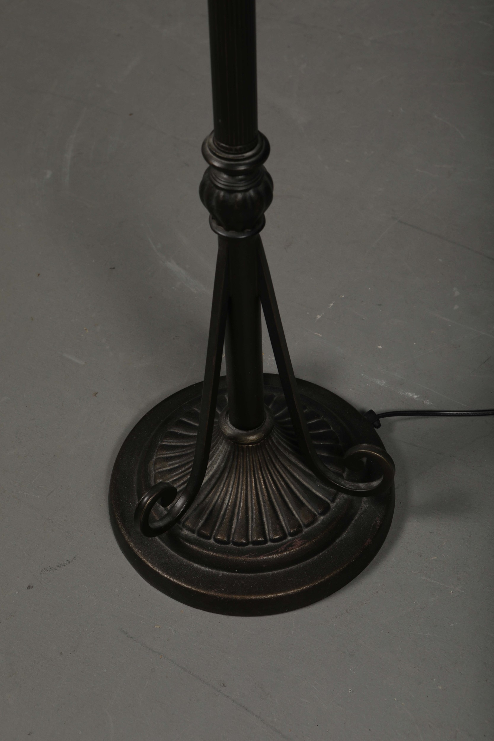 TIFFANY STYLE FLOOR LAMP. the glass shade in a symmetrical stylised foliage design, raised on a scrolled bronzed base, 155cm high.