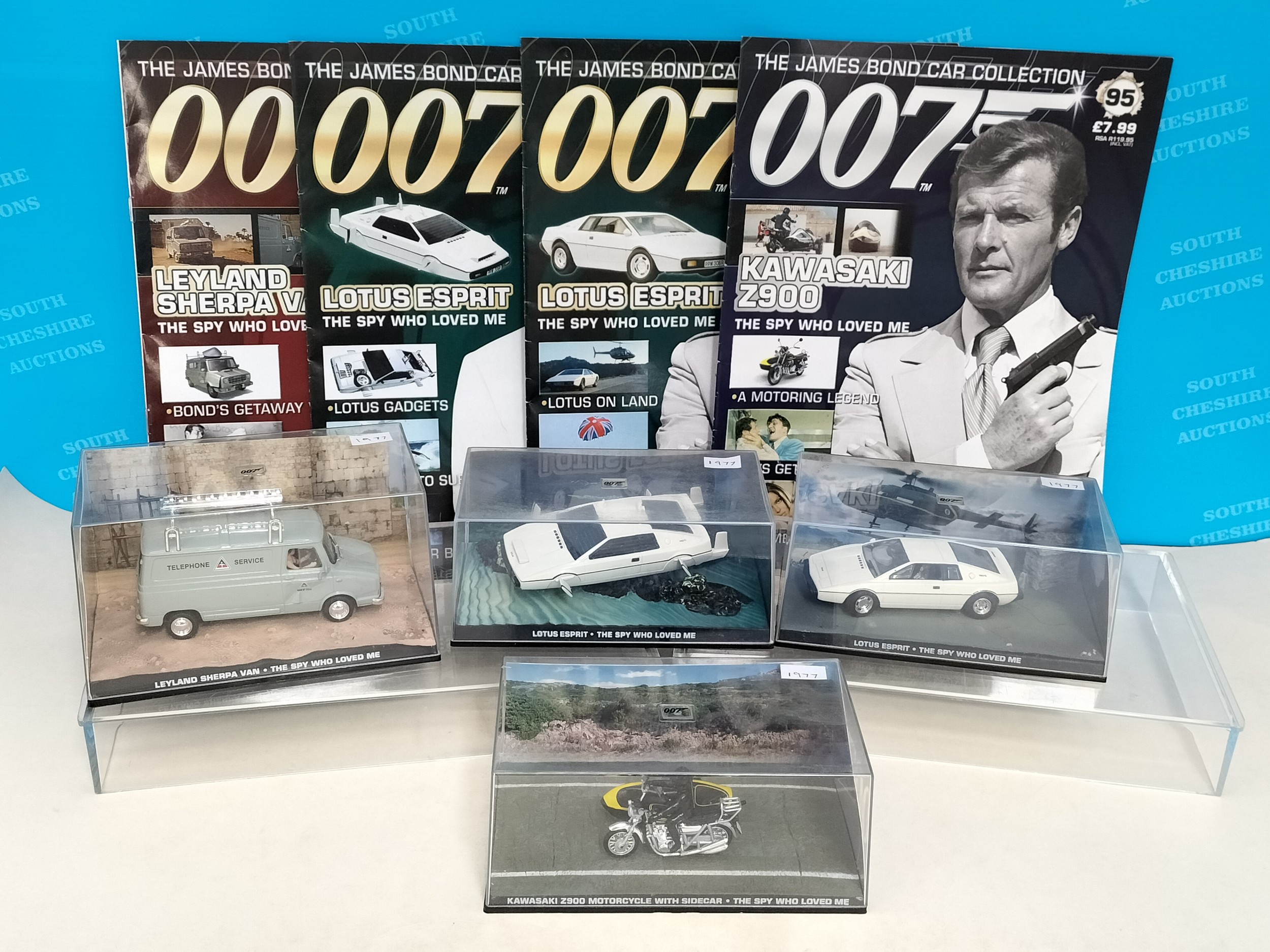 Eaglemoss James Bond 007 Cased Die-Cast Vehicles (4) with Magazines to include 1977 'The Spy Who Loved Me' Lotus Esprit Land Mode, Leyland Sherpa Van, Lotus Esprit Sea Mode plus Kawasaki Z900 Motorcycle and Sidecar.
