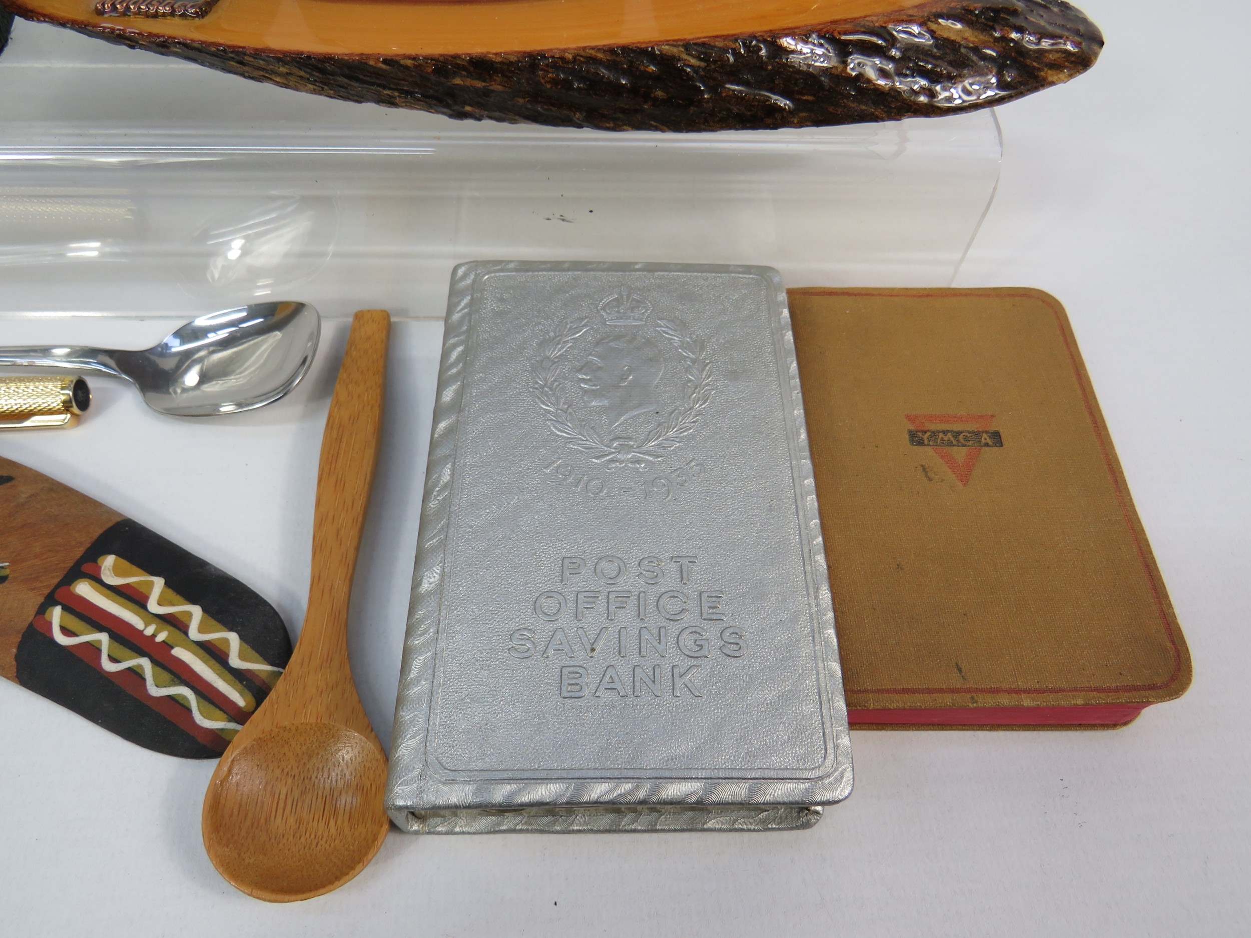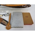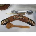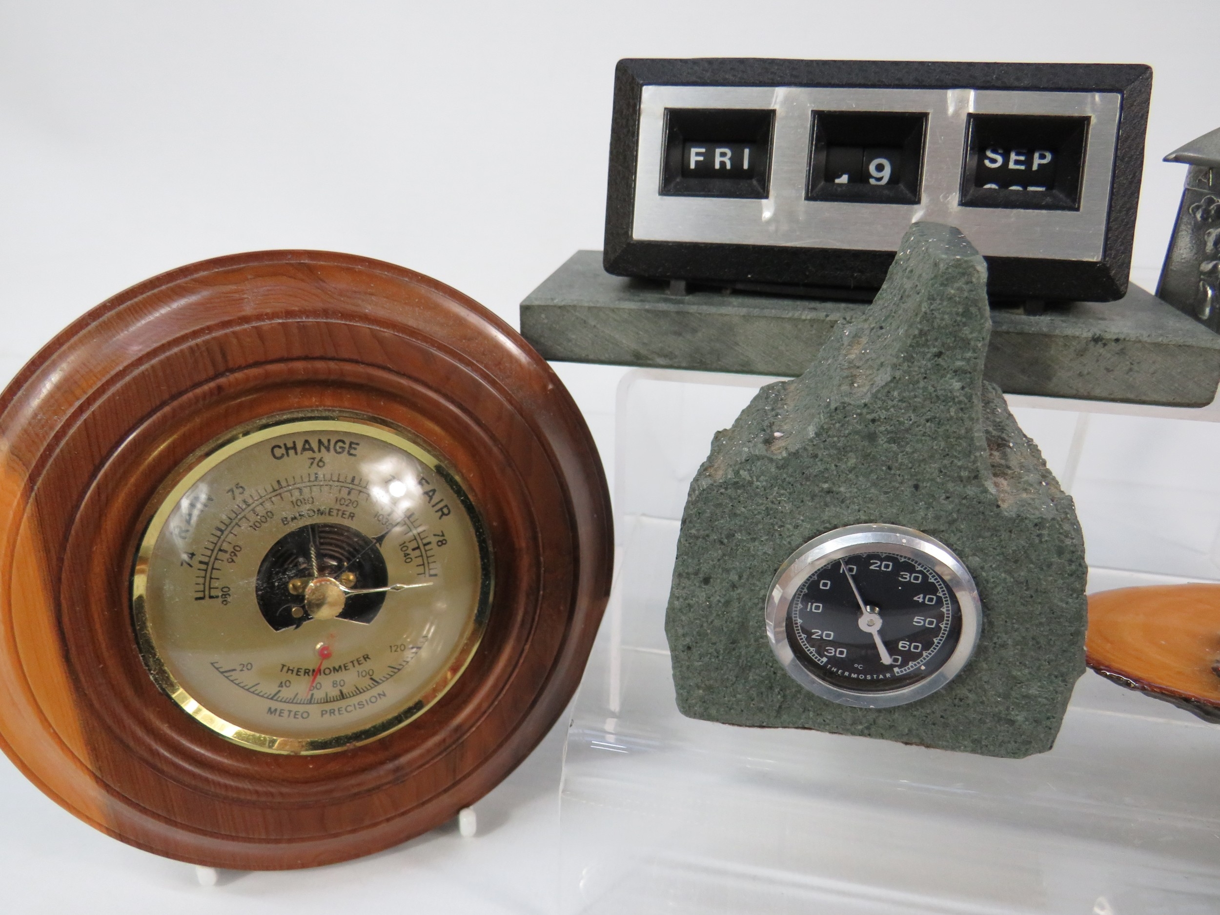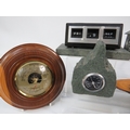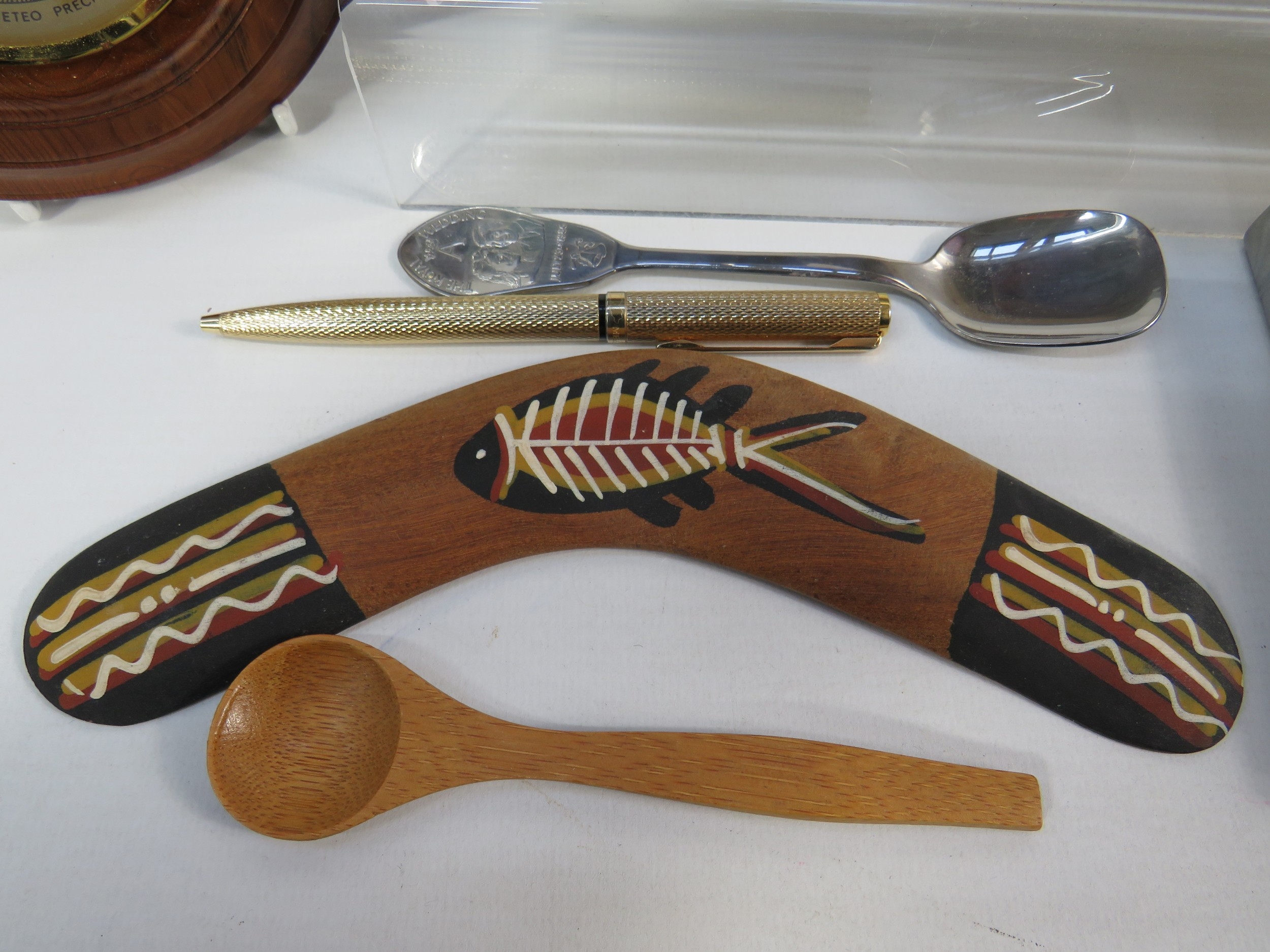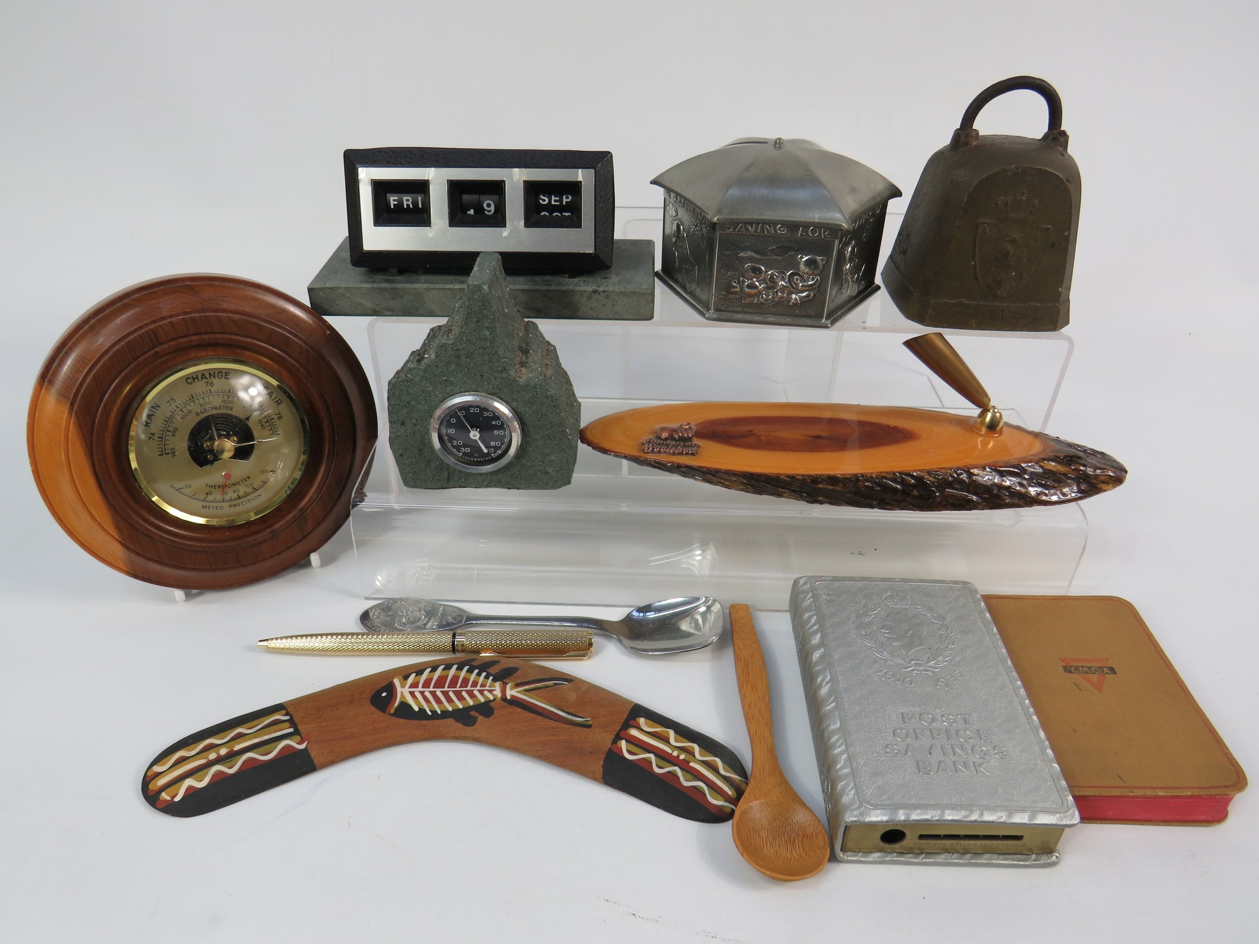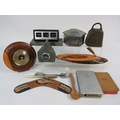 Collection of vintage and decorative items including a wooden barometer in circular turned frame showing aneroid mechanism, Art Deco-style green marble or slate desk clock with thermometer, perpetual calendar in modernist black and white design, hexagonal pewter tea caddy with engraved decoration, cast iron doorstop or weight, carved wooden letter holder or desk tidy with natural bark edge, Aboriginal-style painted boomerang, cigarette cases, decorative pens, and various desk accessories. Approximately 12-15 mixed items showing varied periods from Art Deco to mid-century modern. A diverse lot for collectors of desk items and decorative accessories.