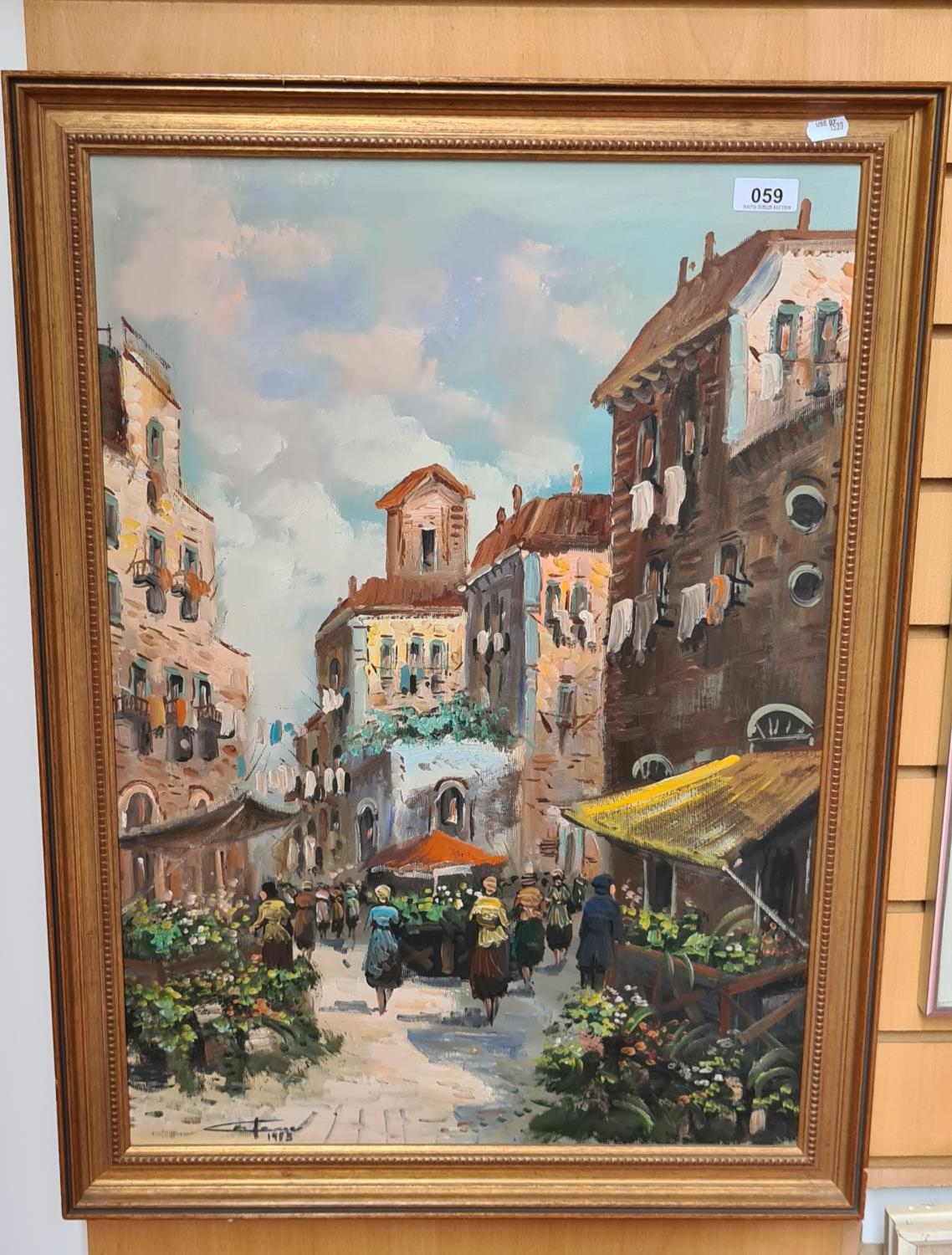Large oil in canvas Of a Street scene dated 1983 but signature not clear.