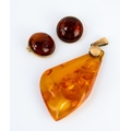 LARGE GOLDEN TRANSLUCENT AMBER PENDANT; and a PAIR OF GOLD-PLATED CLIP EARRINGS, each set with a circular cabochon golden amber (3)