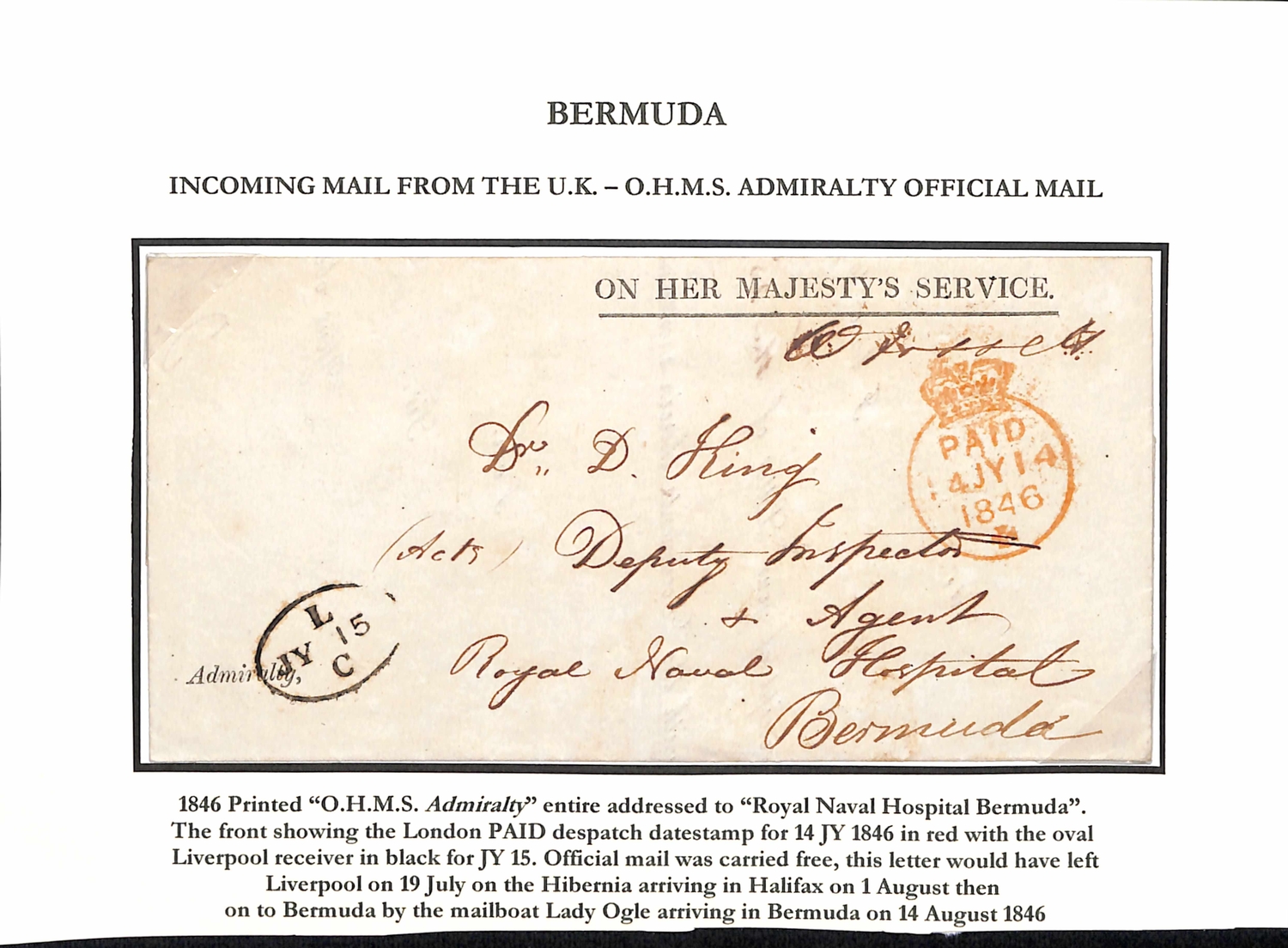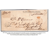 1846 (July 14) Printed O.H.M.S Admiralty entire letter to "Dr D. King, Acting Deputy Inspector & Agent, Royal Naval Hospital, Bermuda" with red crowned Paid datestamp and oval transit datestamp of Liverpool. Carried on the "Hibernia" to Halifax and then by the "Lady Ogle". Very unusual.