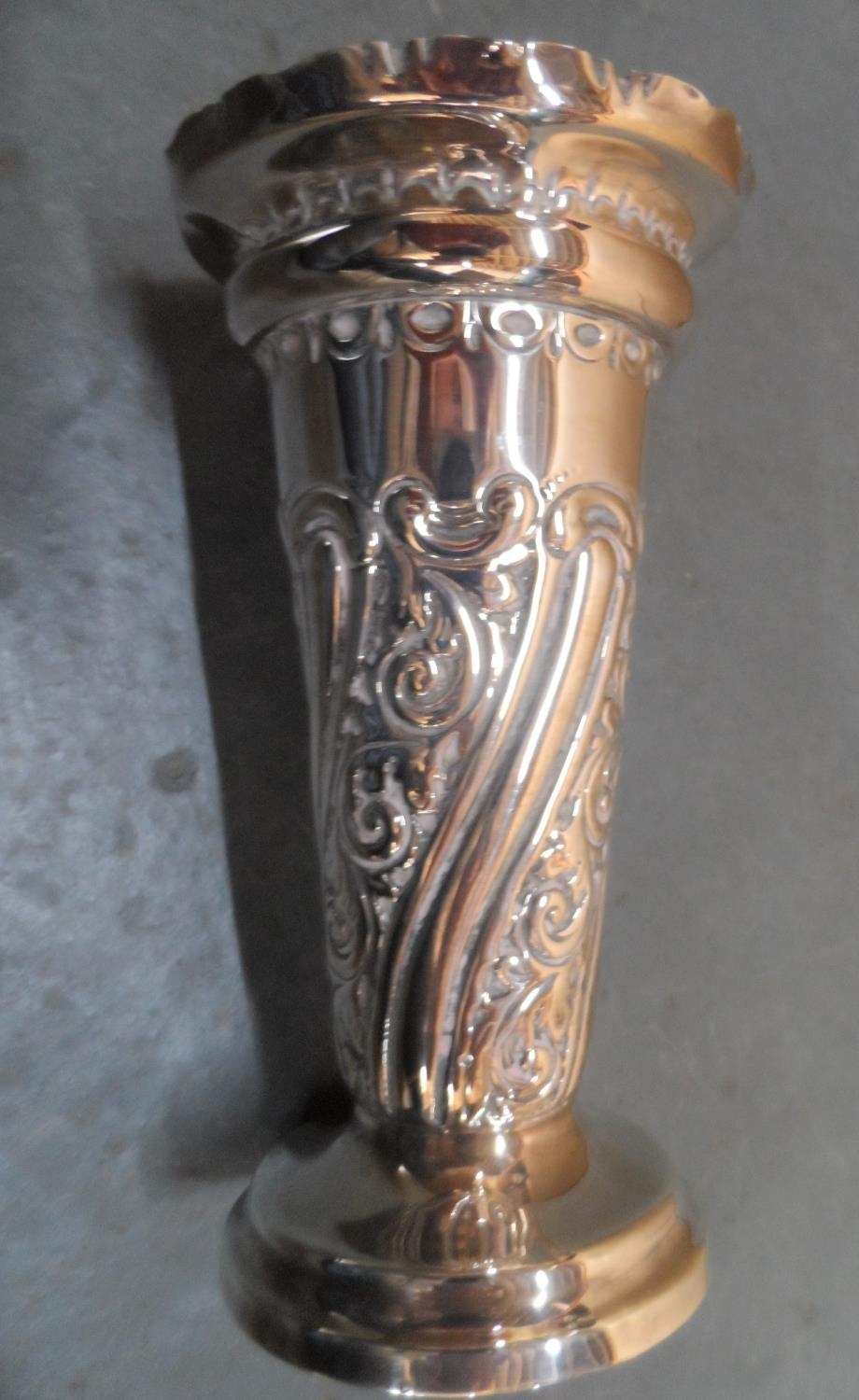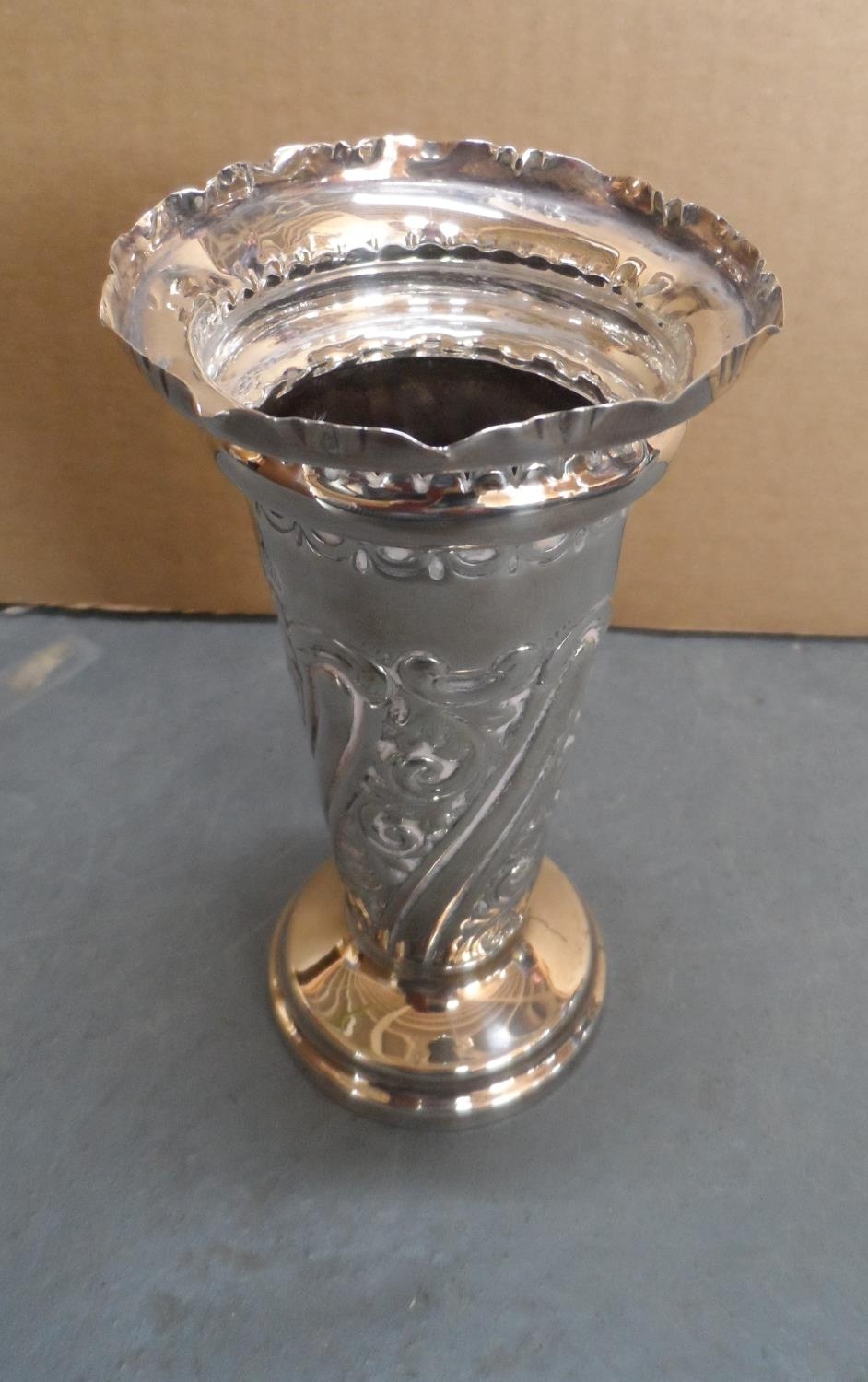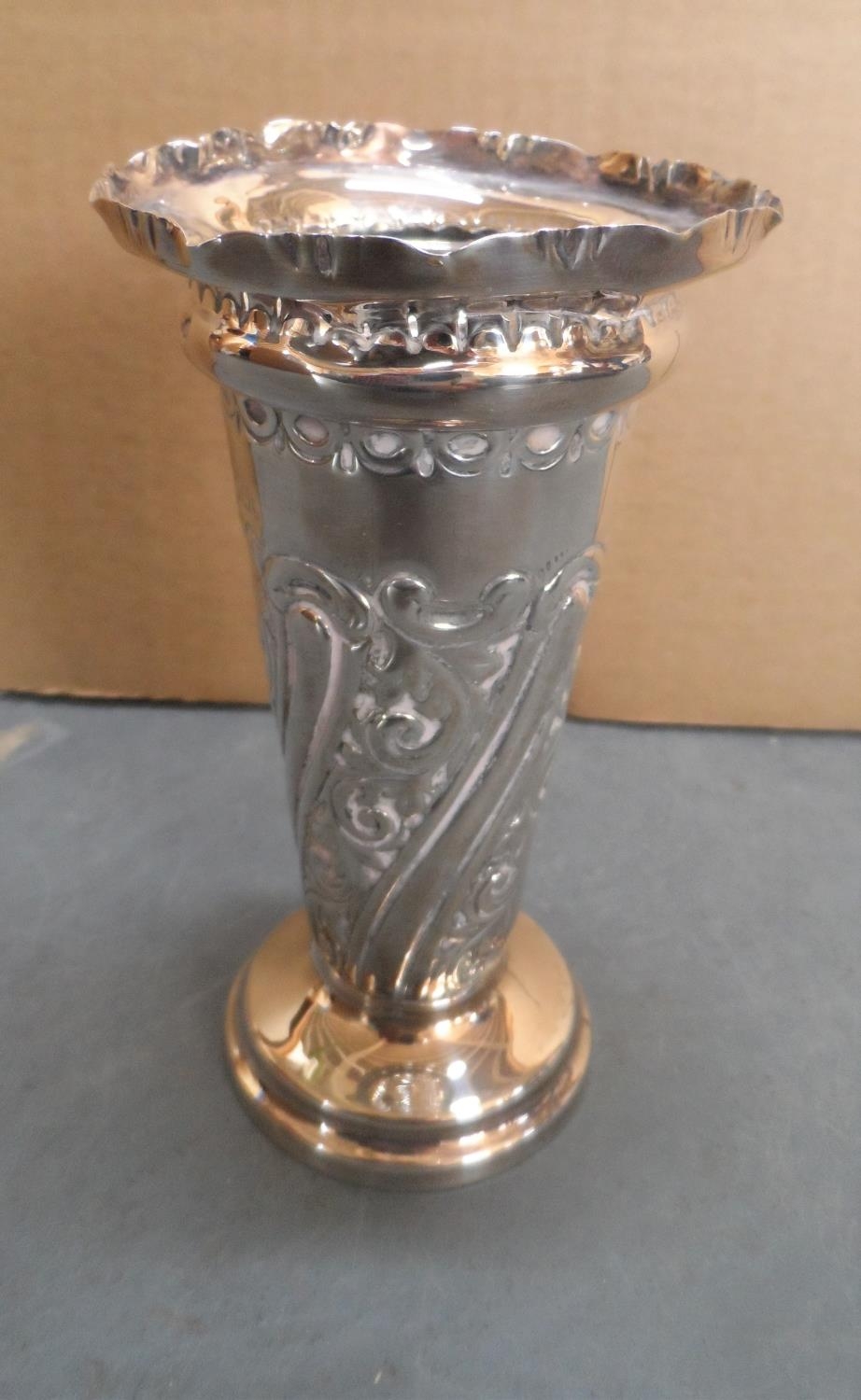 Wide bodied antique silver bud vase with weighted base,