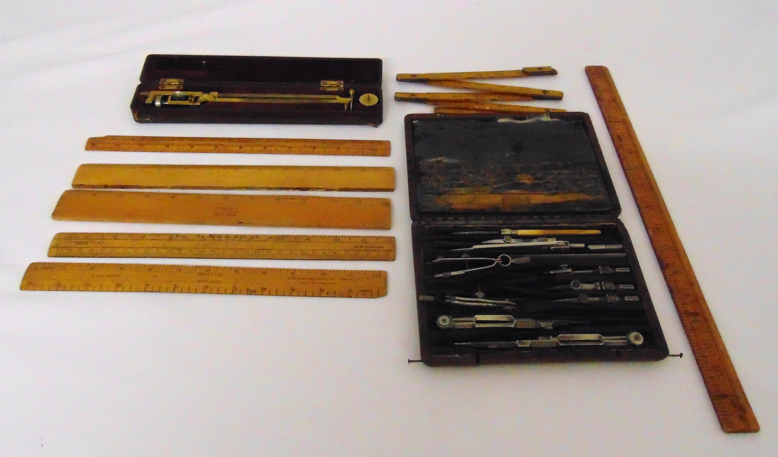 Victorian TB Winter cased planimeter and cased AG Thornton drawing instruments, together with Rabone and other boxwood wooden rulers