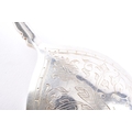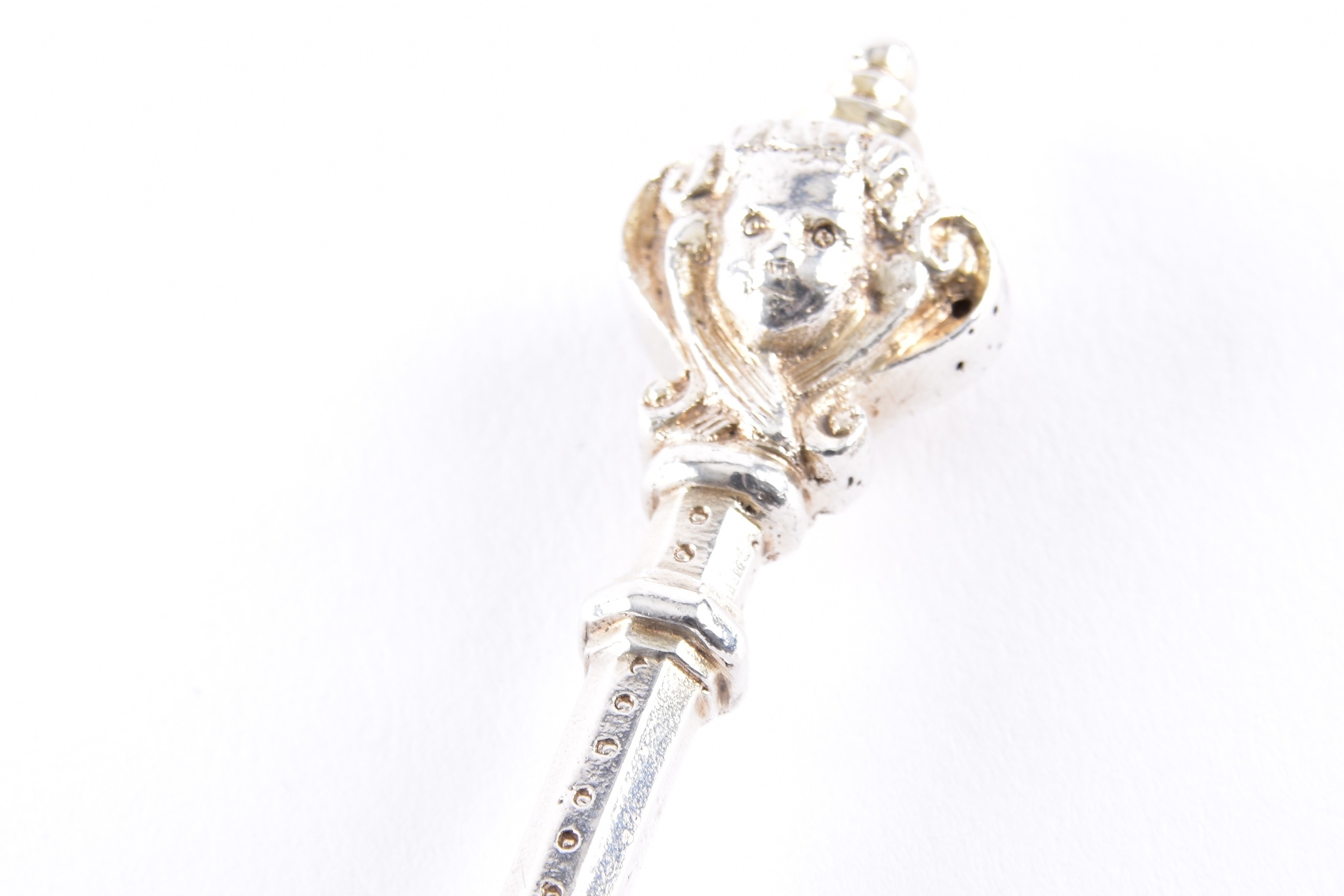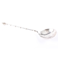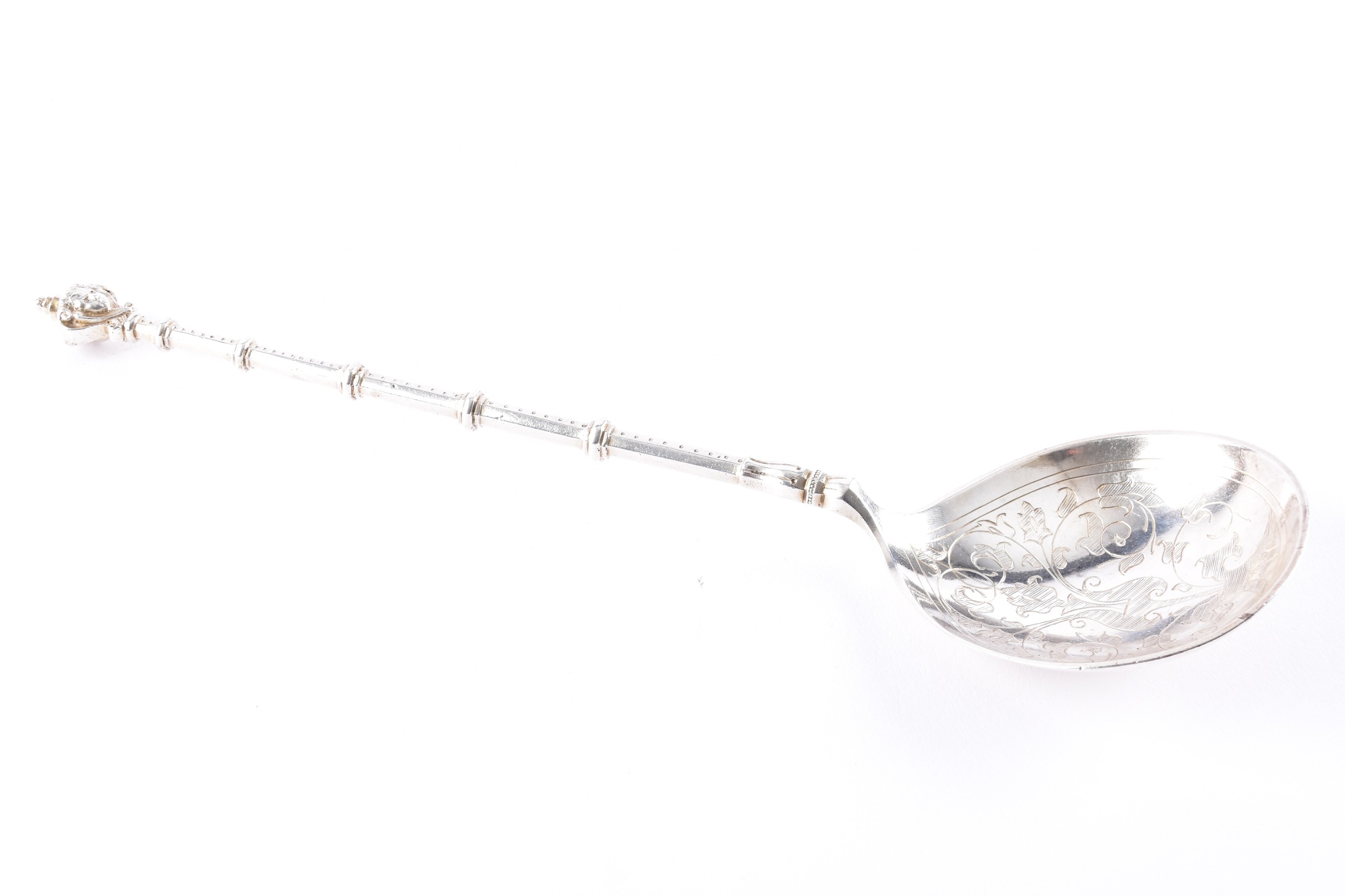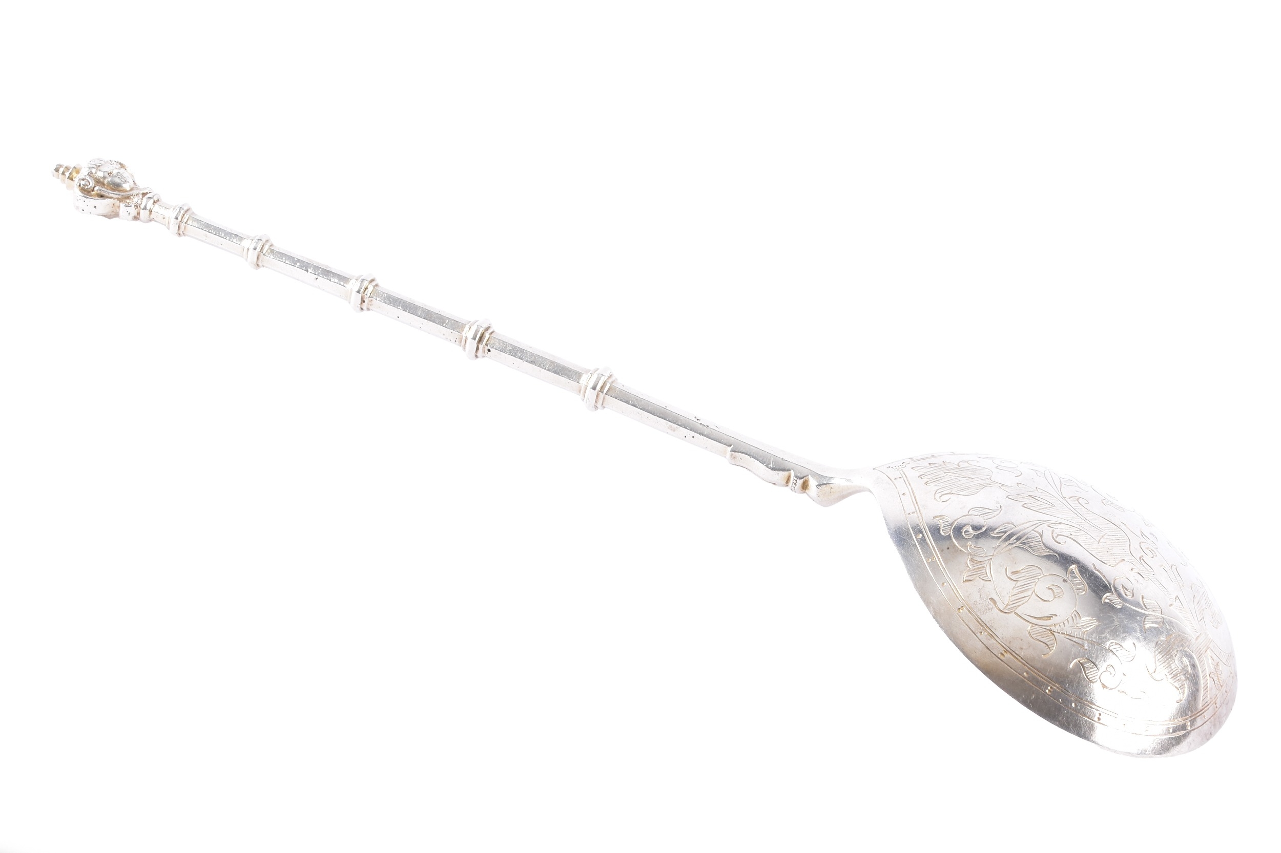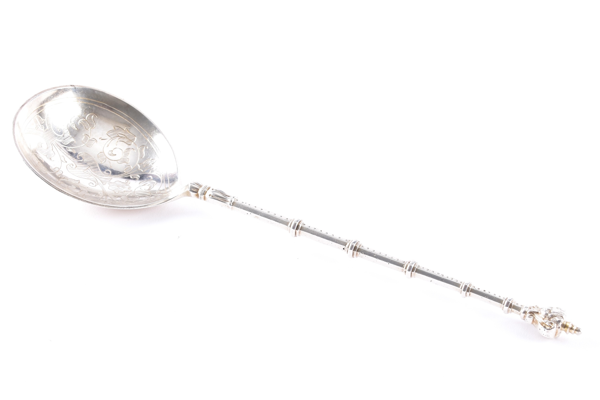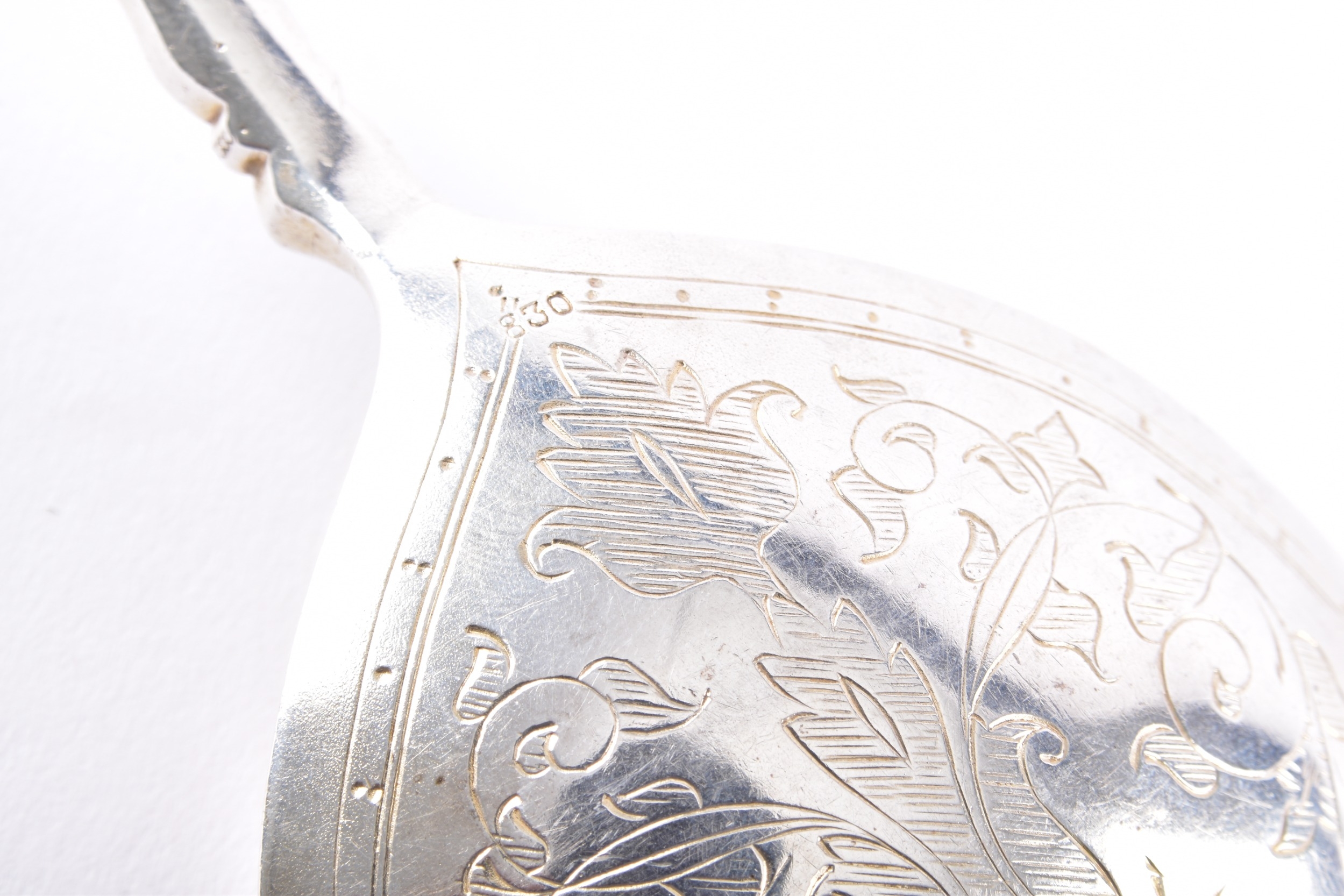 A late 18th/early 19th century Swedish spoon, the bowl finely engraved with foliate scrollwork and stylised floral motifs, the reverse similarly decorated, the slender tapering handle is punctuated with knop divisions and beaded detailing, terminating in a finial formed as a stylised cherub's face, 23 cm long, marked '830' to base of bowl.