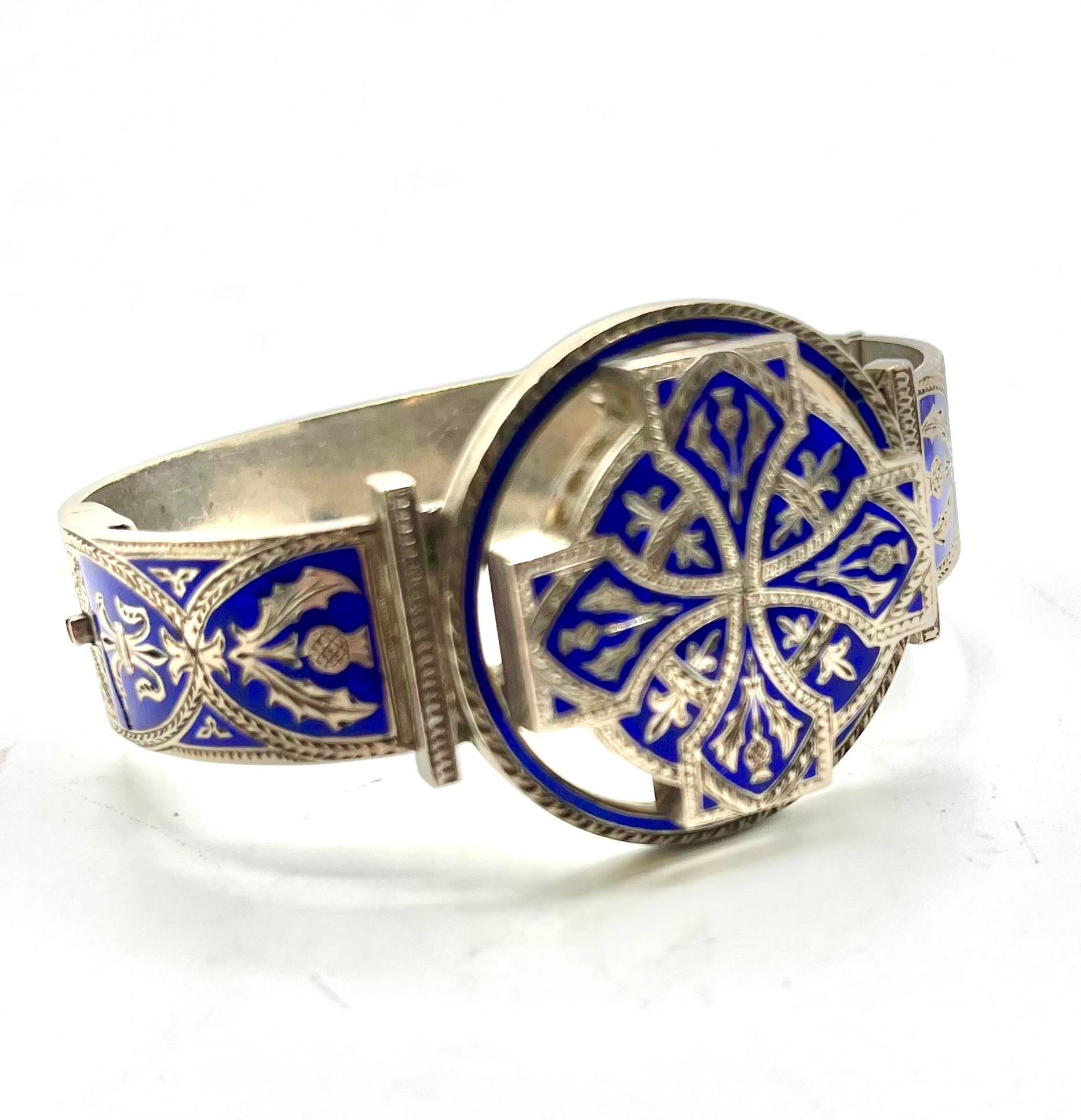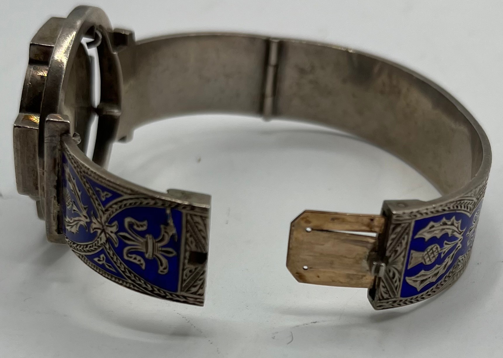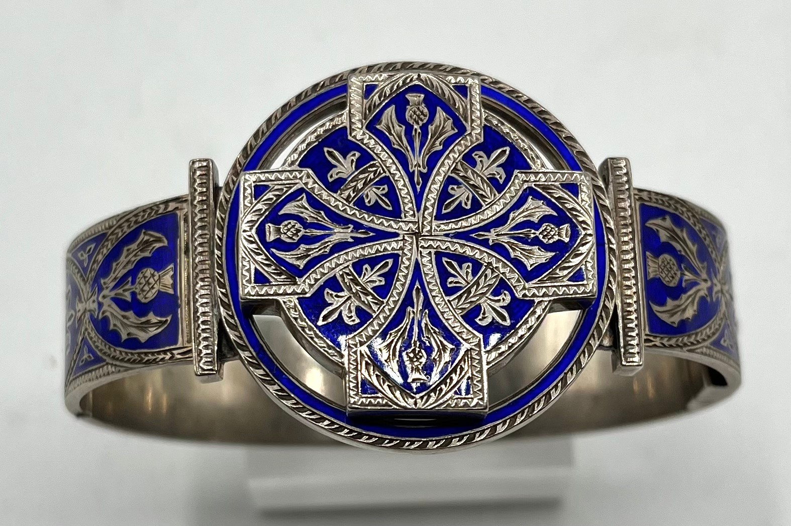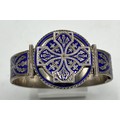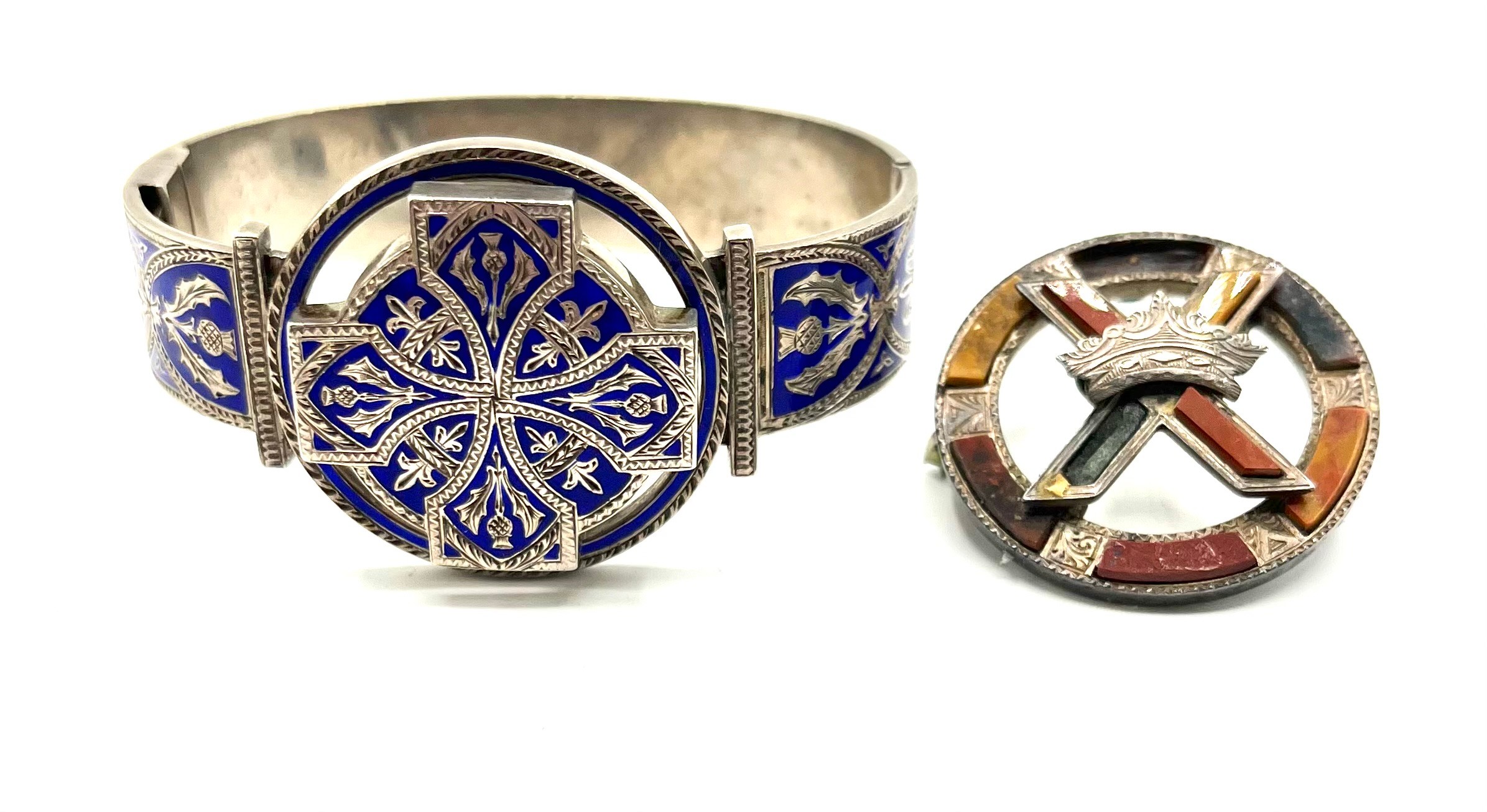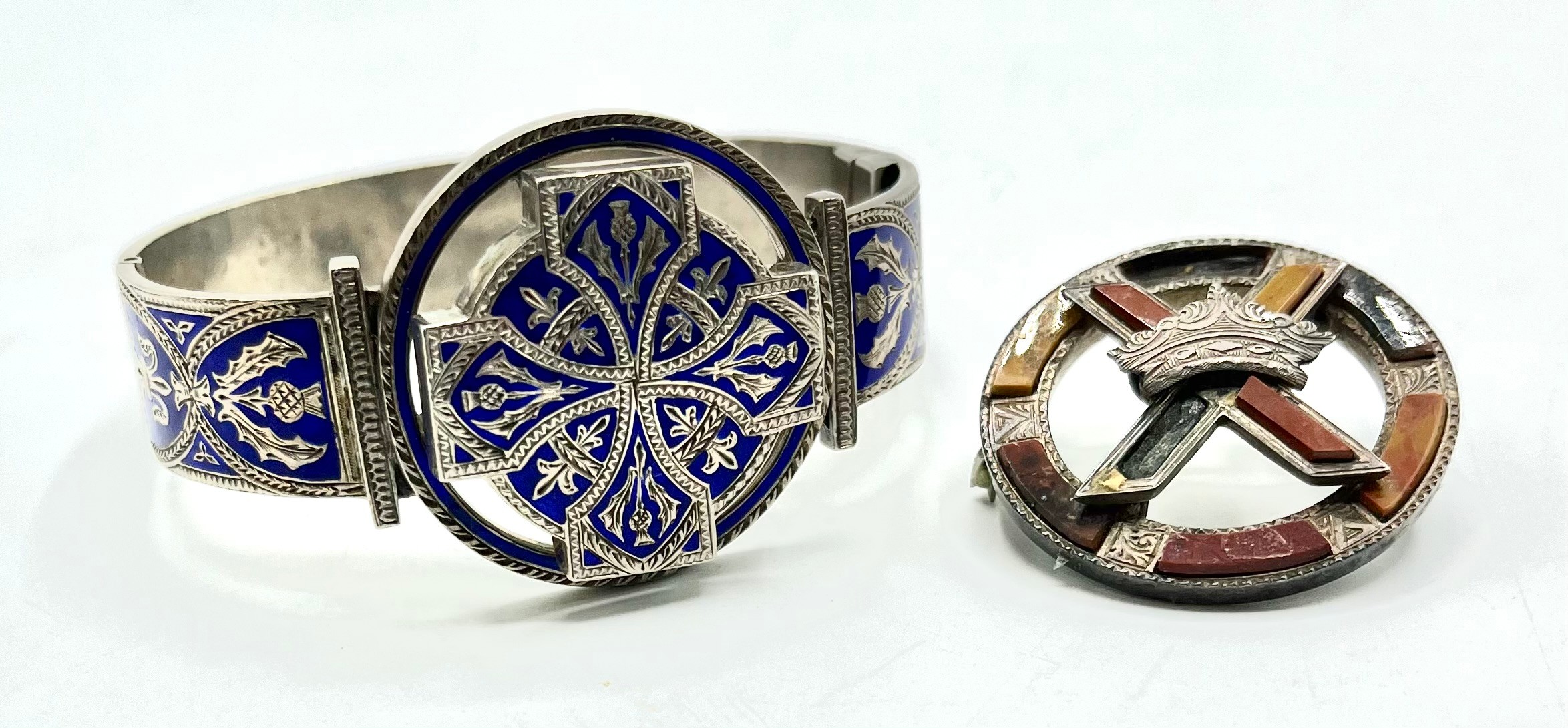 An unmarked white metal bangle bracelet, blue enameled with Celtic motif and thistle decoration together with a hardstone Scottish brooch (loss and pin needs replace).