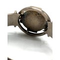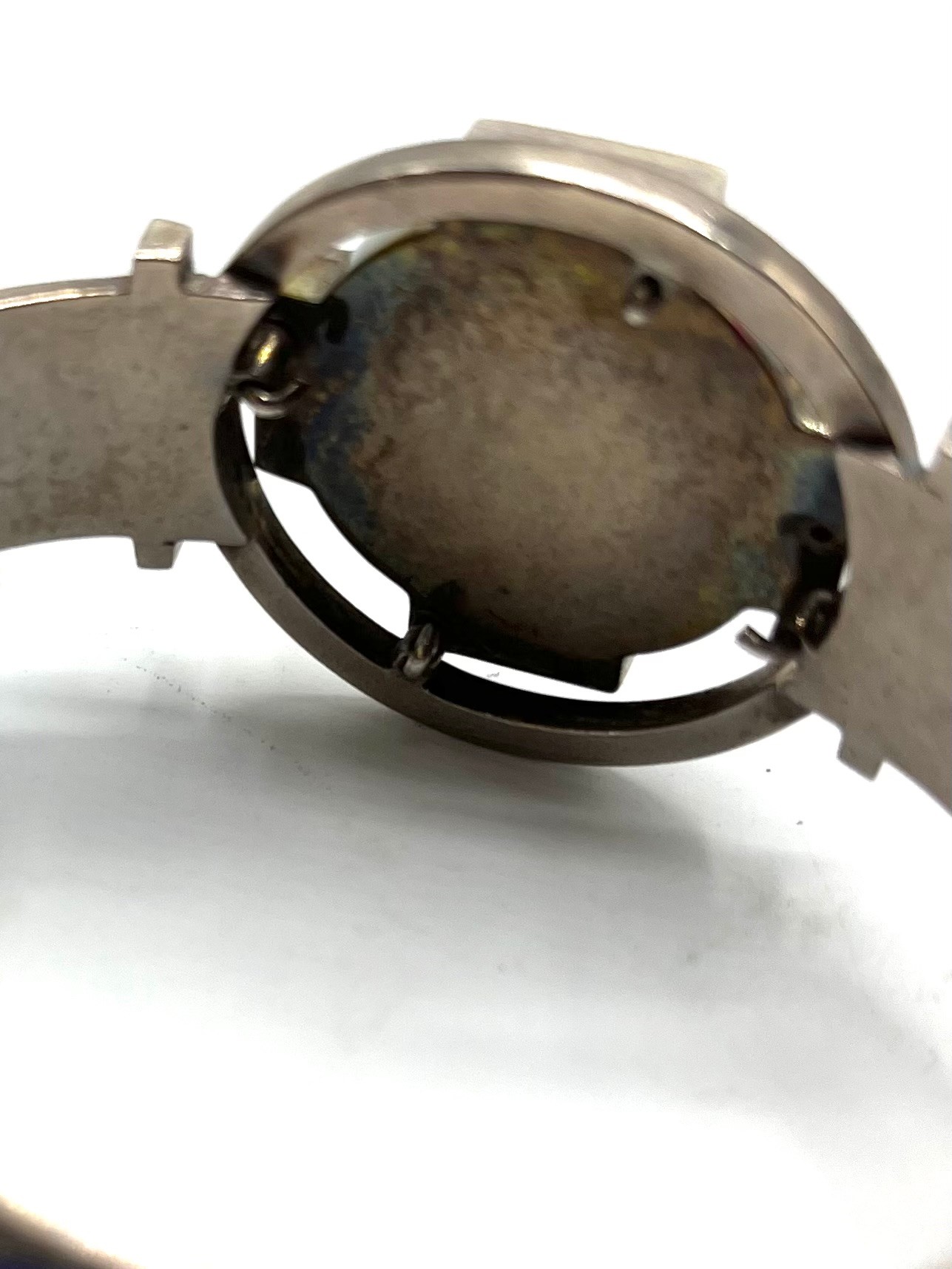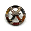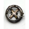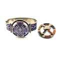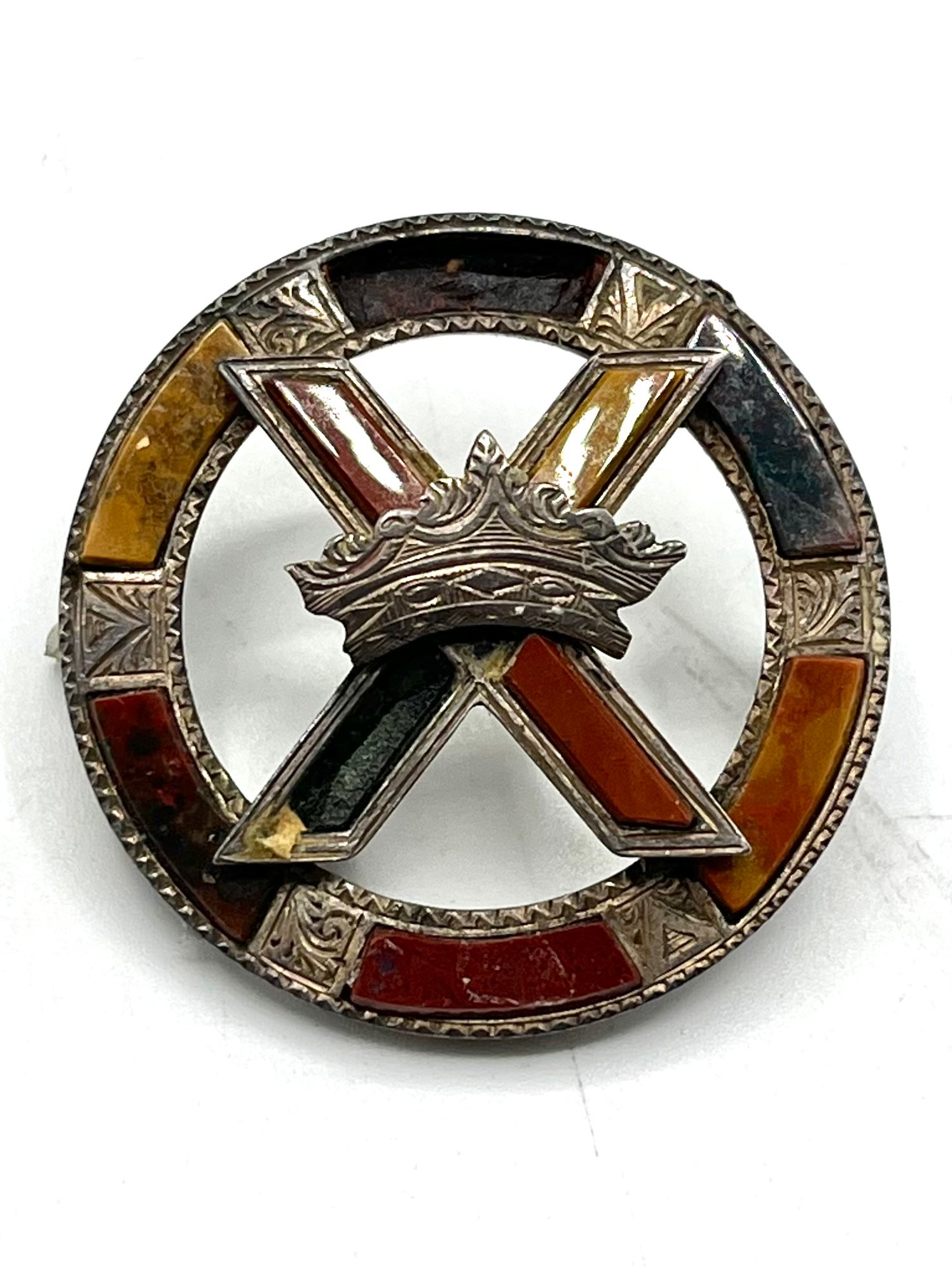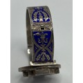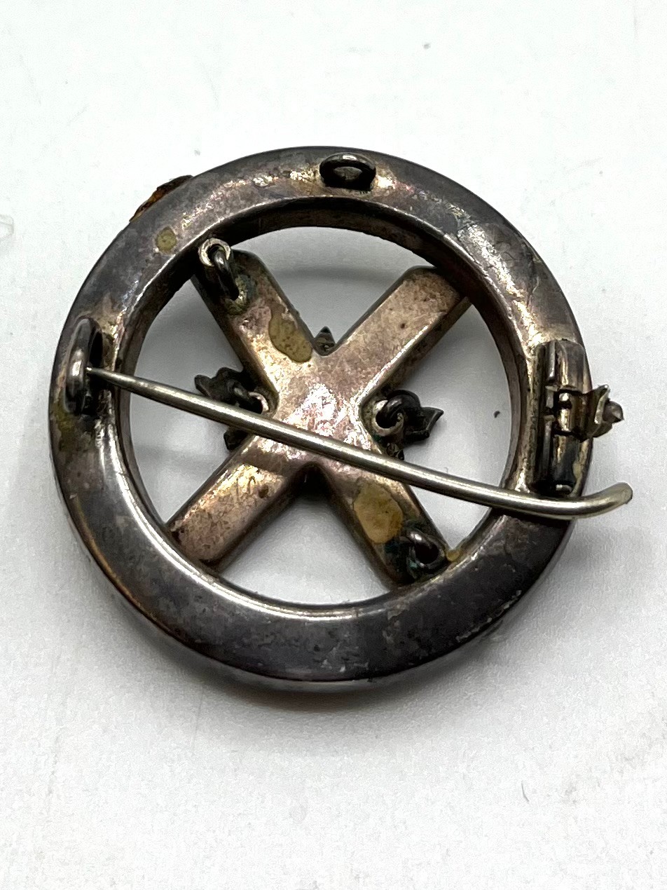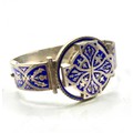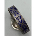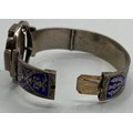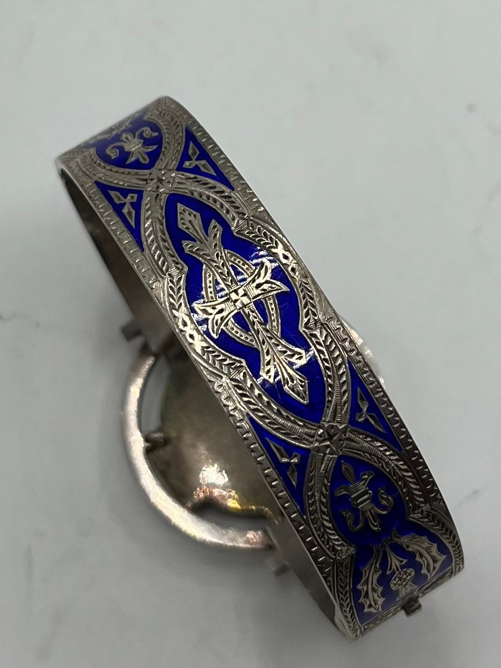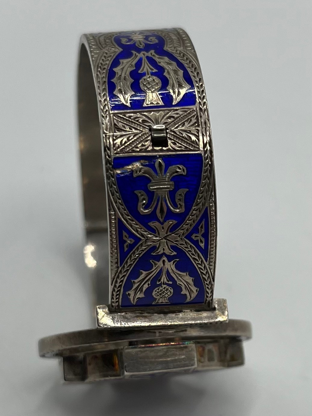An unmarked white metal bangle bracelet, blue enameled with Celtic motif and thistle decoration together with a hardstone Scottish brooch (loss and pin needs replace).