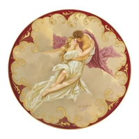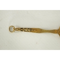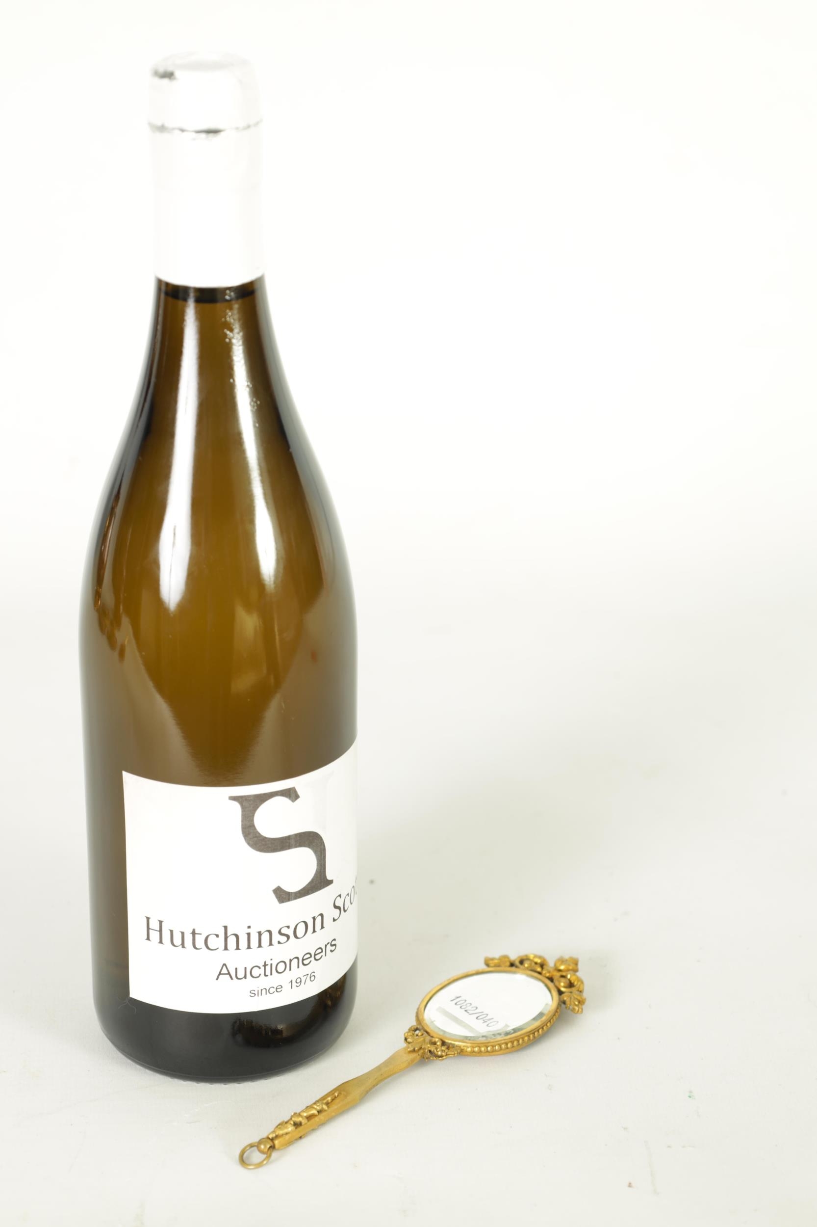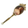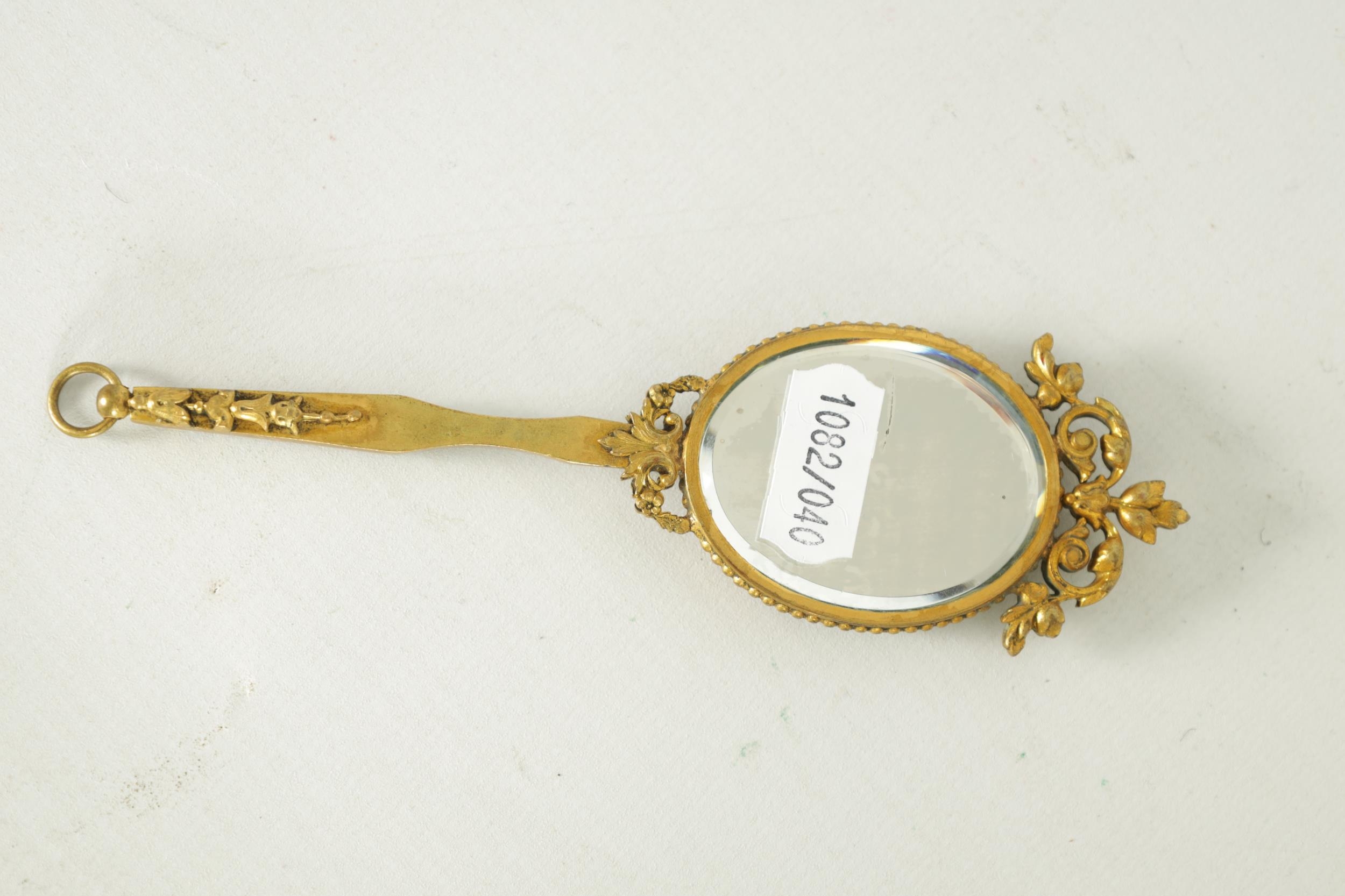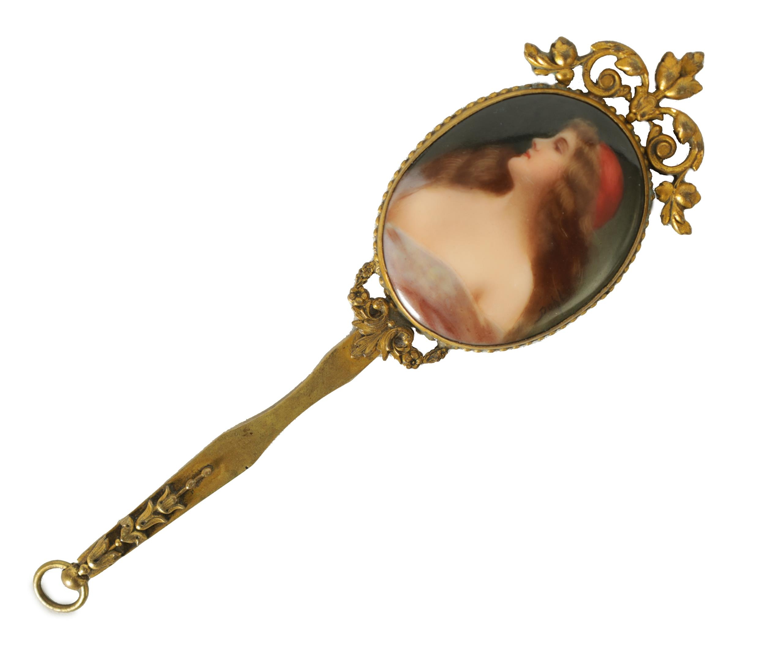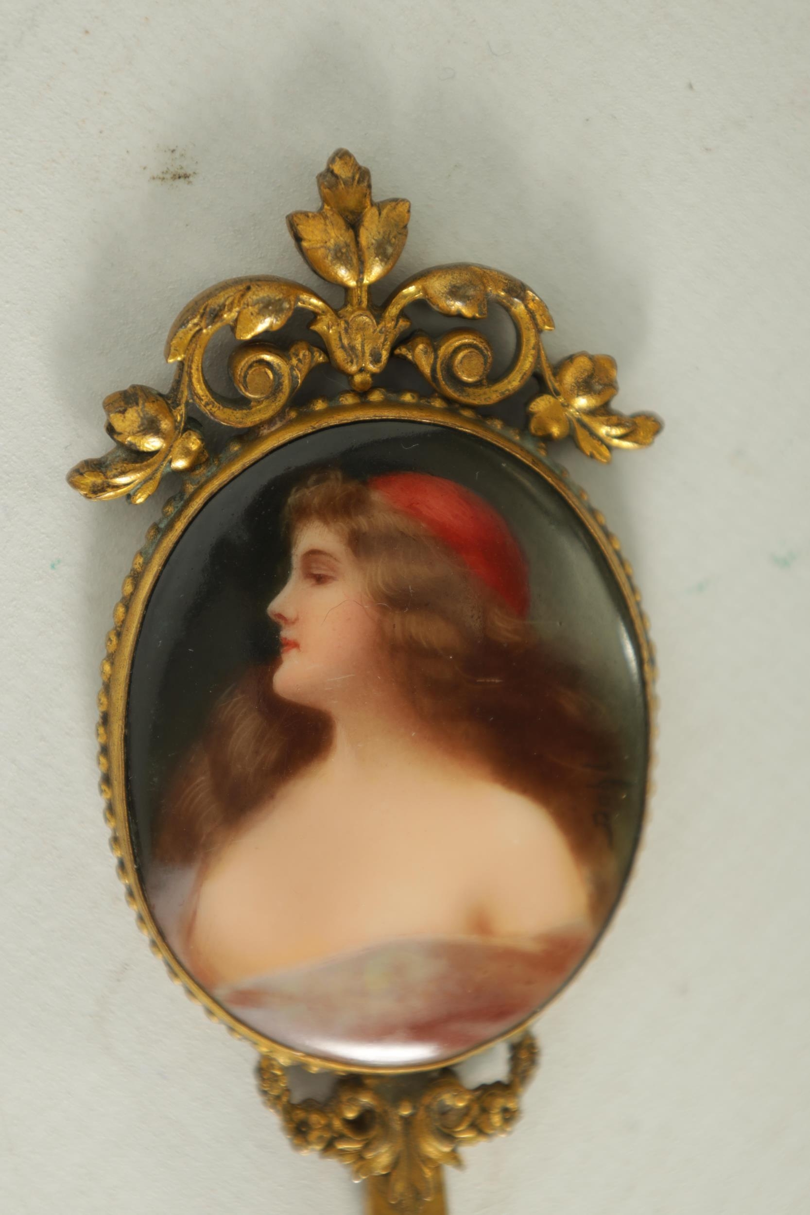 A LATE 19TH CENTURY VIENNA PORCELAIN AND GILT METAL MINIATURE HAND MIRROR the oval convex plaque painted with a side bust portrait of a young lady wearing red head dress, the decorative frame with pierced scrolled cresting and leafwork handle reversed by a bevelled mirror. (14.5cm overall panel 4.75cm high 3.75cm wide)