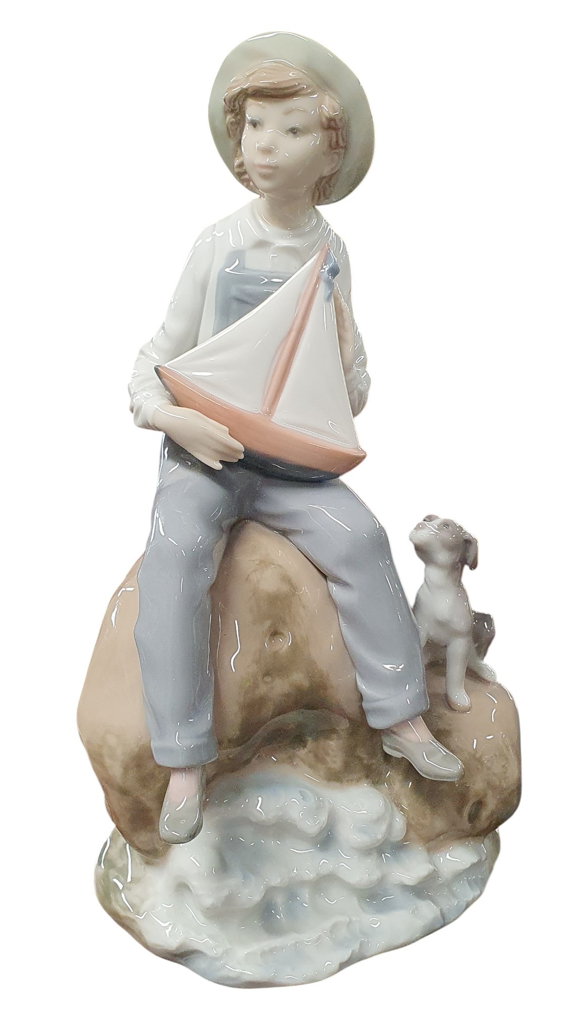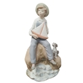 A Lladro Figure of a boy with a sailing boat and dog. H 23 cm approx.