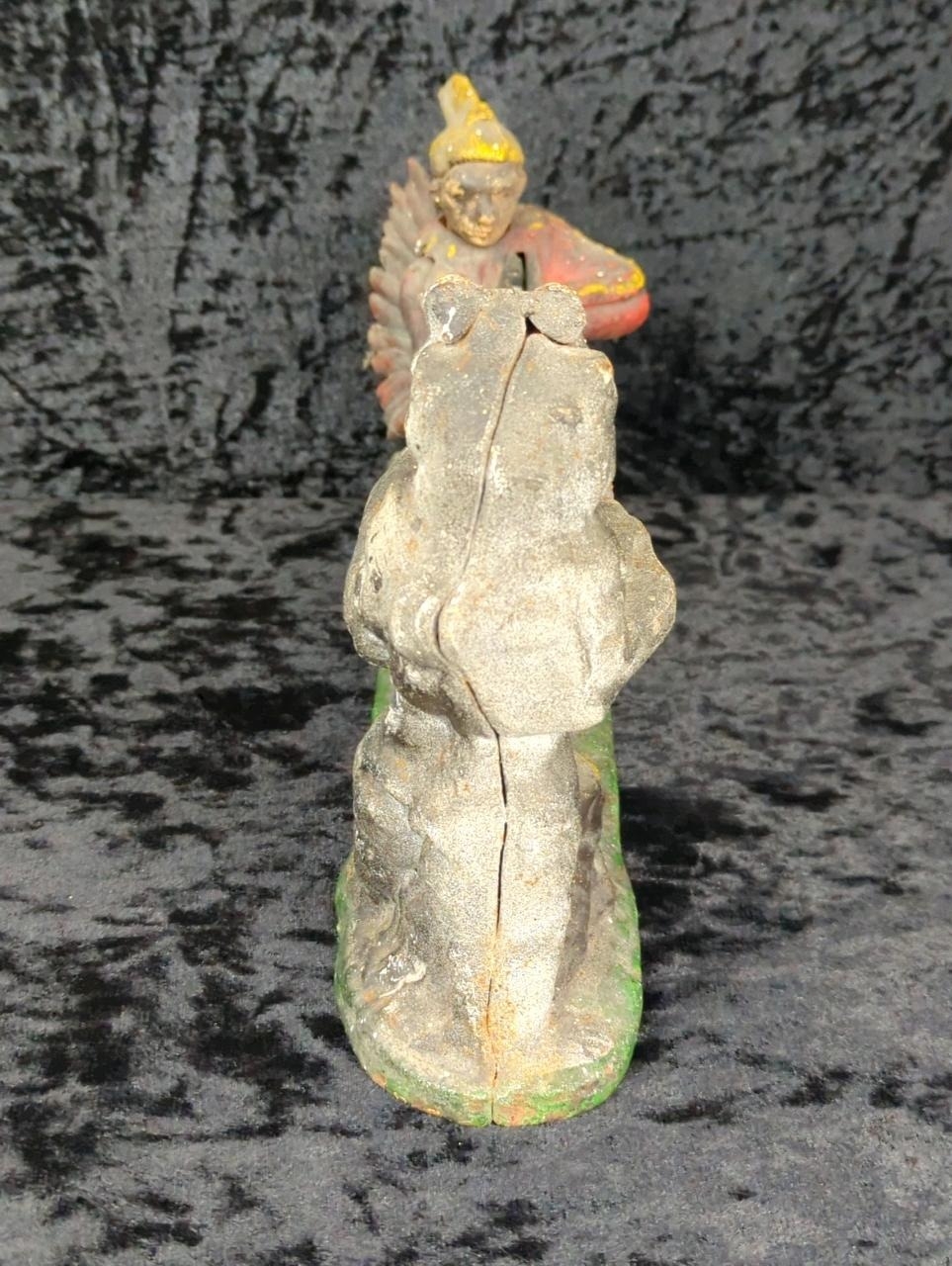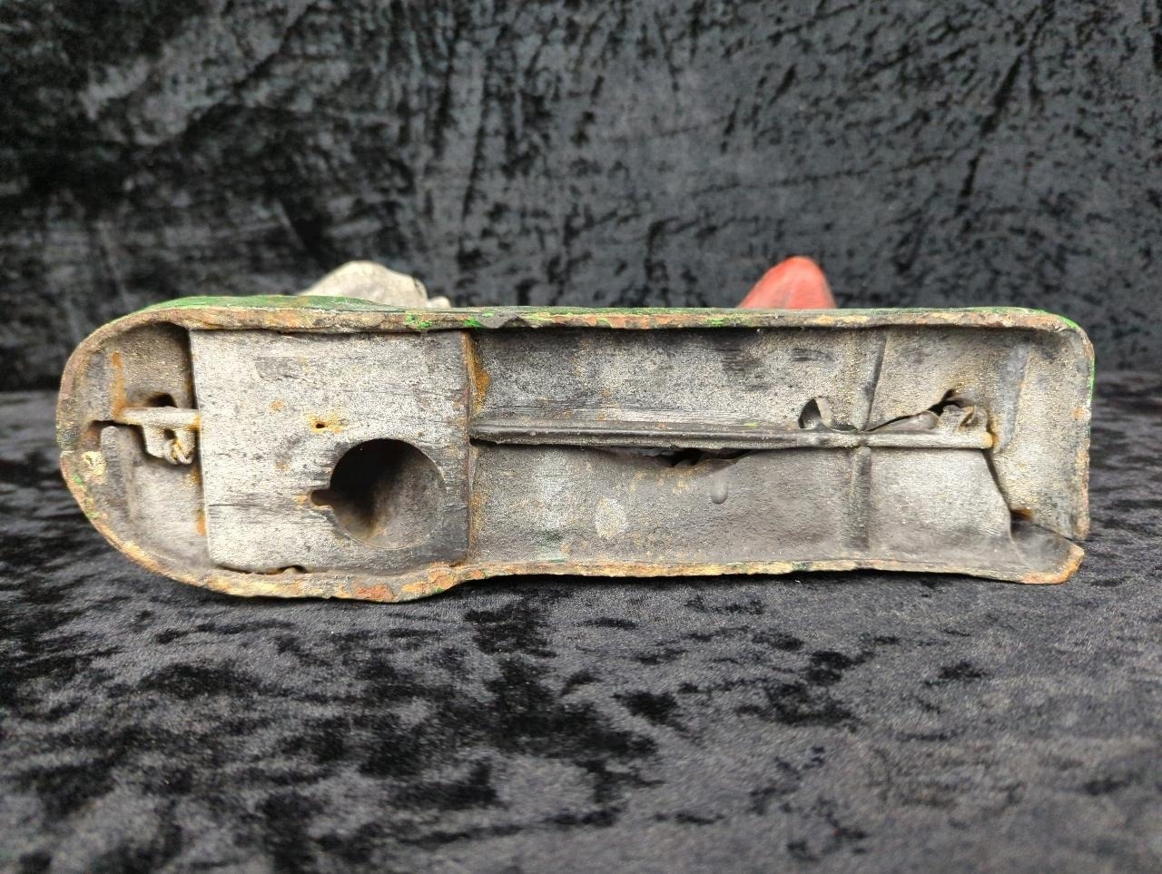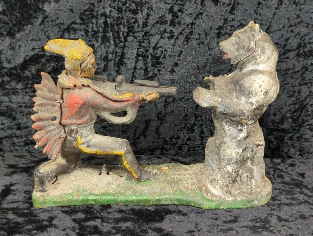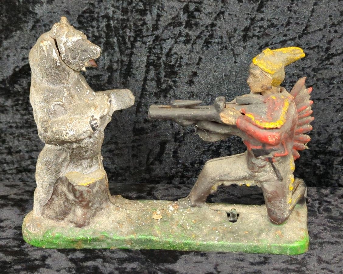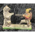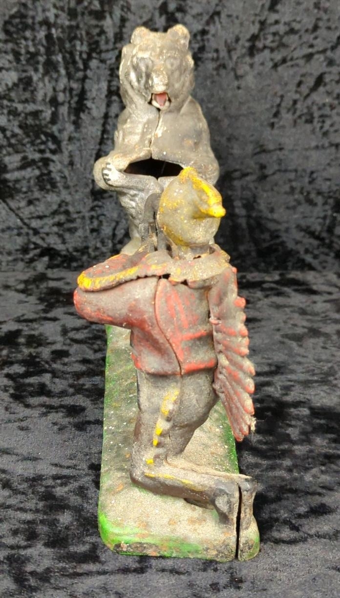 Mid-century cast iron mechanical money box - known as Indian and Bear, or Indian Shooting Bear - a replica of the original produced by the J. & E. Stevens Company of Cromwell, Connecticut, USA in the late 1880s. Approx H19 x W25cm.