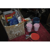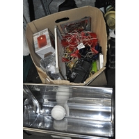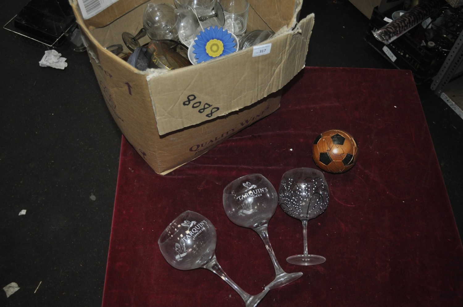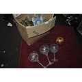 A BOX OF ASSORTED CHINA AND GLASSWARE INC GLASS DESSERT DISHES, WINE GLASSES, CHINA PLATES AND MORE
