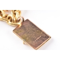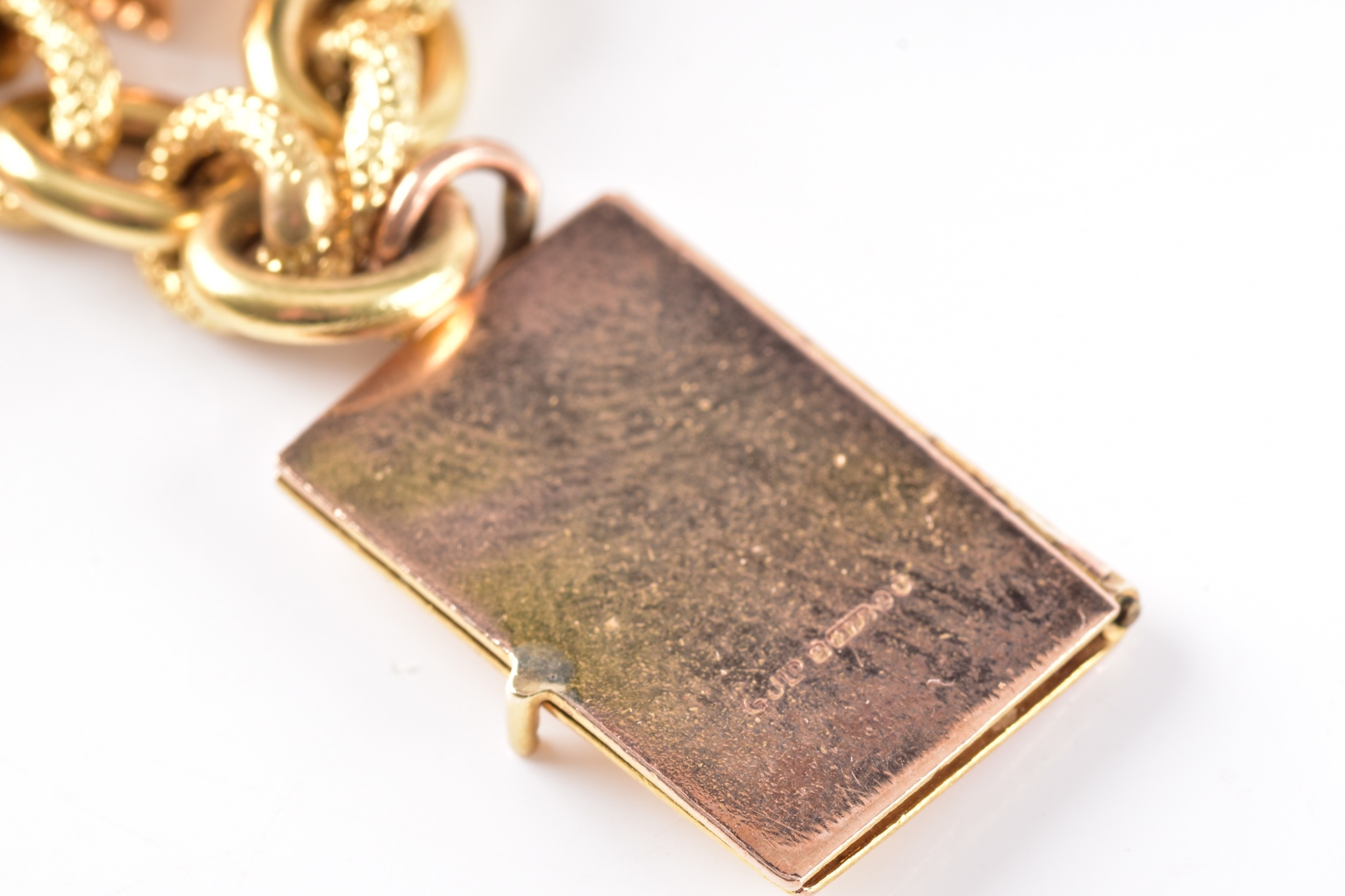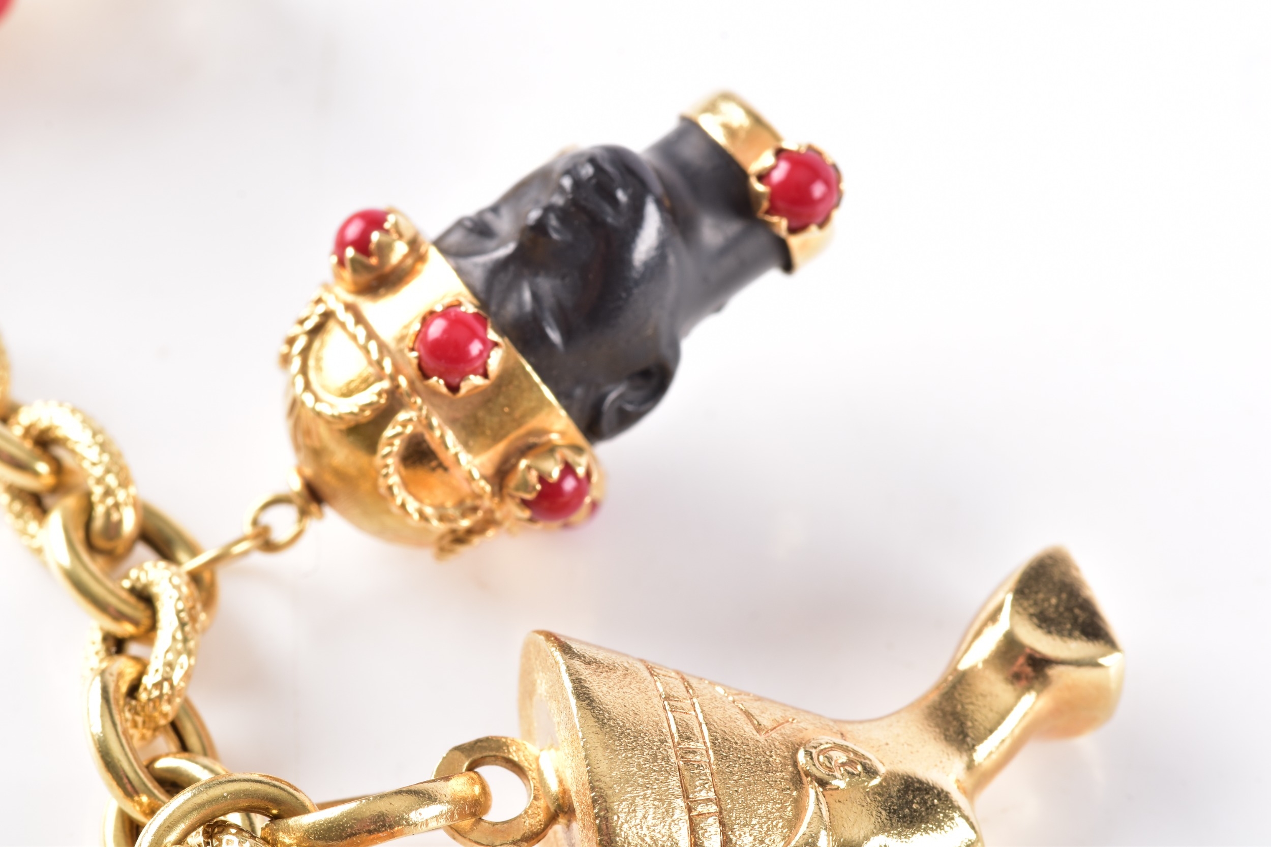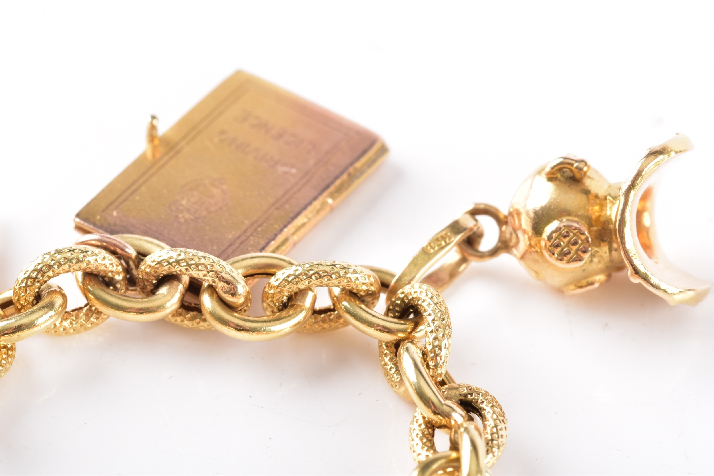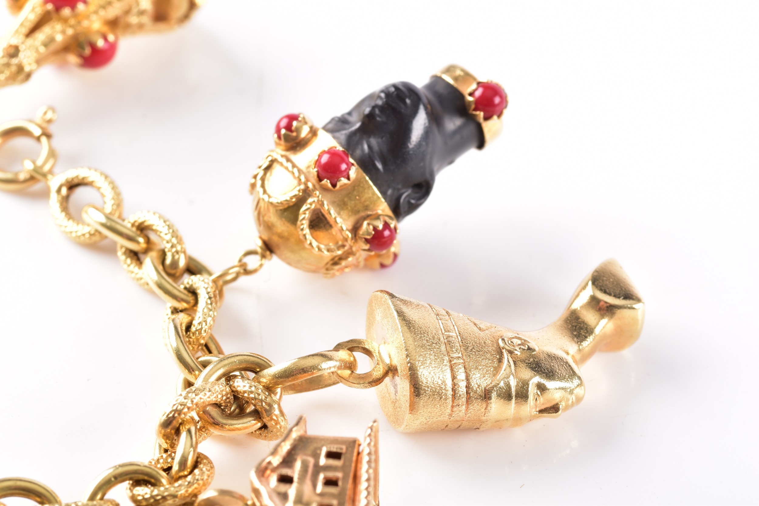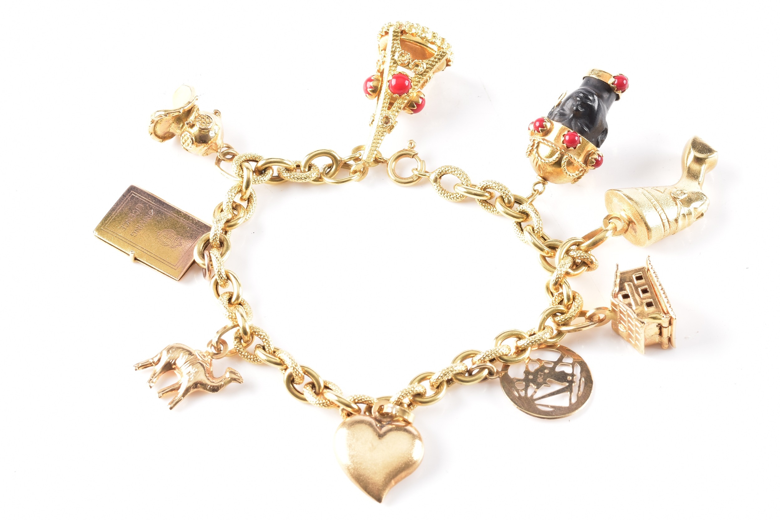 An 18ct yellow gold charm bracelet, with alternating smooth and textured links, suspended with nine charms in total, including a Blackmoor head, a Neferiti charm, a camel, house, and others including a 9ct yellow gold driving license charm and a 9ct St Christopher charm.