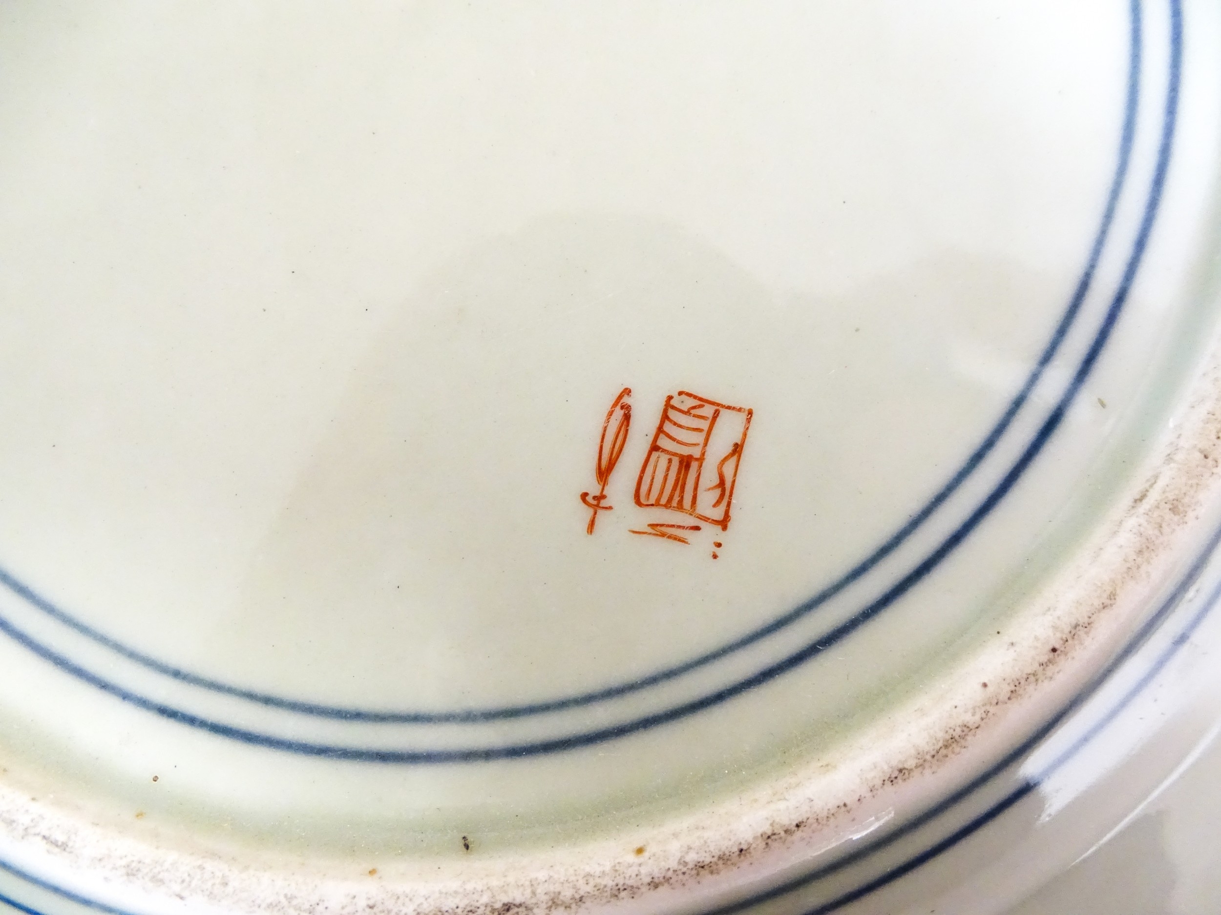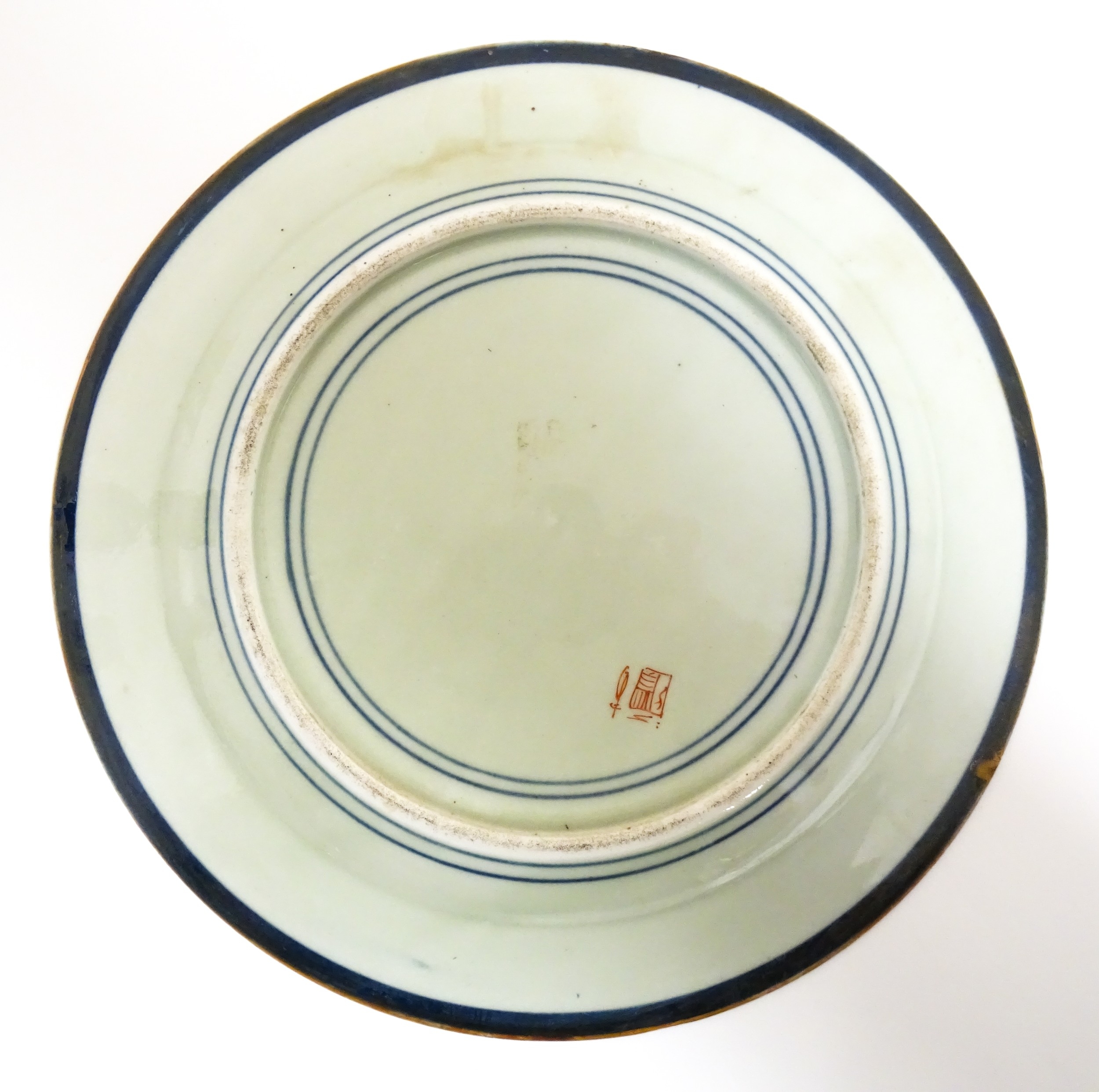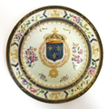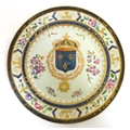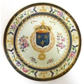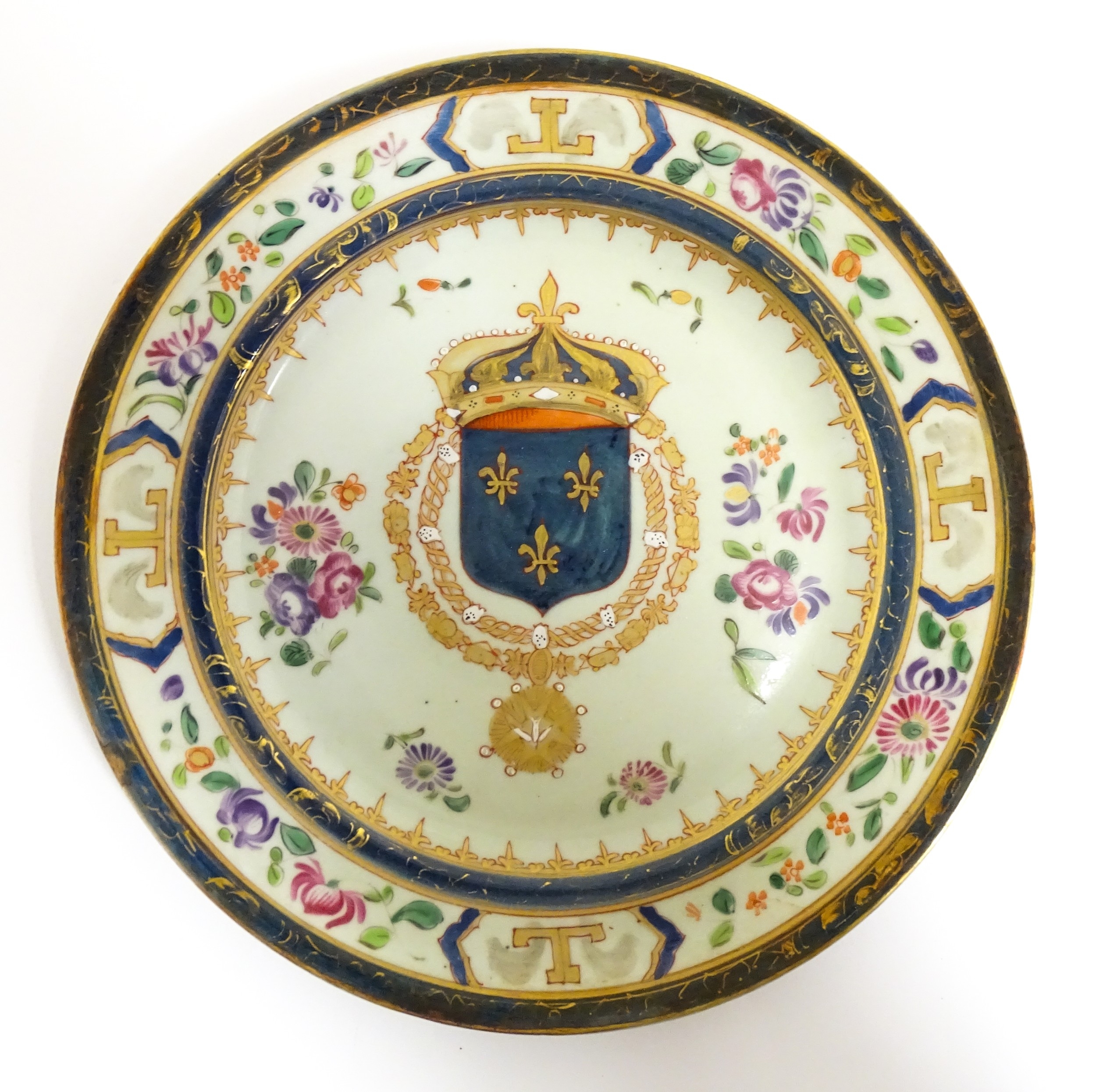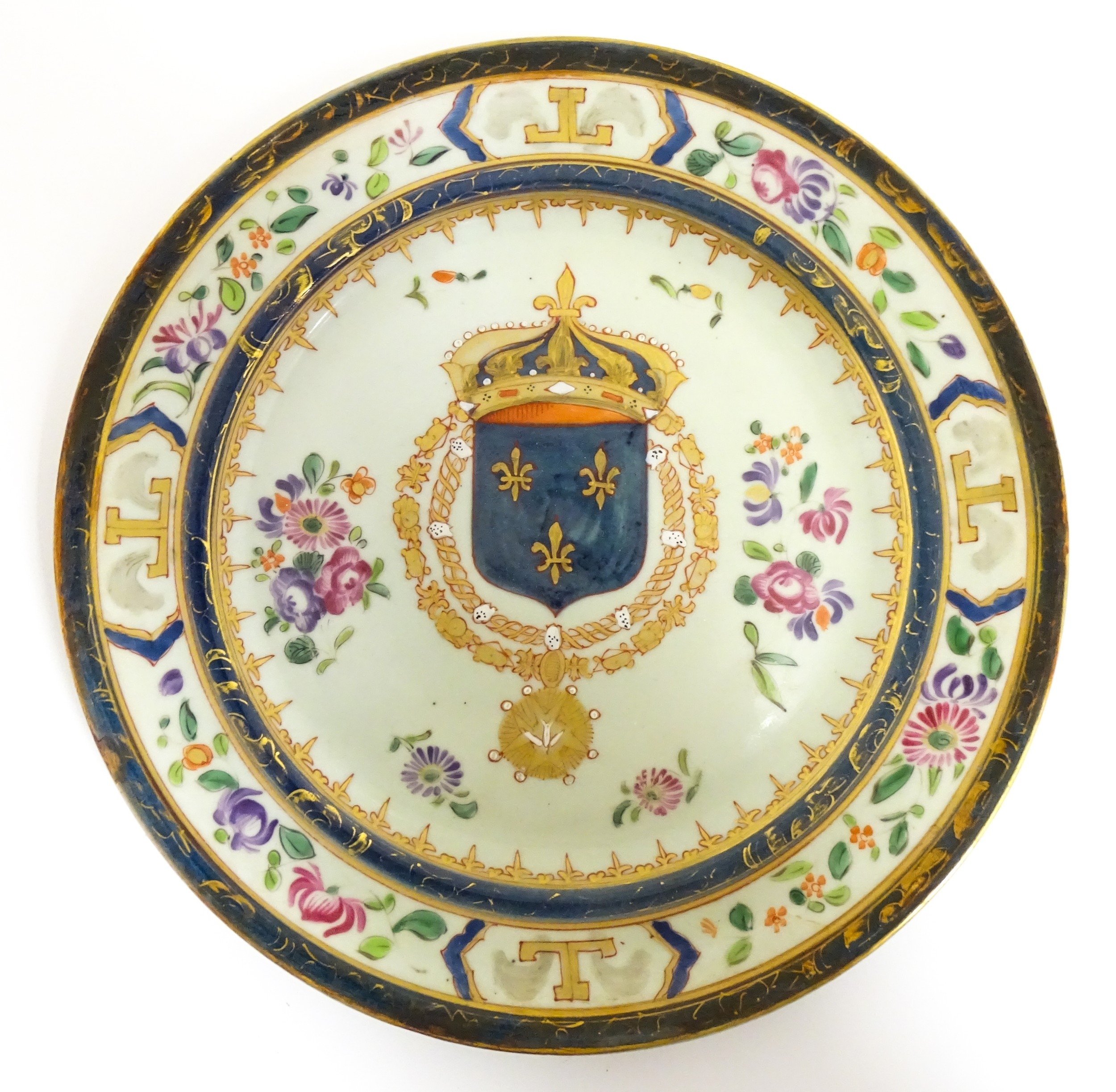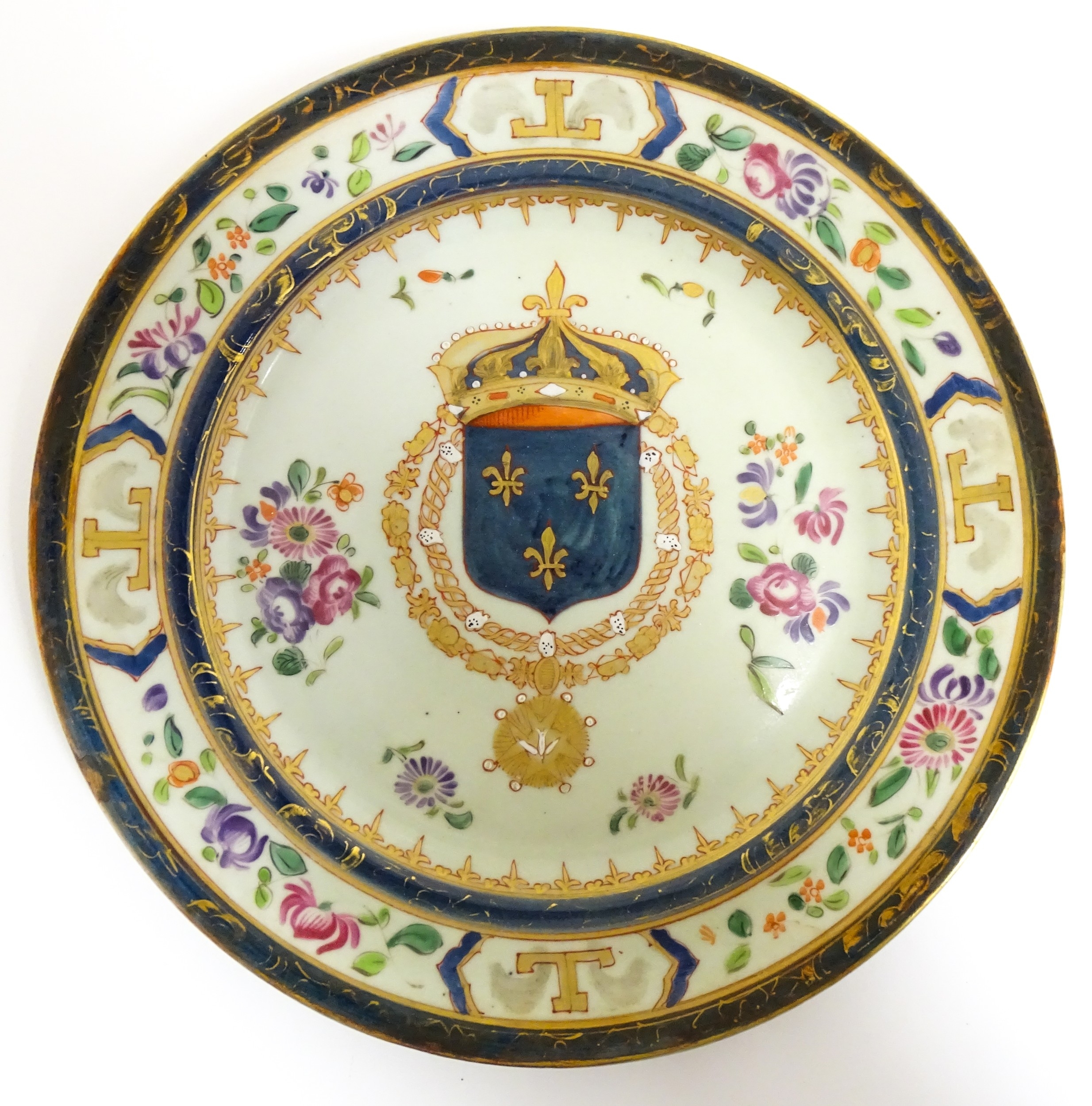 A Samson plate in the Chinese style with hand painted armorial / coat of arms decoration. Marked under. Approx. 9 1/2" wide