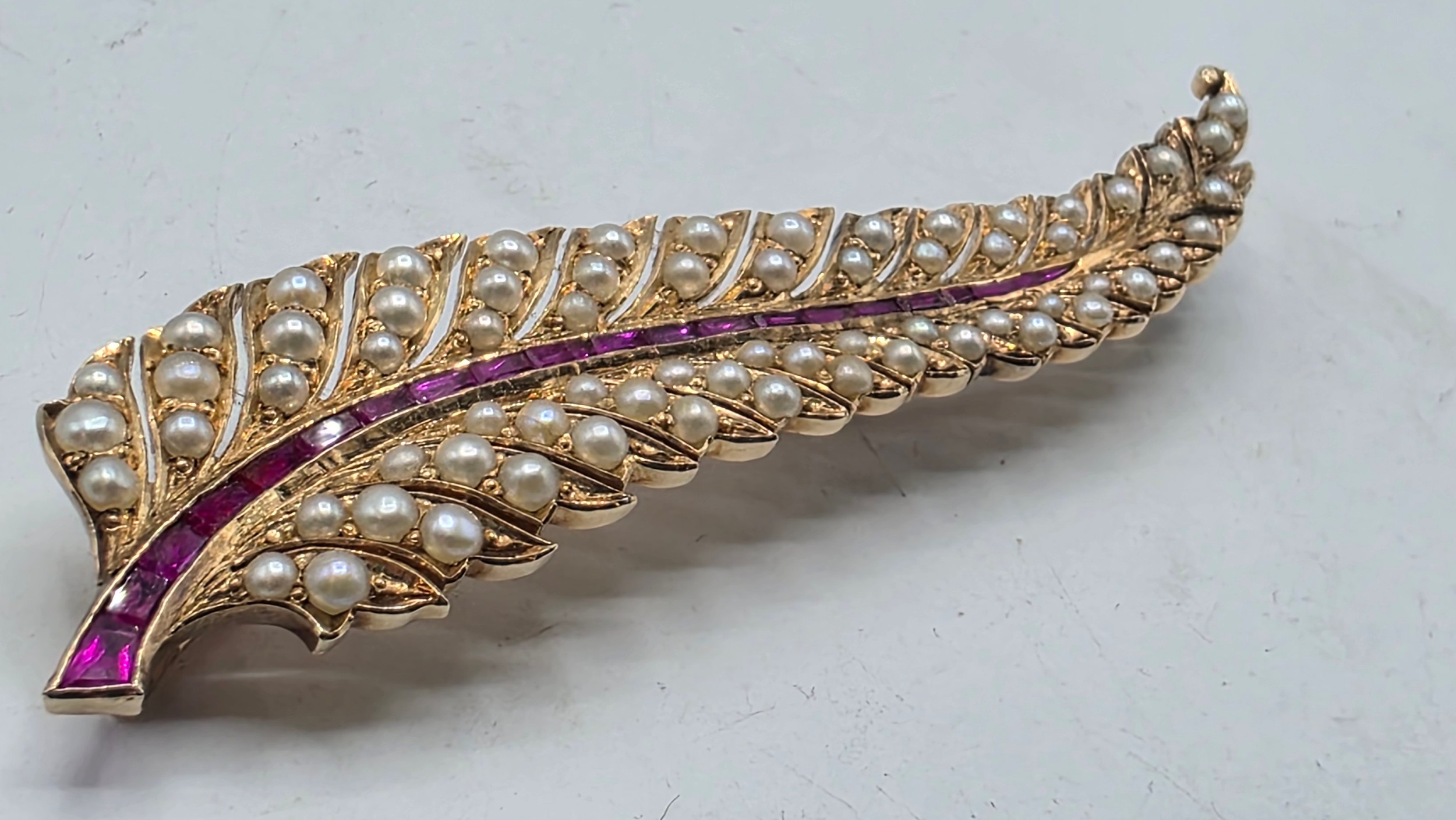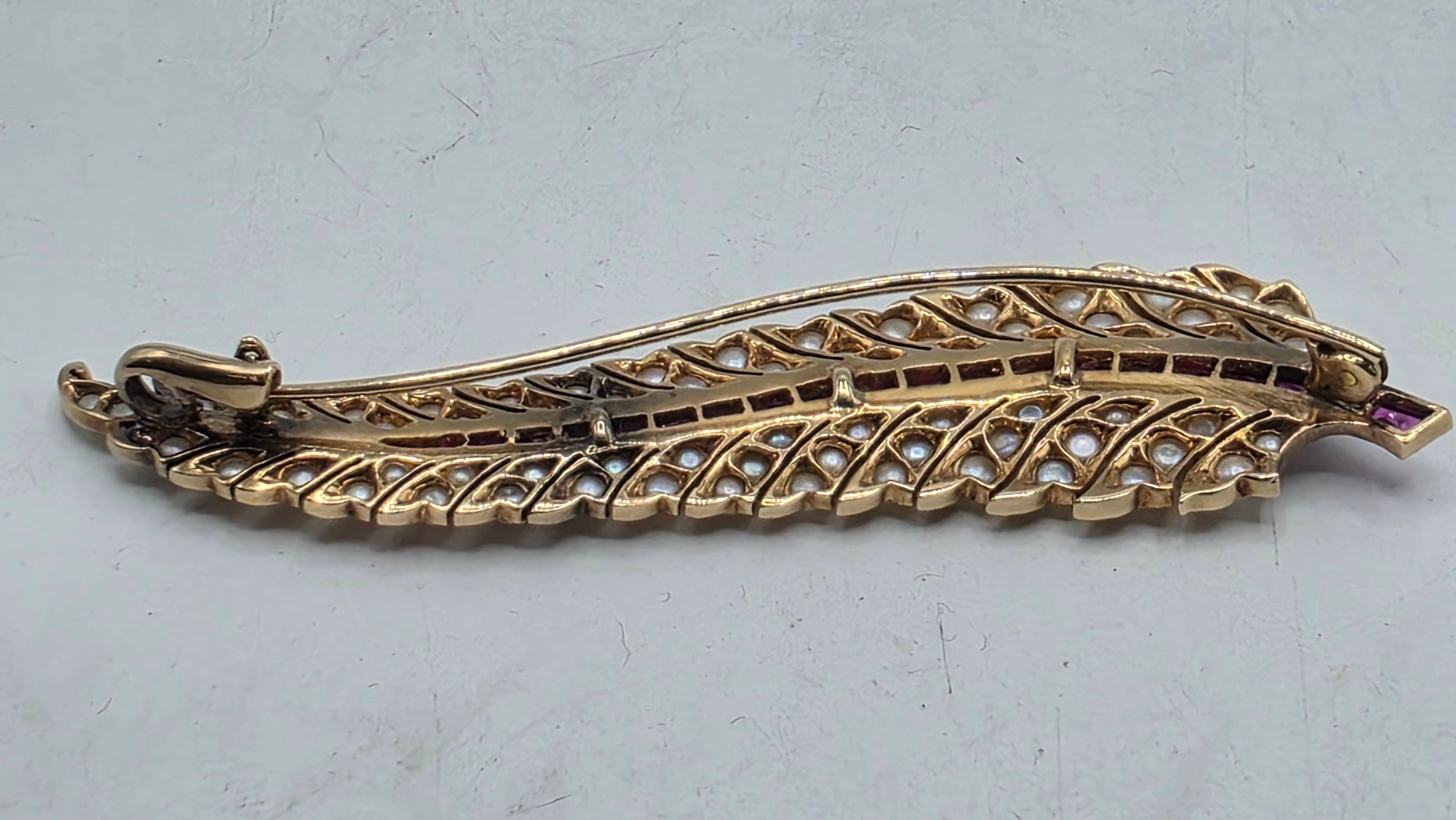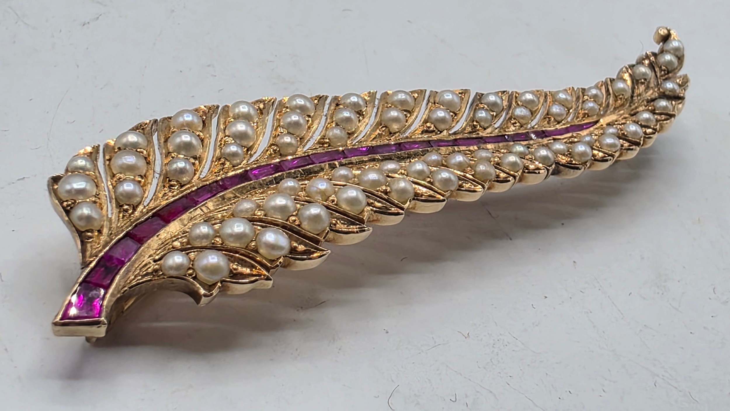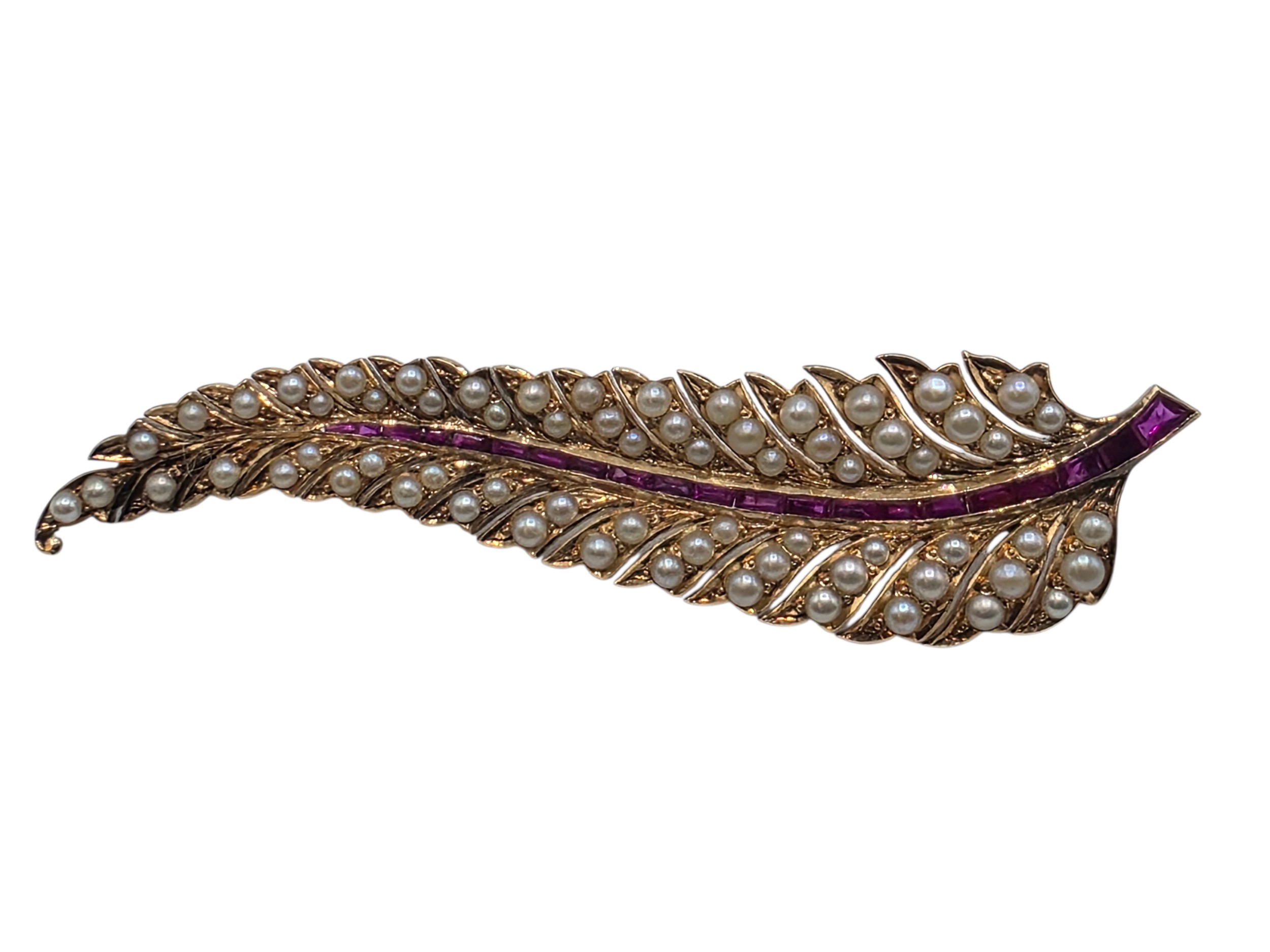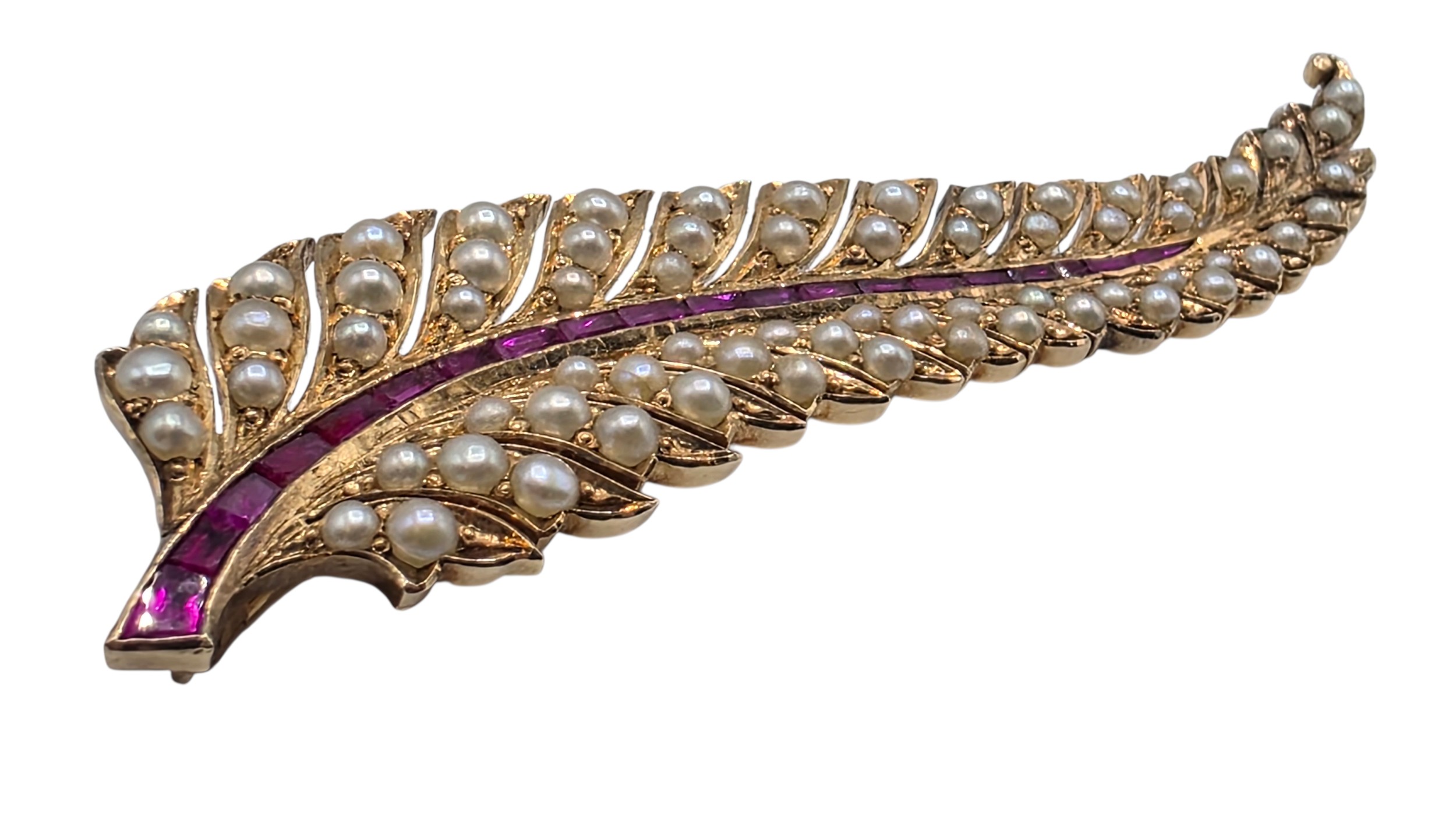 An unmarked yellow metal pearl and ruby Fern Brooch set with graduated line of channel set rubies and split pearls 8 cm 11.5 g