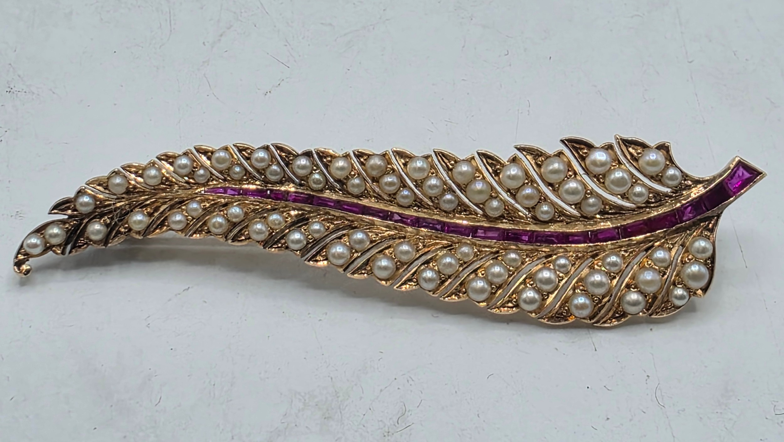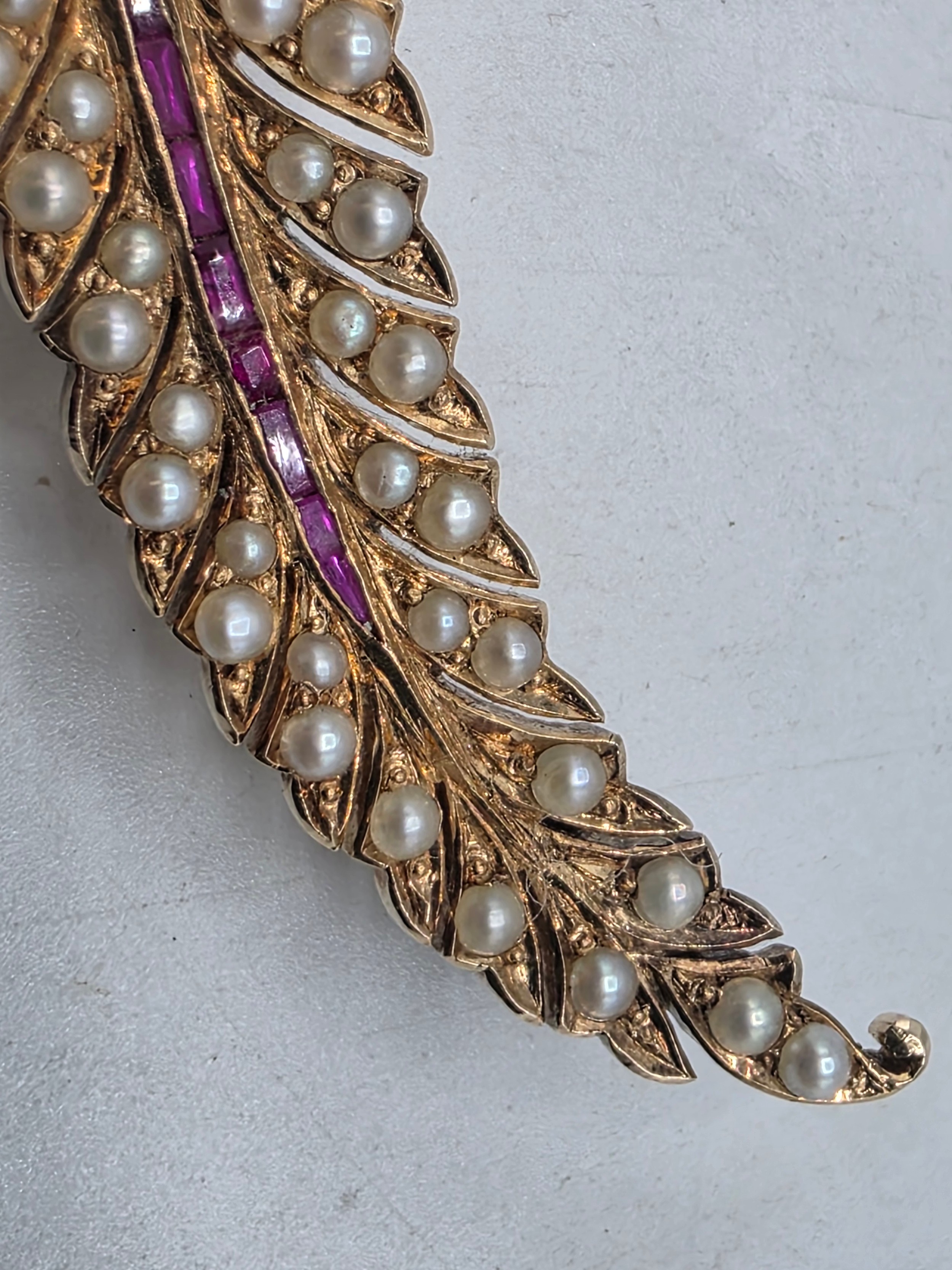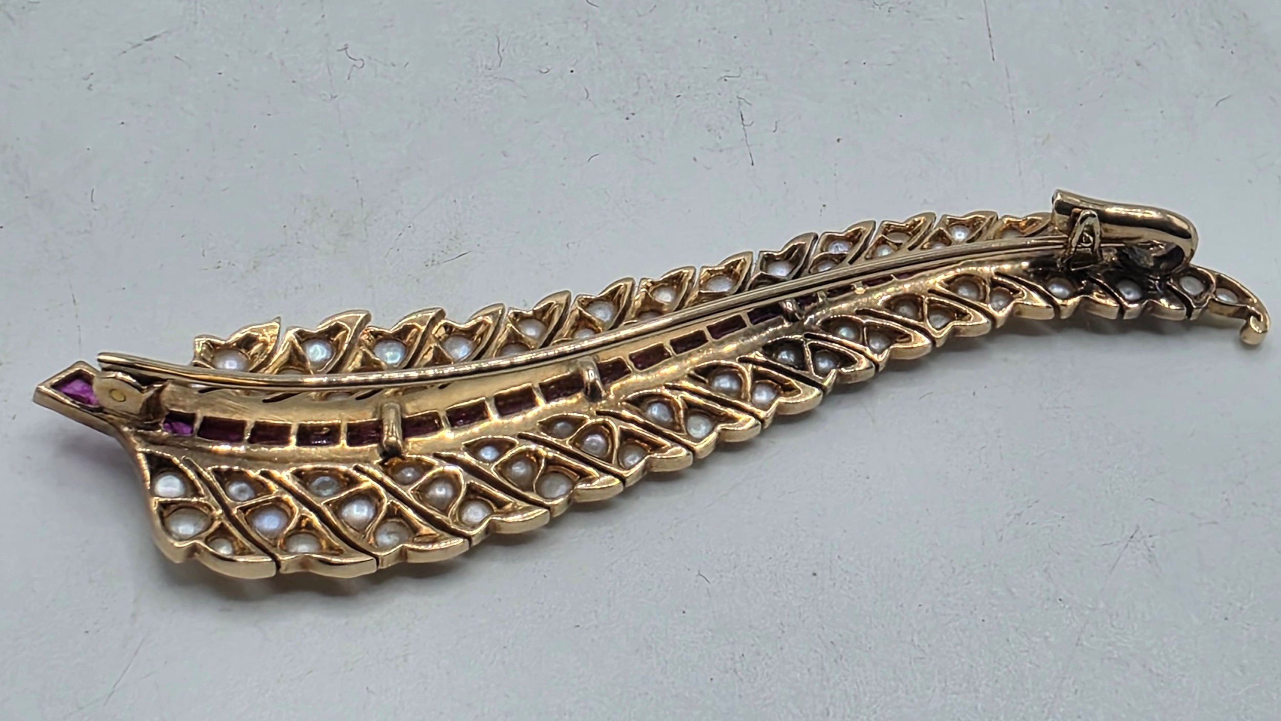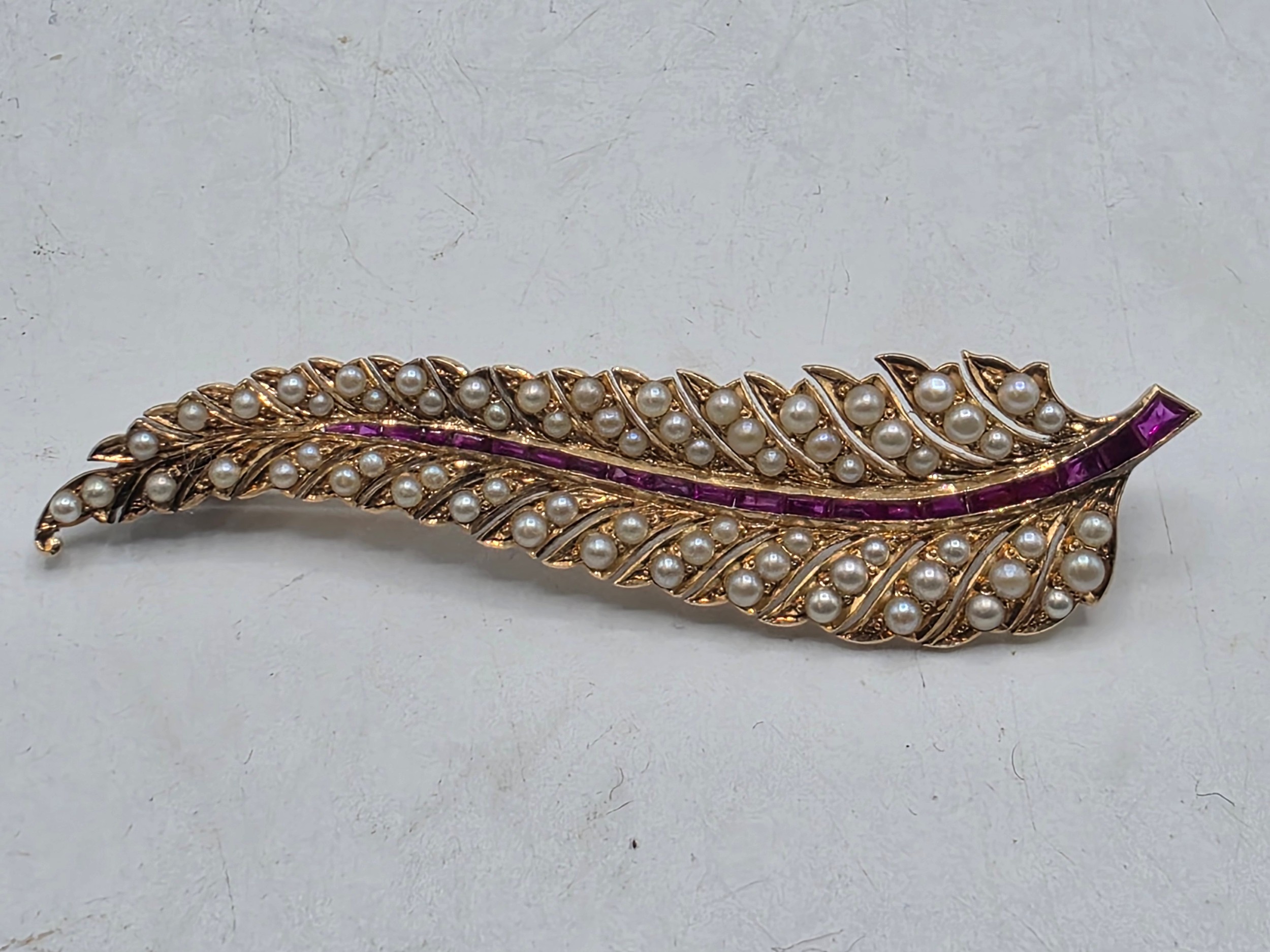 An unmarked yellow metal pearl and ruby Fern Brooch set with graduated line of channel set rubies and split pearls 8 cm 11.5 g