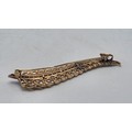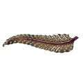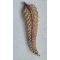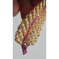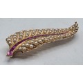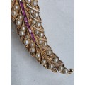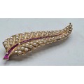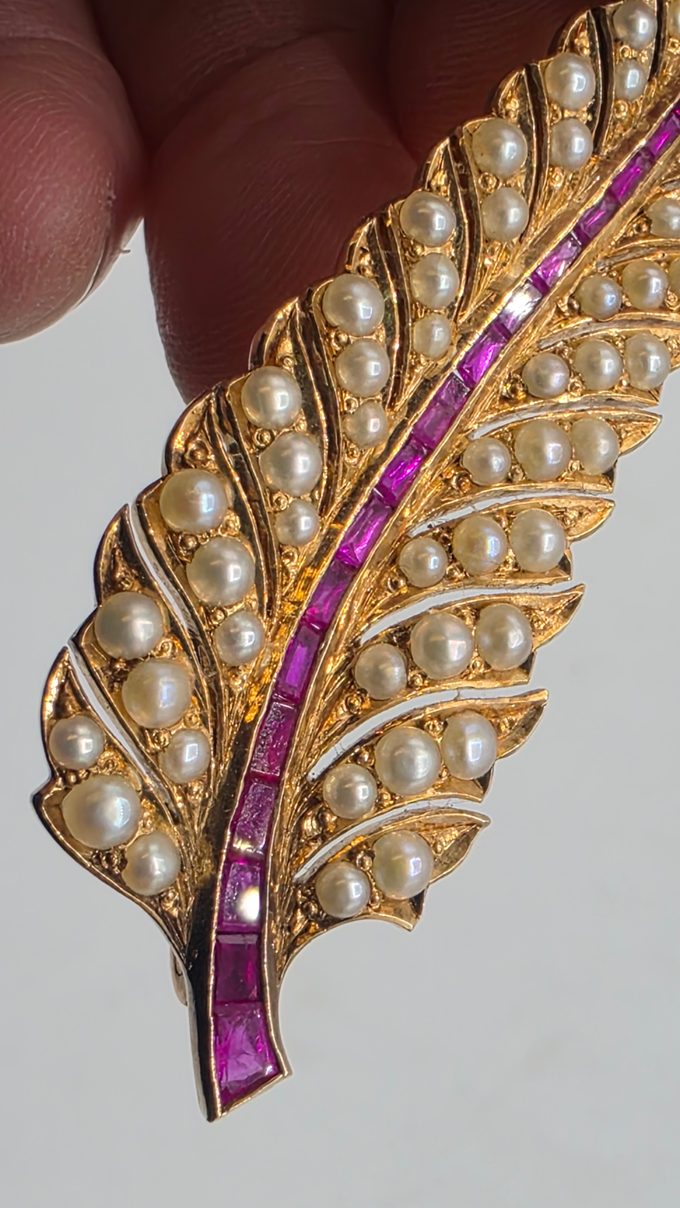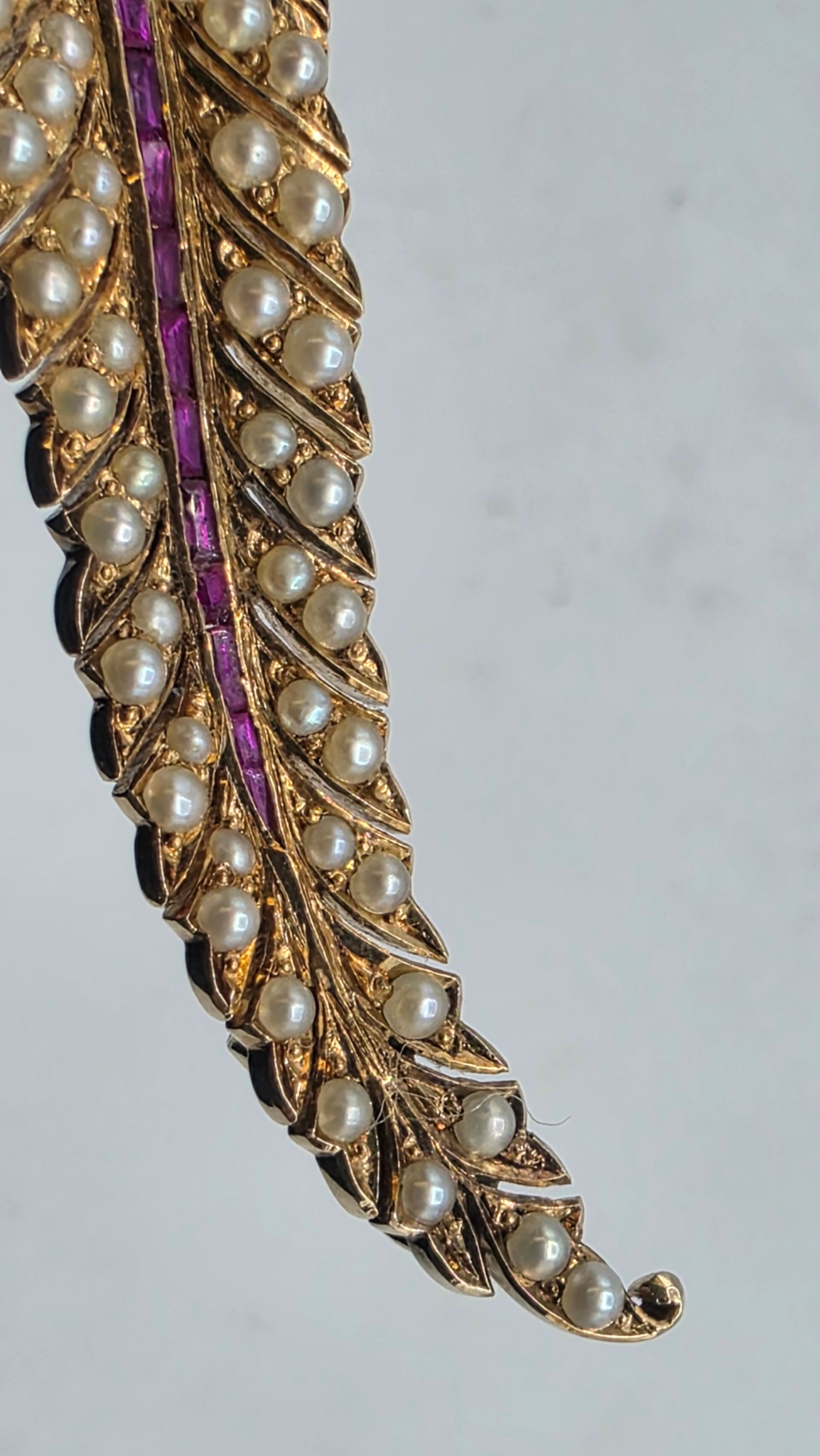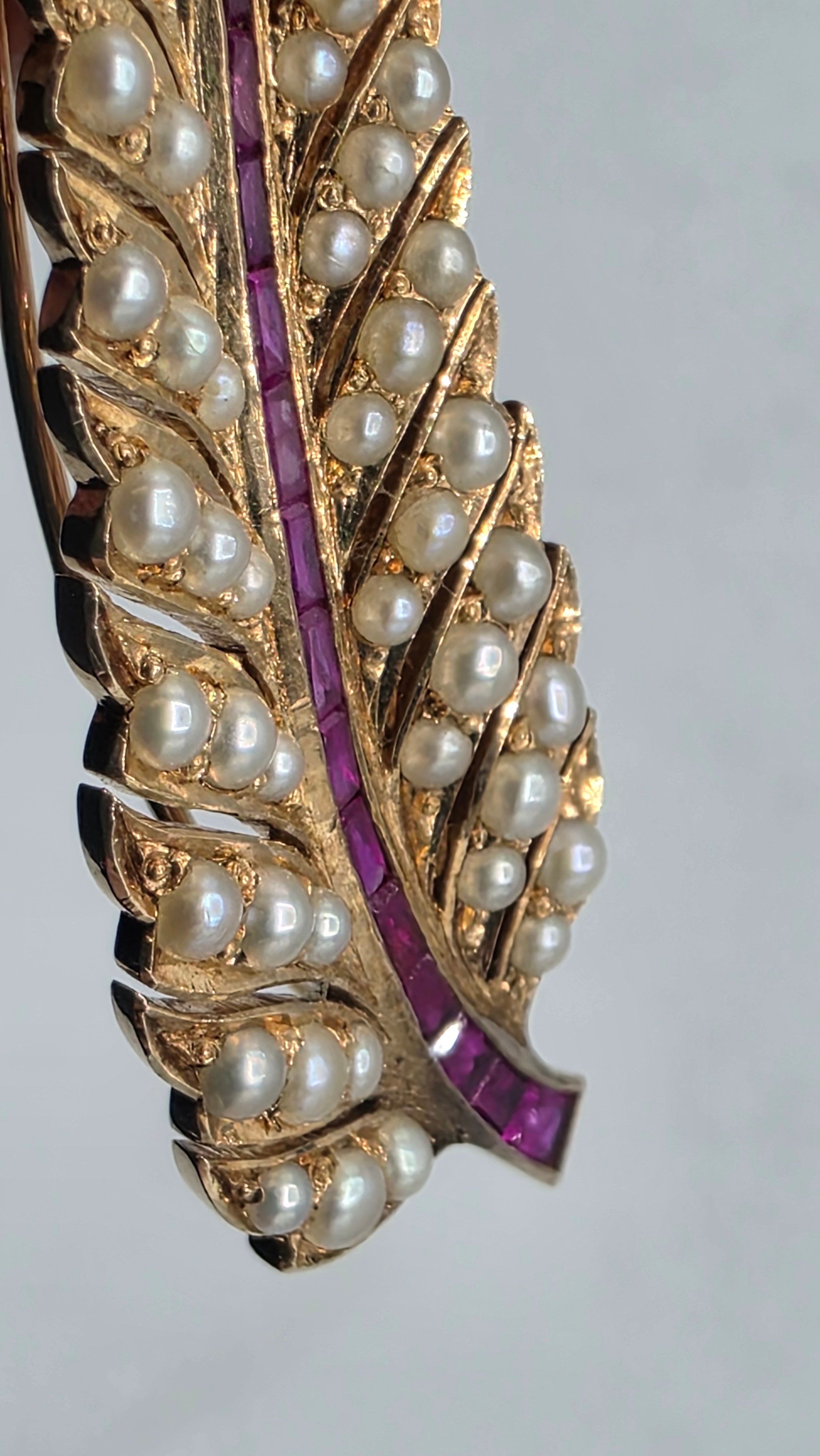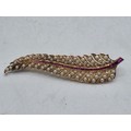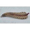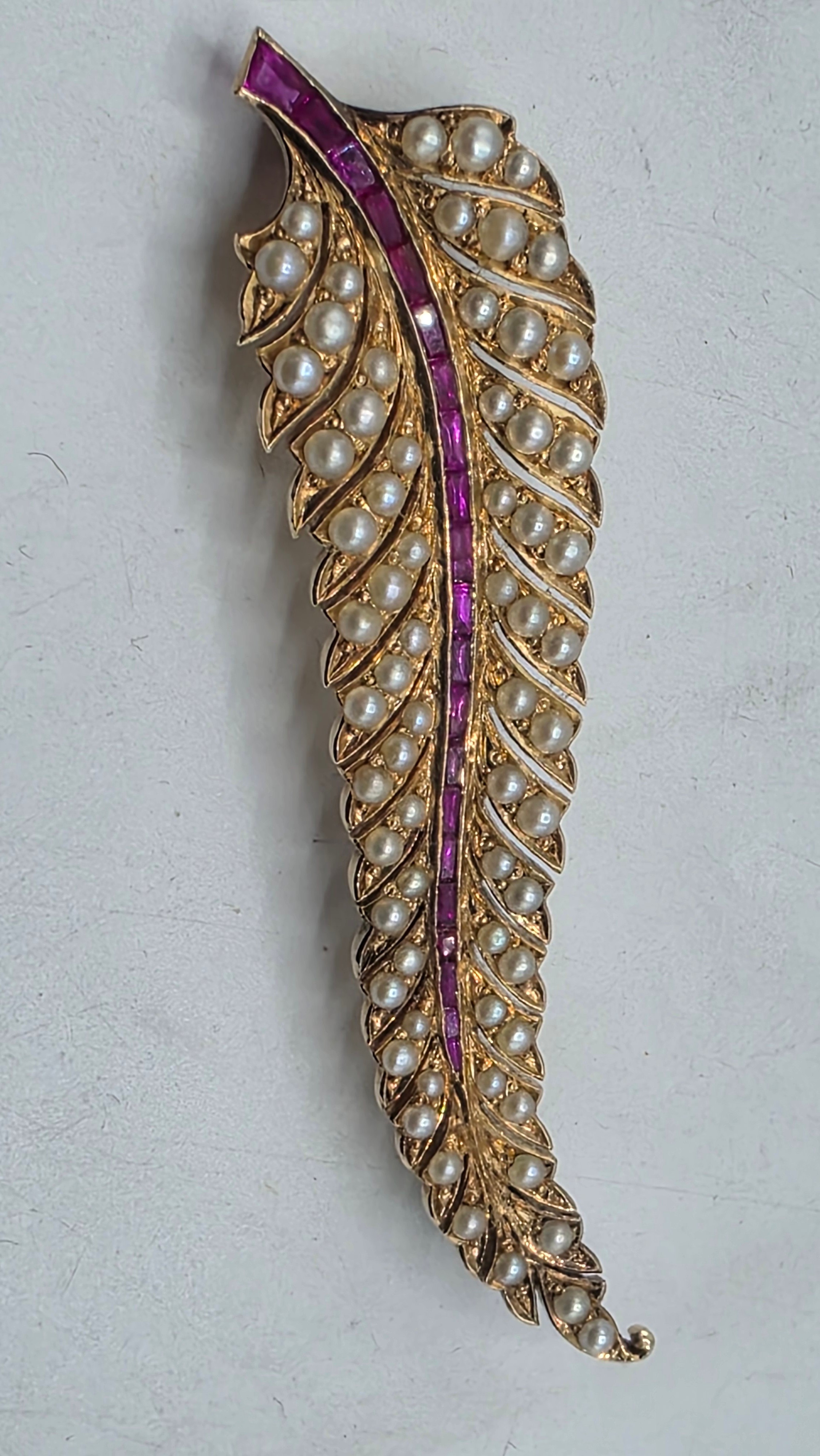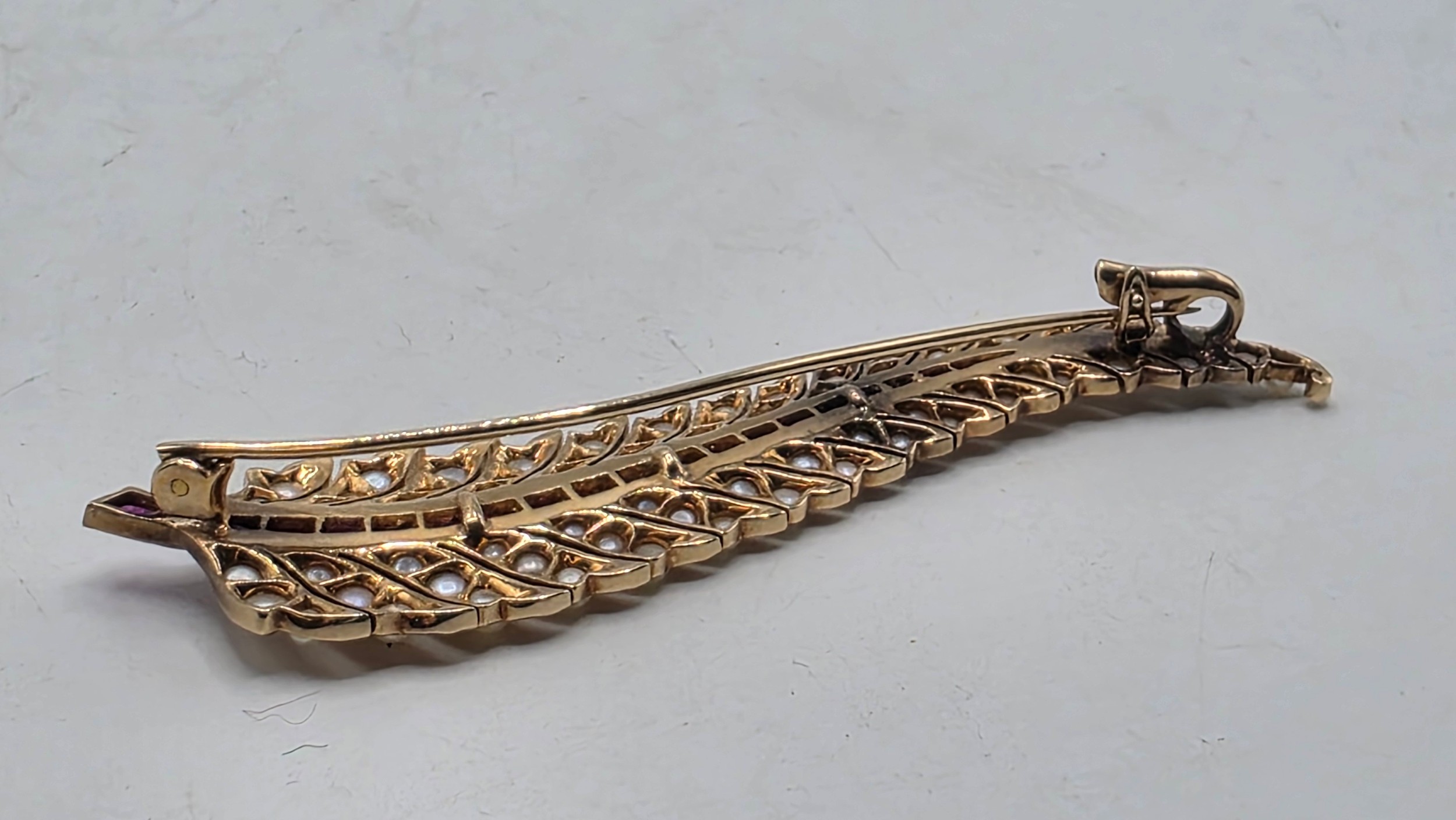 An unmarked yellow metal pearl and ruby Fern Brooch set with graduated line of channel set rubies and split pearls 8 cm 11.5 g