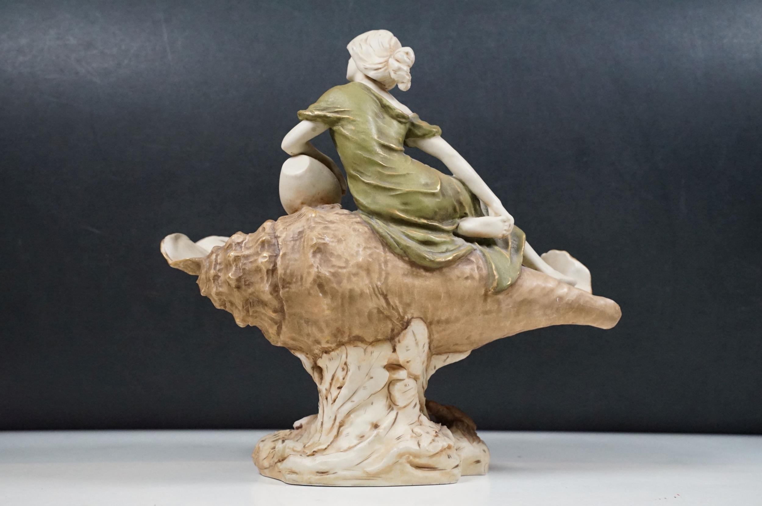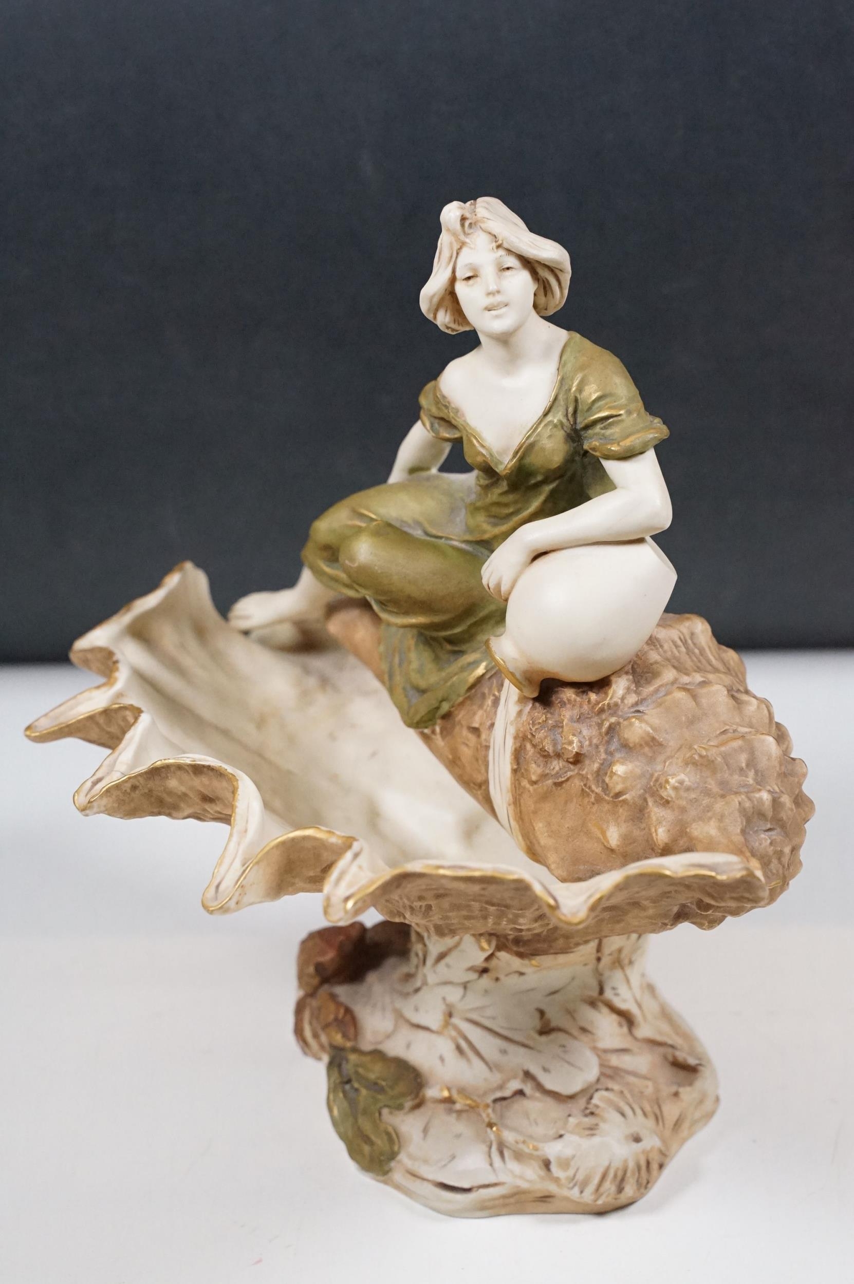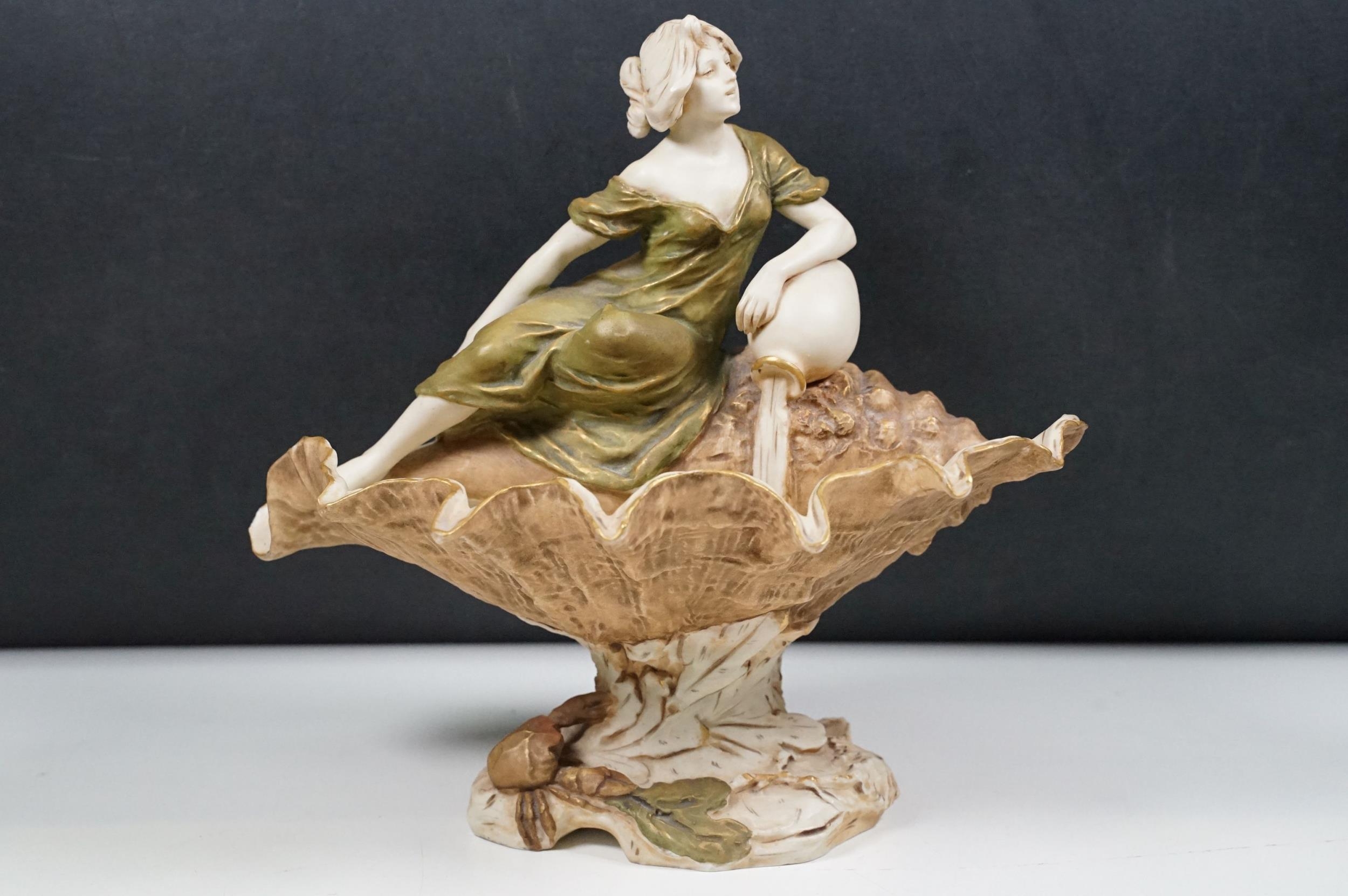 Early 20th century Art Nouveau Royal Dux Bohemia porcelain lady in conch shell figurine on raised base, 26cm