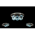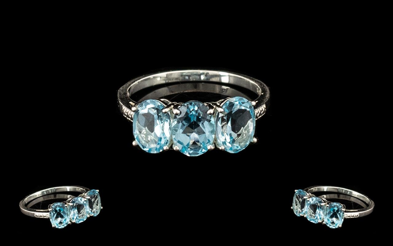 Sky Blue Topaz Trilogy Ring, three oval cut sky blue topaz stones, totalling 4.75cts, set in silver in a classic style which is often given as a commemorative gift and can be interpreted by personal choice, eg 'Mother, father and new baby', or 'I loved you yesterday, I love you today and i'll love you even more tomorrow' etc.; size S/T