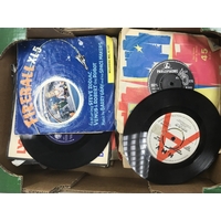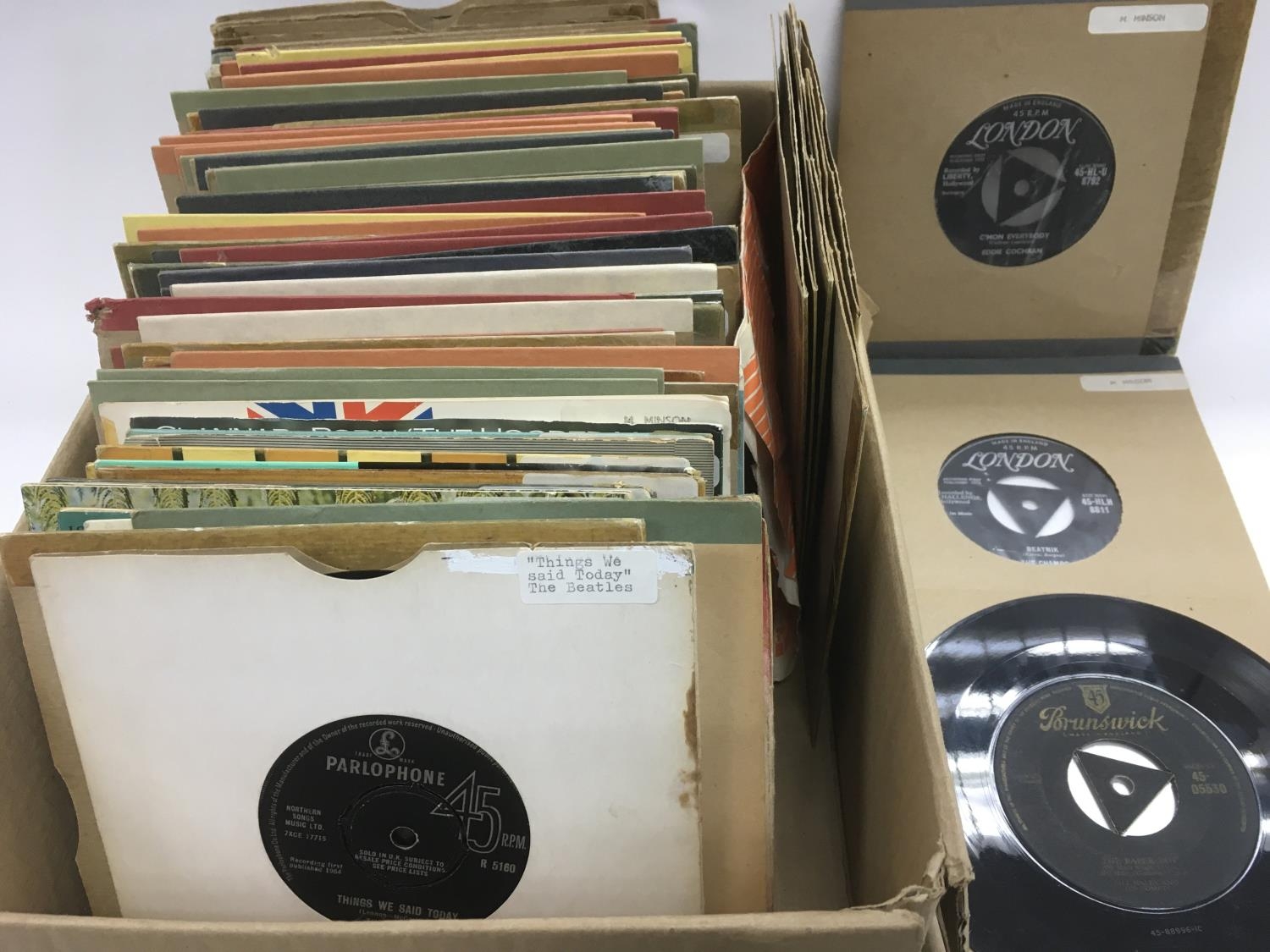 A collection of 7 inch singles by various artists including The Beatles, Eddie Cochran, Elvis Presley and others.