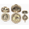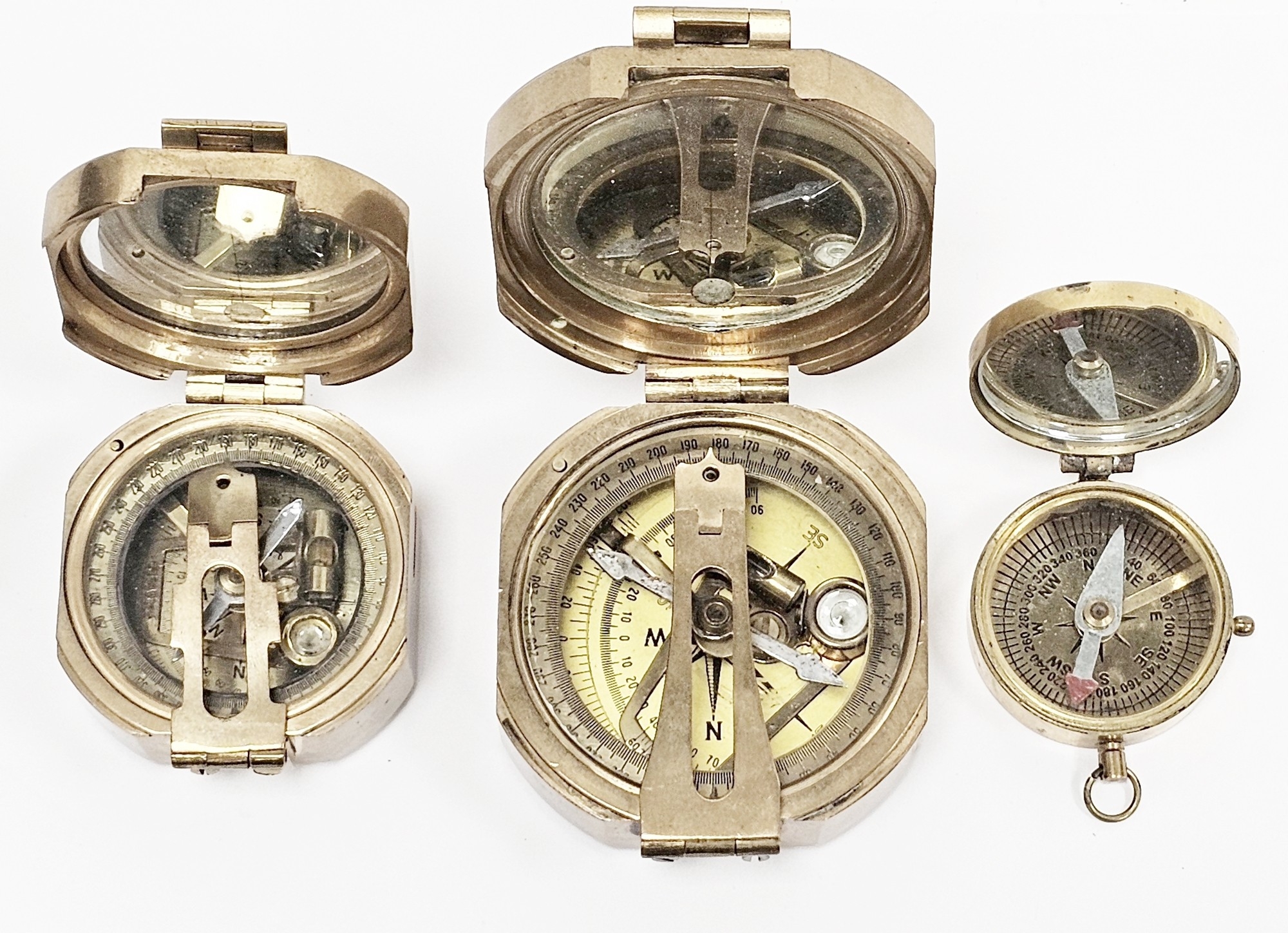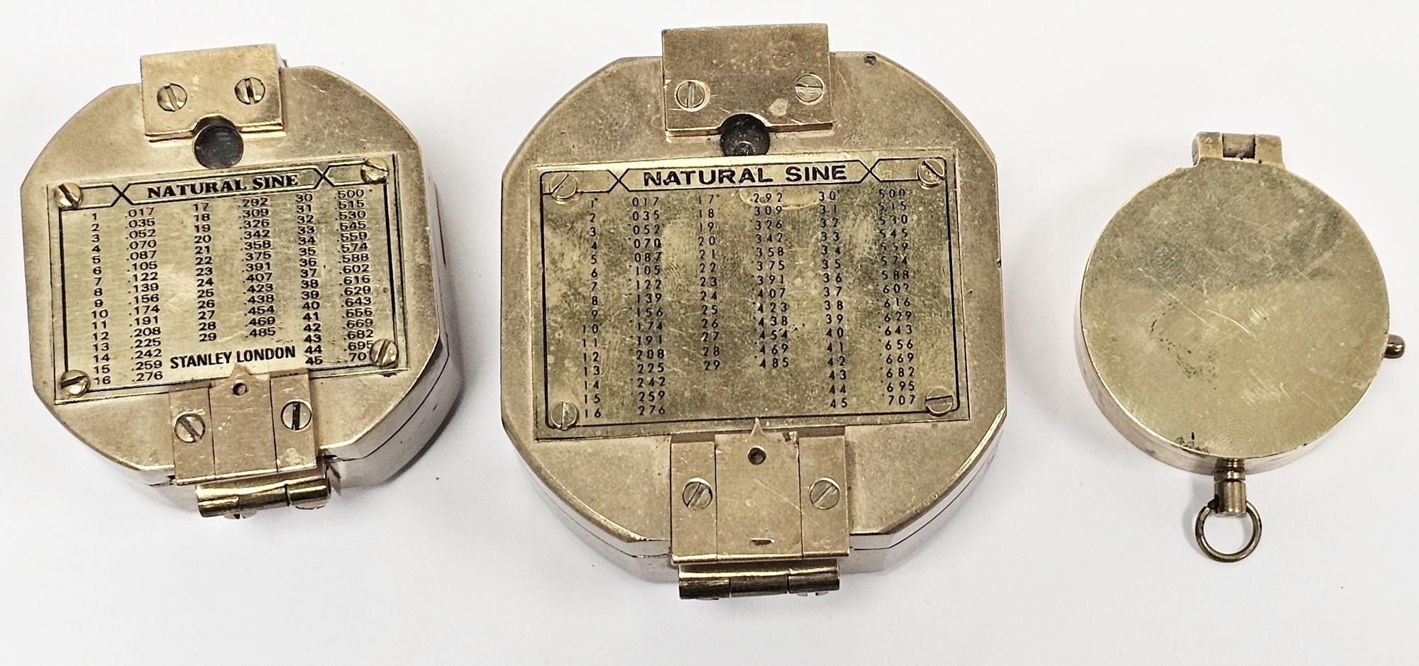 Two replica Stanley of London brass compasses, largest 8cm wide and another gilt metal cased compass (3)