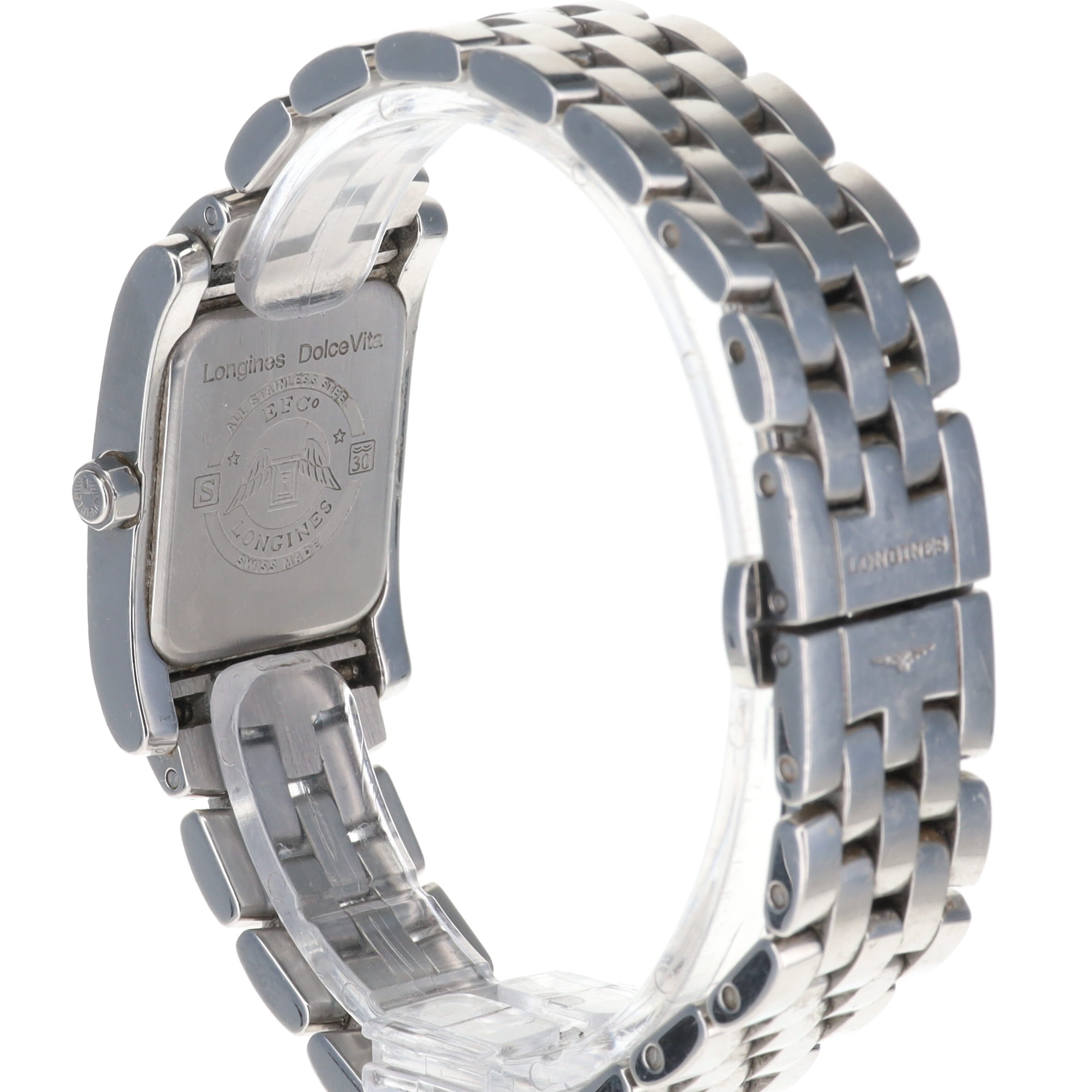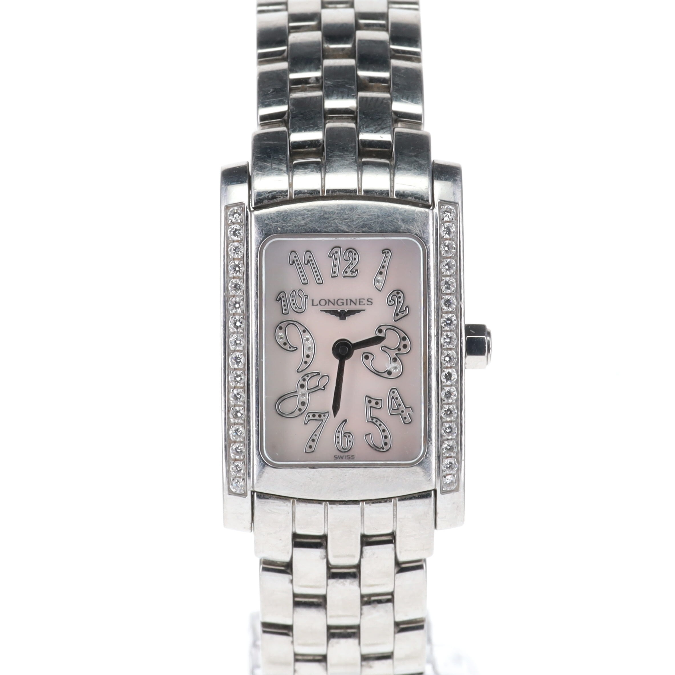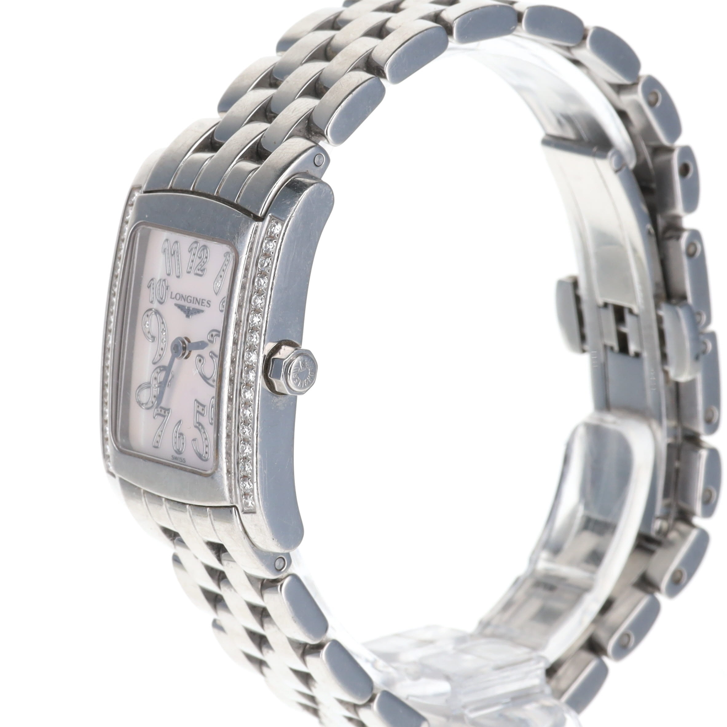 Longines - Dolce Vita Watch. ETA Cal. 980.153 11 Jewel Quartz movement. Stainless steel case with a Stainless Steel strap, with Diamonds on the bezel. A Sapphire crystal. Mother of Pearl dial with diamonds. Watch reference number L5.502.0.97.6. The watch is working, winds & runs. No box or papers included.