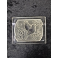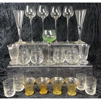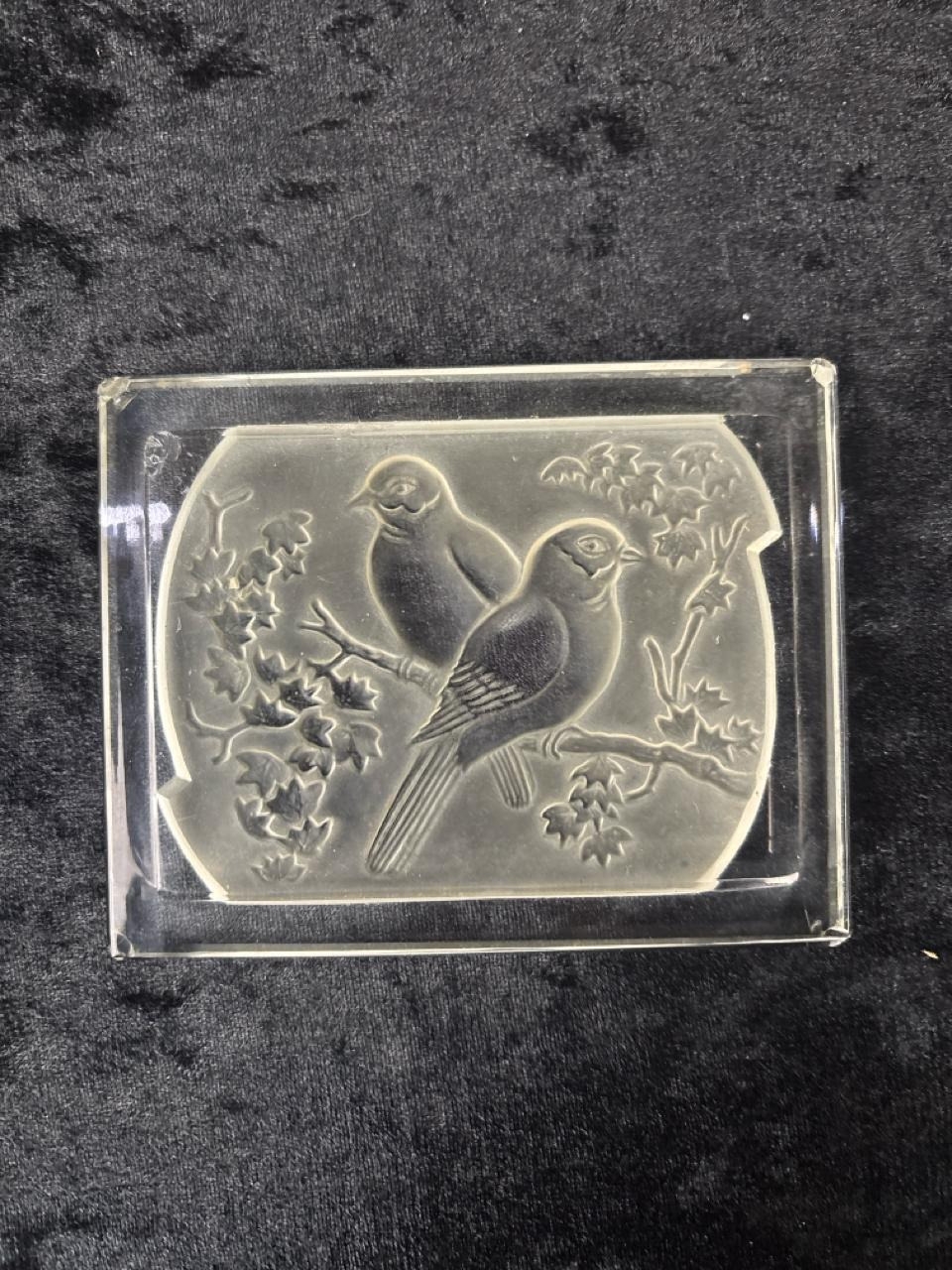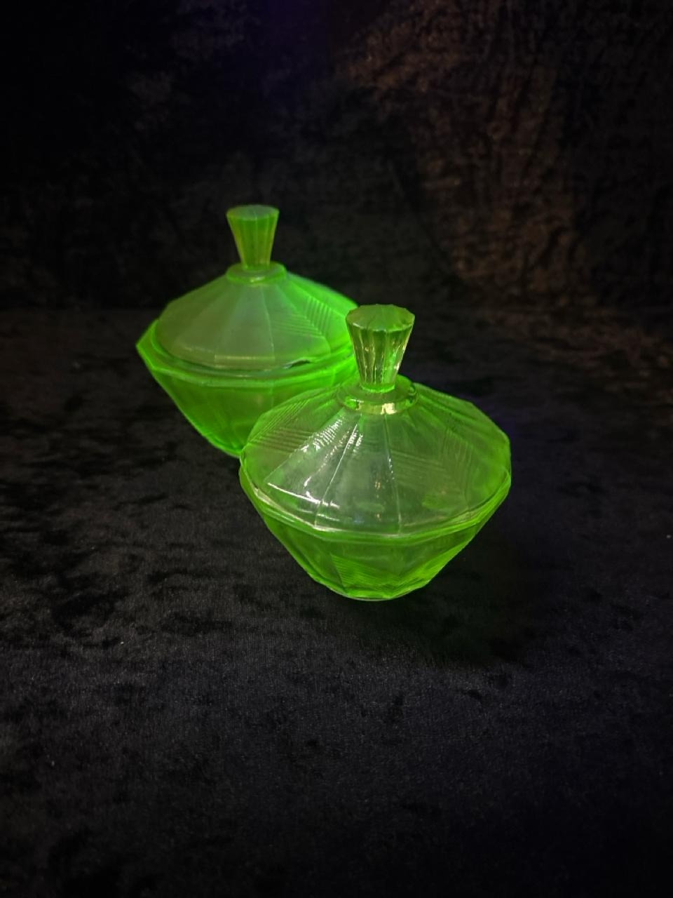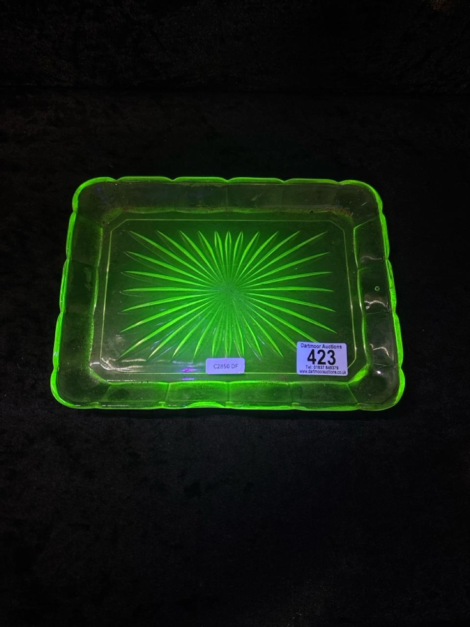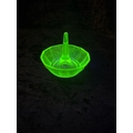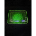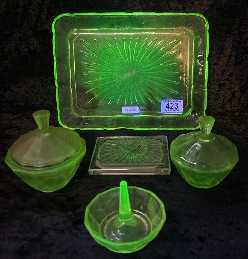 Dressing table set of four uranium green glass items, plus an embossed glass plaque.
