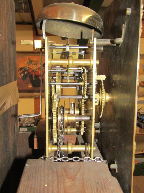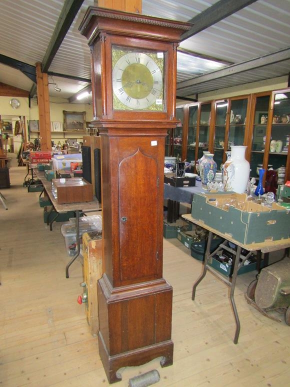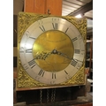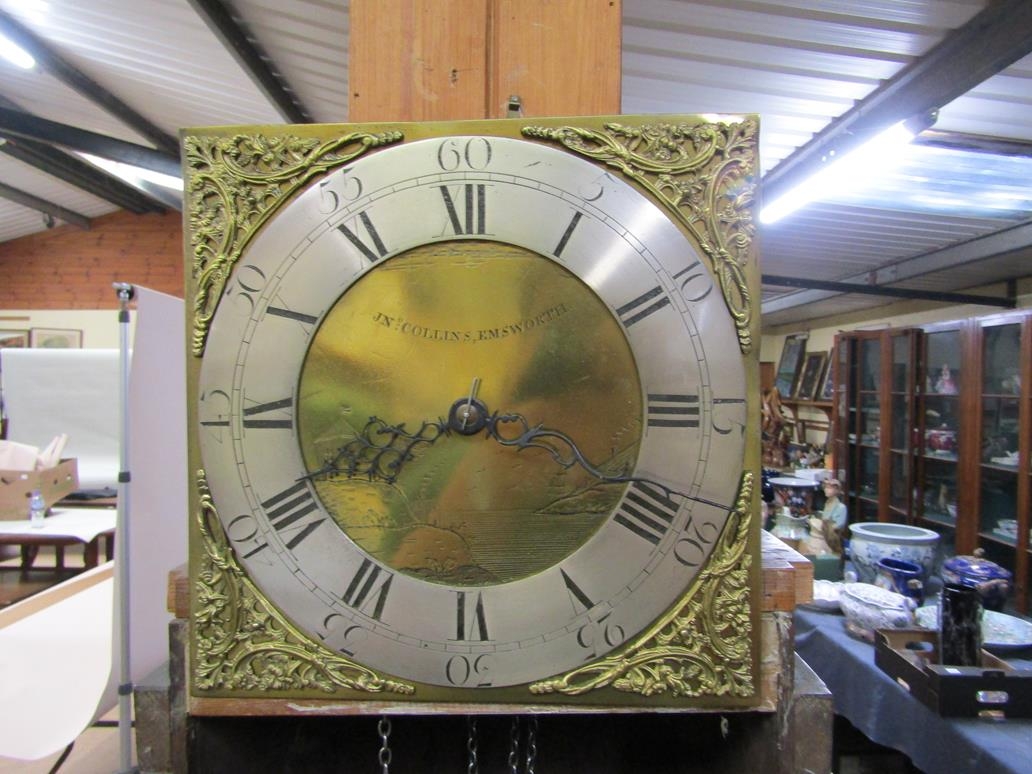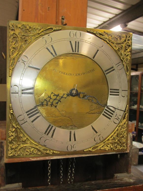 OAK LONGCASE CLOCK WITH SQUARE GILT METAL FACE WITH SILVERED CHAPTER RING SIGNED JONATHON COLLINS OF EMSWORTH, 195CM H