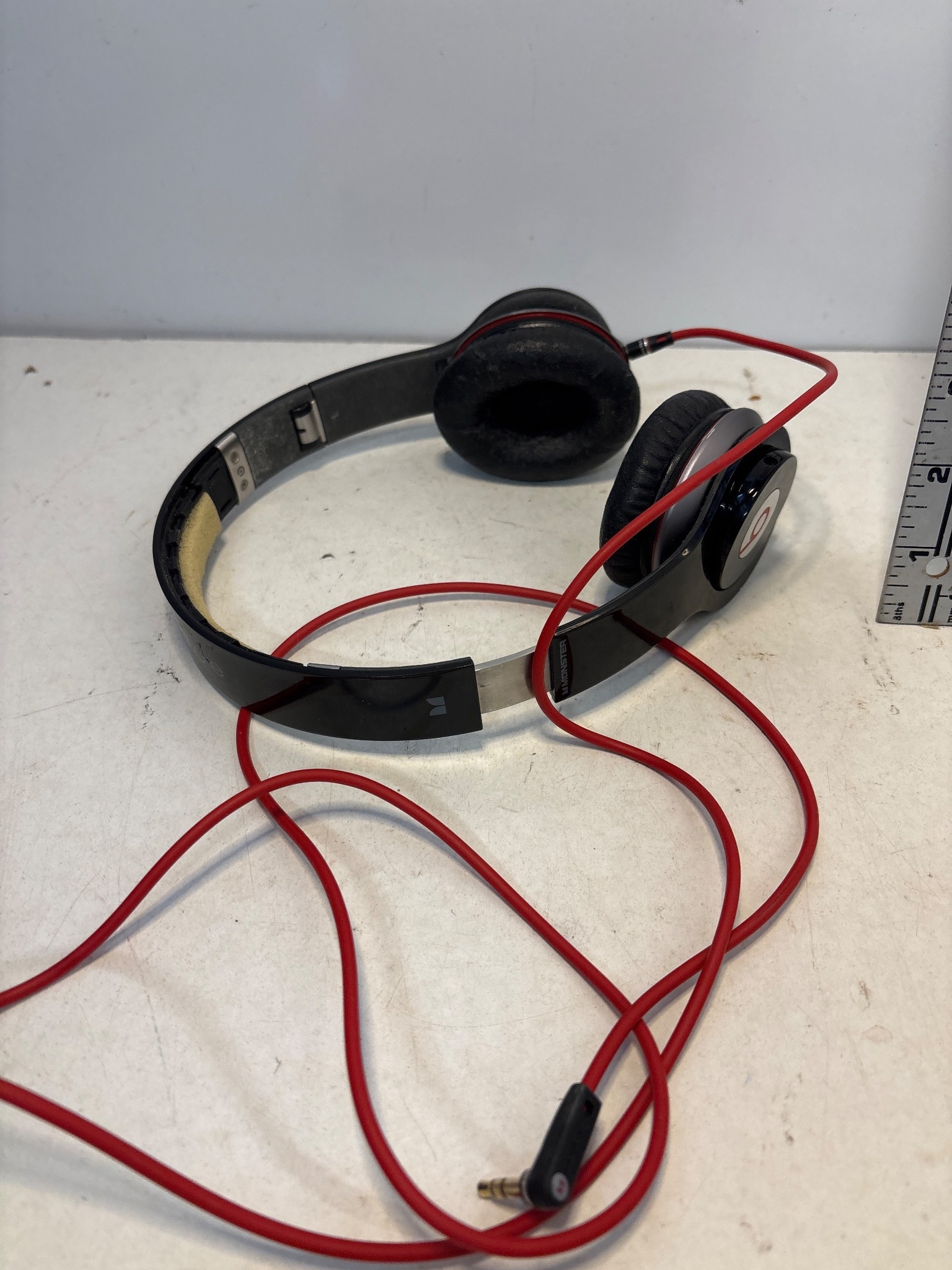 On-ear wired headphones with red cable and black and silver accents. Shows visible signs of wear, including frayed head padding and scuffs.