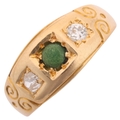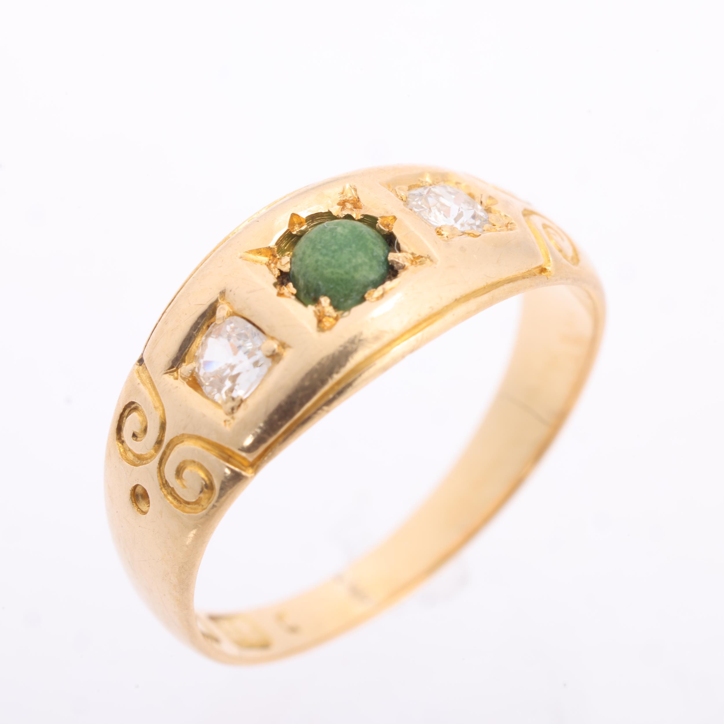 An Antique 18ct gold three stone turquoise and diamond ring, maker H&S, indistinct date letter, set with round cabochon turquoise and old-cut diamonds, total diamond content approx 0.1ct, setting height 7.1mm, size H, 2.4g