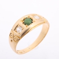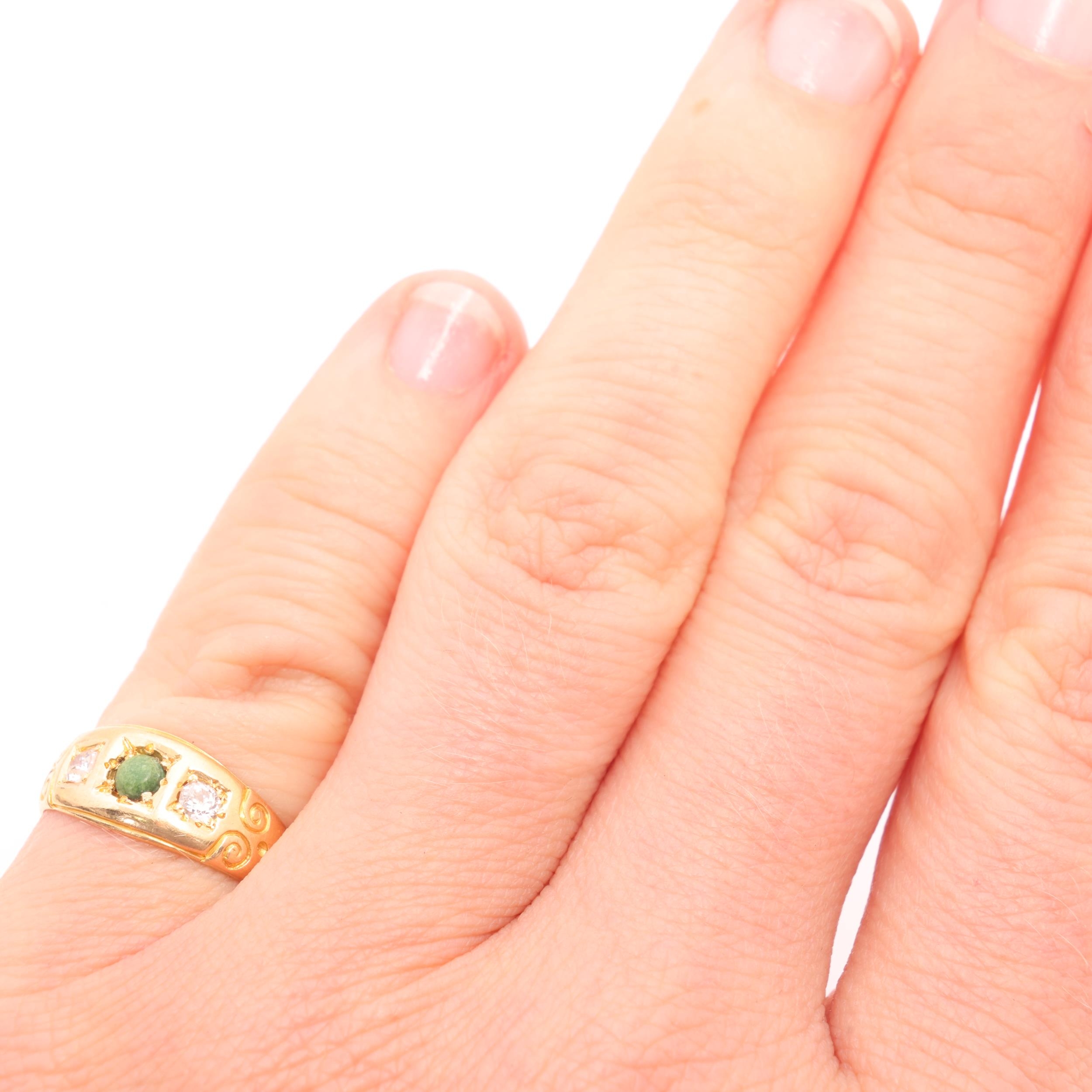 No damage, all stones present, turquoise is discoloured green, diamonds bright and lively, general wear to mount with 1 well concealed join mark on back of shank, full UK hallmarks heavily worn, marked 18