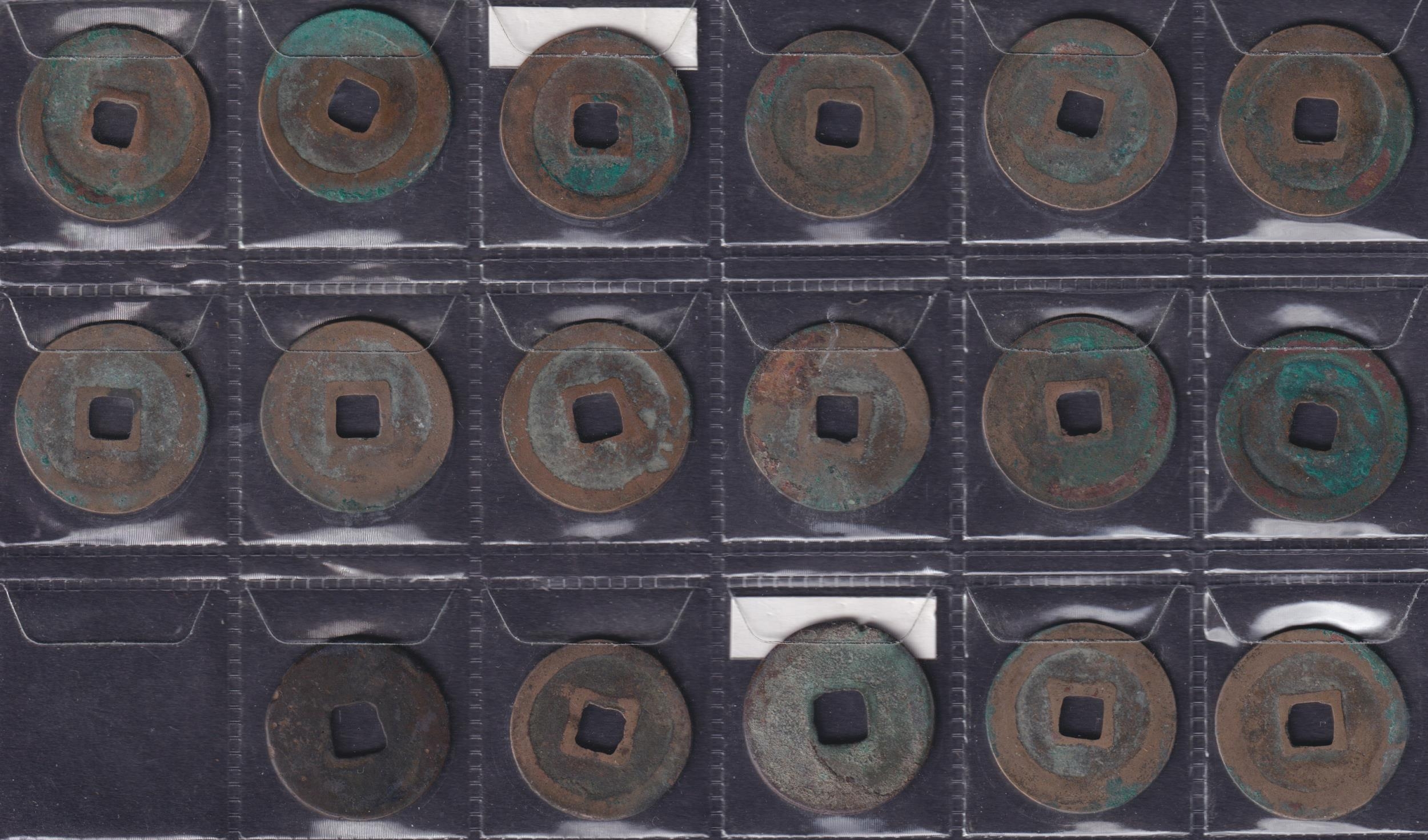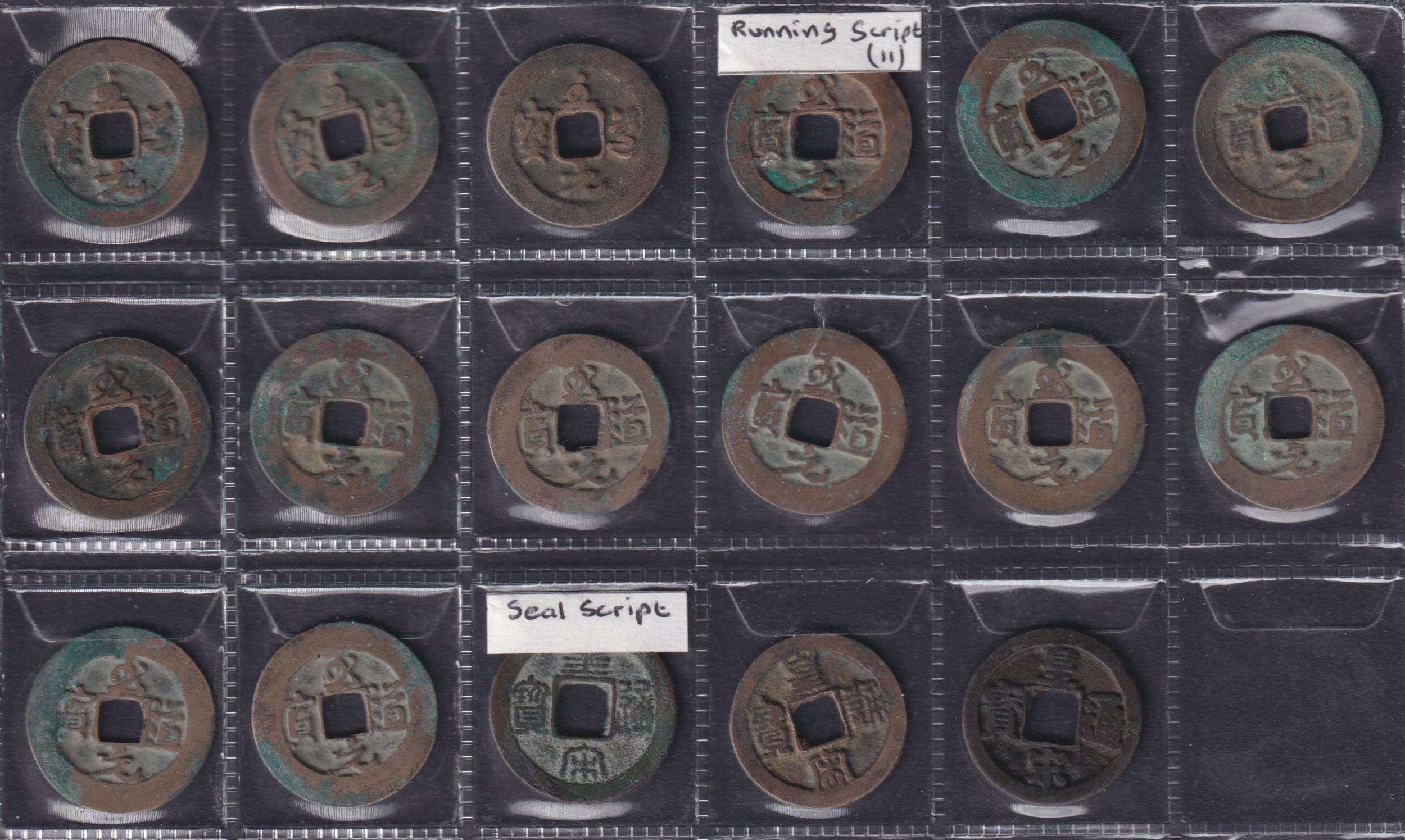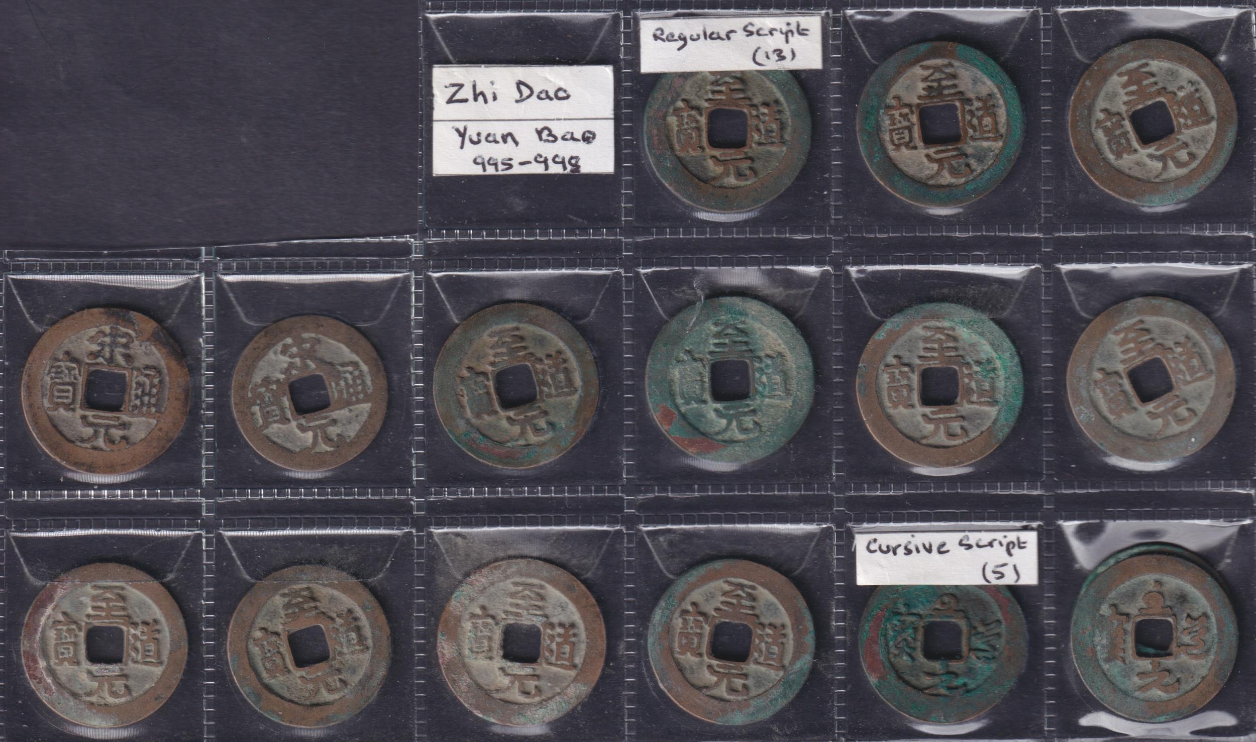 Medieval China: Northern Song 1 Cash Coins, Emperor Zhi Dao (995–998 AD), a group of 32 copper 1 cash coins of the Northern Song dynasty, Emperor Zhi Dao (995–998 AD). 13 regular script, 5 cursive script, 11 running script & 2 seal script. Grades G–GF