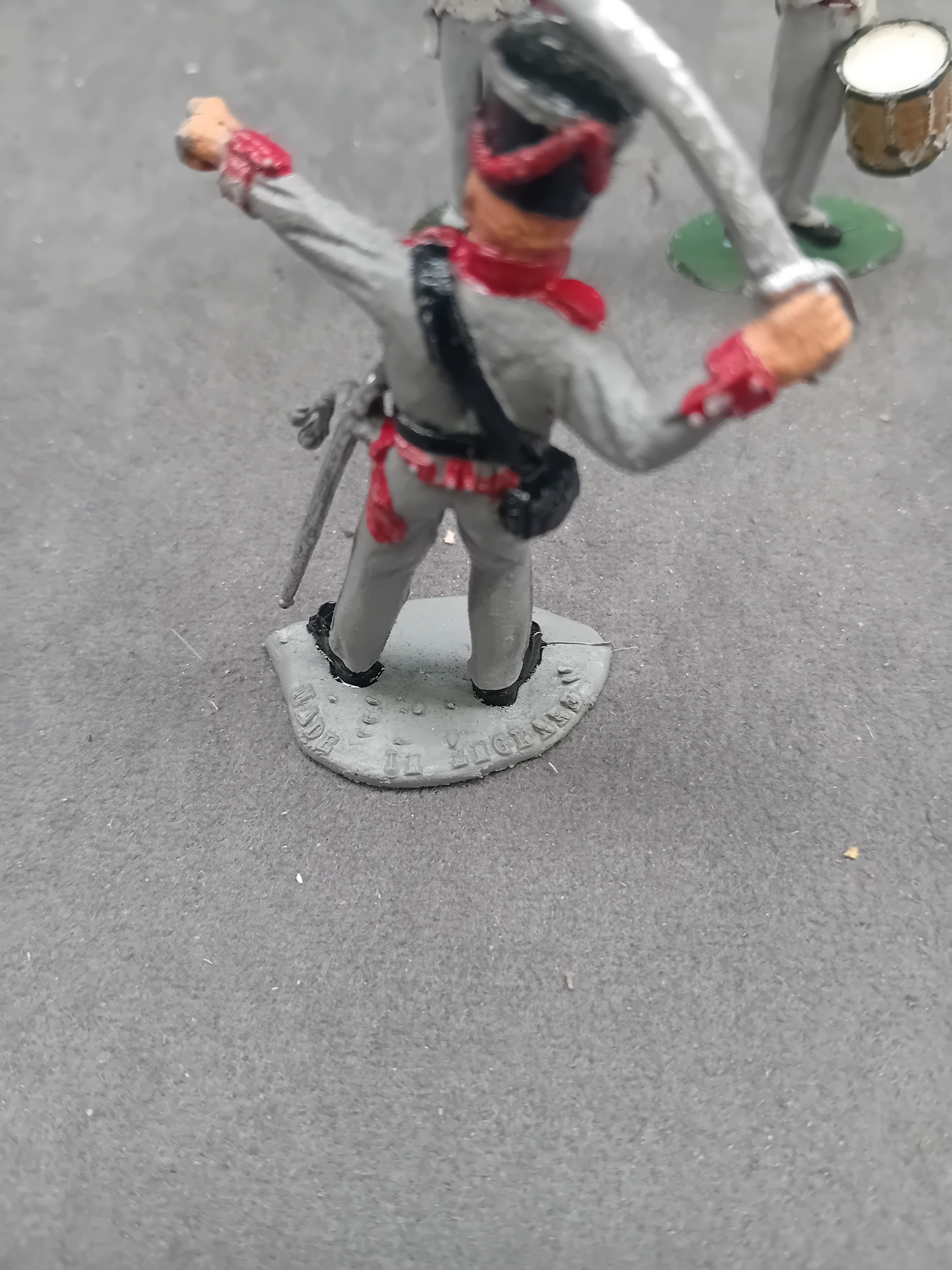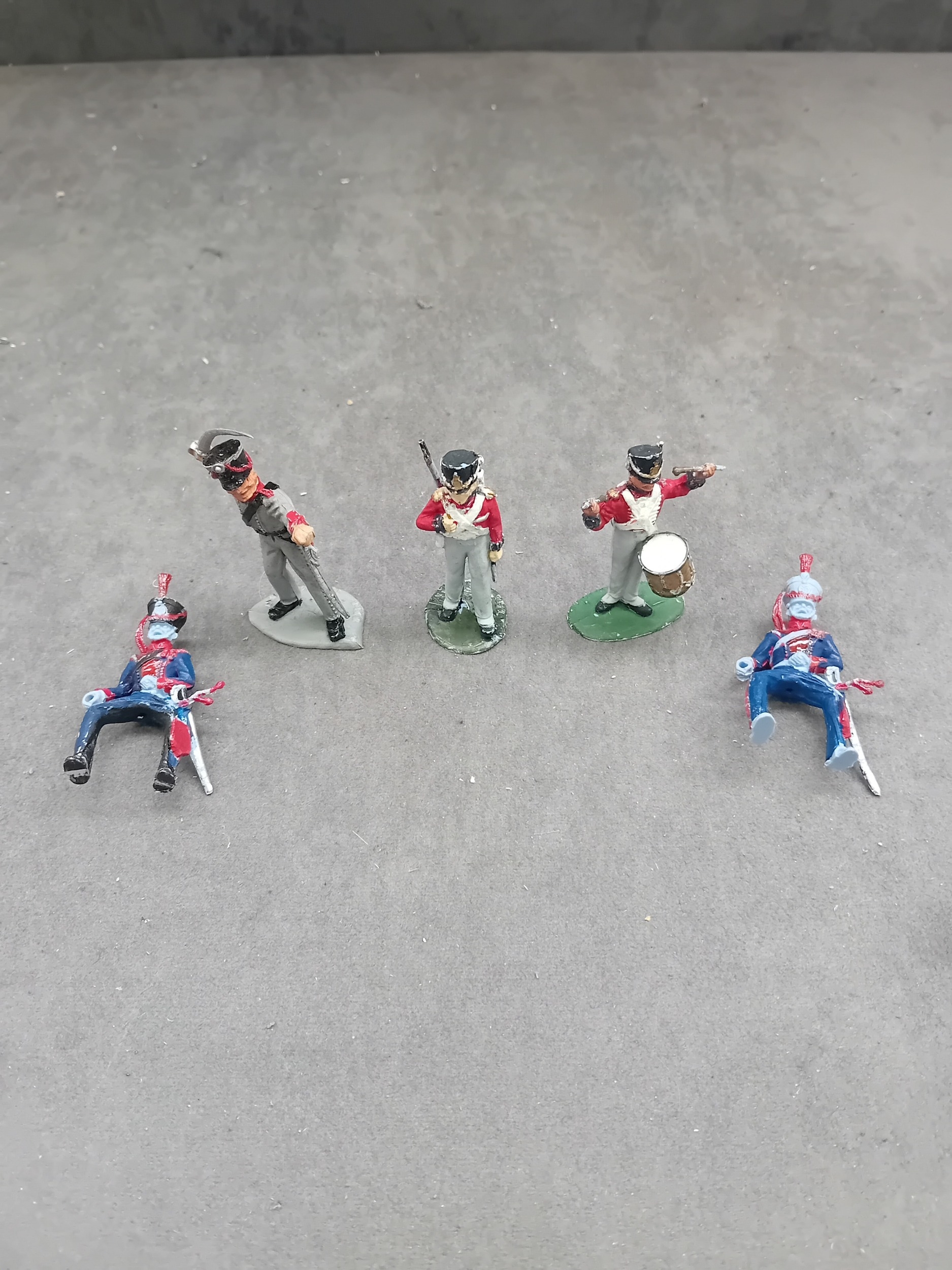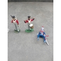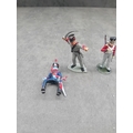 A group of five hand-painted, cast metal miniature military figures, depicting soldiers in period European-style uniforms, likely from the Napoleonic era. The lot includes two figures in blue and red uniforms, posed as if seated or fallen, one of which is broken at the waist and missing its lower half. Also present are one standing figure in a grey uniform with a raised saber; one standing infantryman in a red and white uniform holding a rifle; and one standing musician figure in a red and white uniform playing a fife and drum. Three of the standing figures are mounted on oval green bases, one of which is embossed "MADE IN ENGLAND" on its underside.