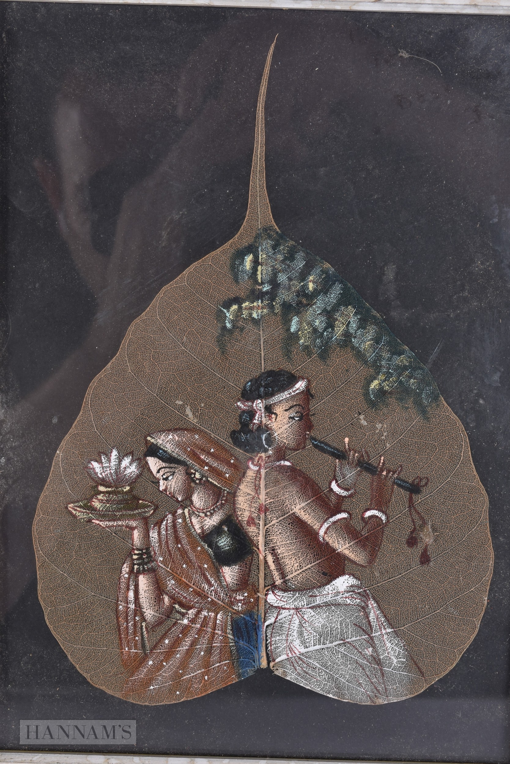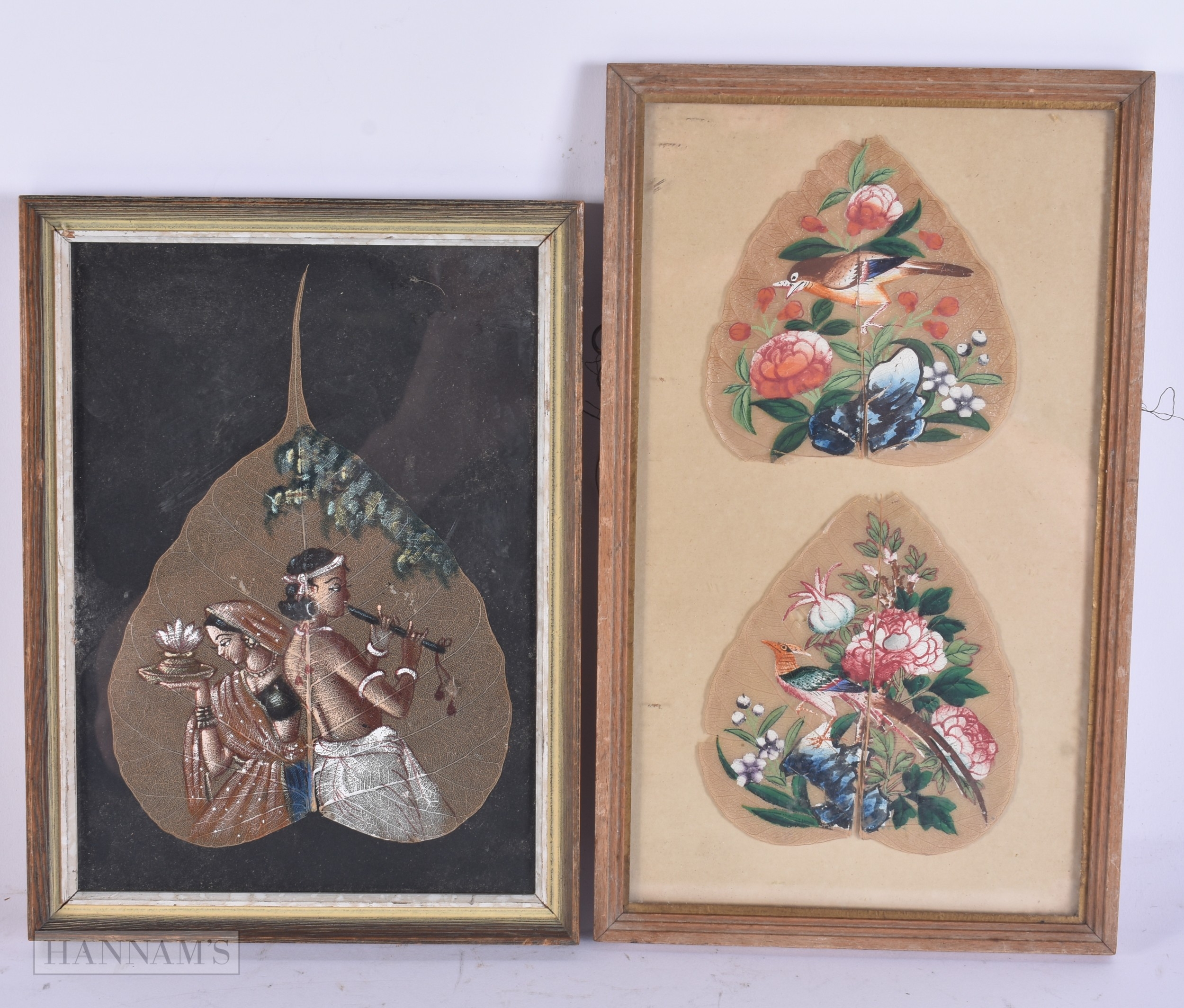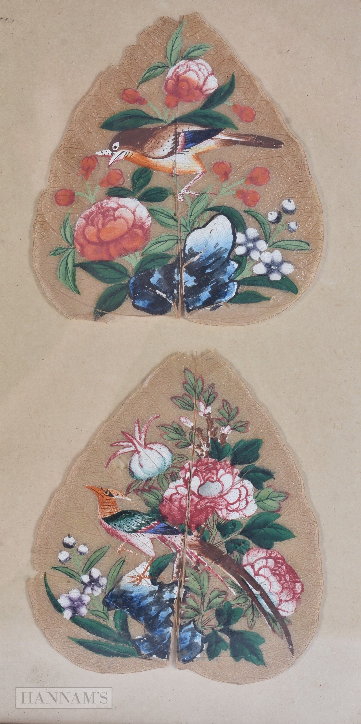 TWO INDIAN PAINTED LEAF PAINTINGS. Largest 28cm x 18cm. (2)