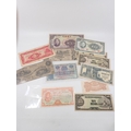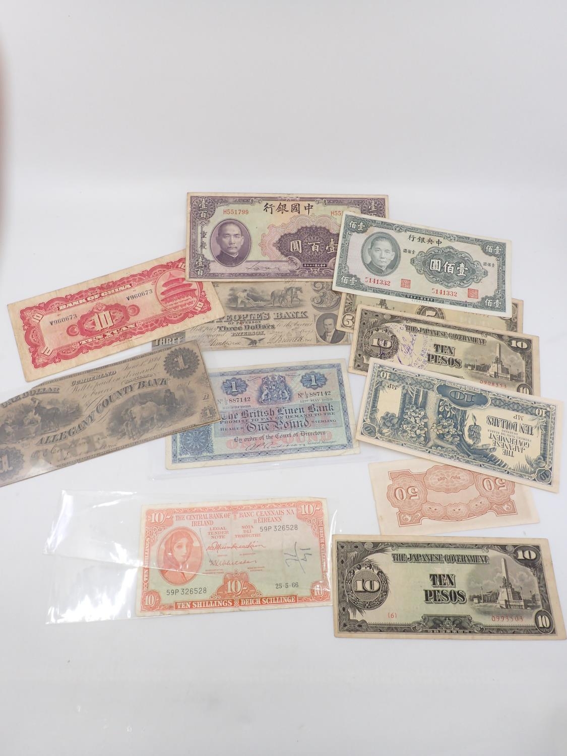 A collection of bank notes, including an Irish Ten shilling note, The People's Bank of Paterson Three Dollars, The Allegany County Bank One Dollar, The British Linen Bank One Pound, Chinese and Japanese bank notes.