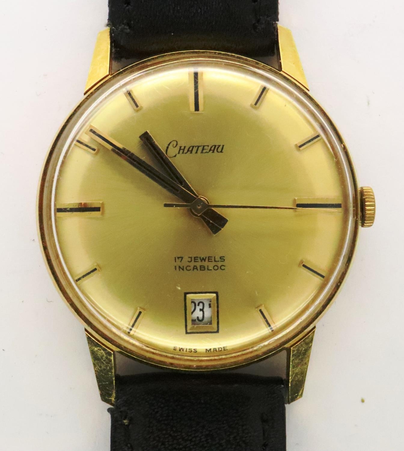 Chateau: 17 jewels wristwatch on black leather strap. P&P Group 1 (£14+VAT for the first lot and £1+VAT for subsequent lots)