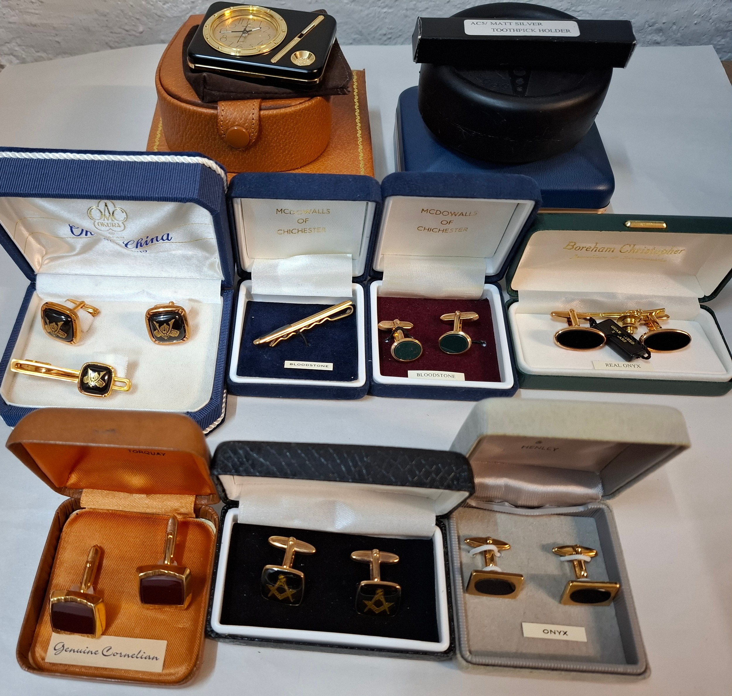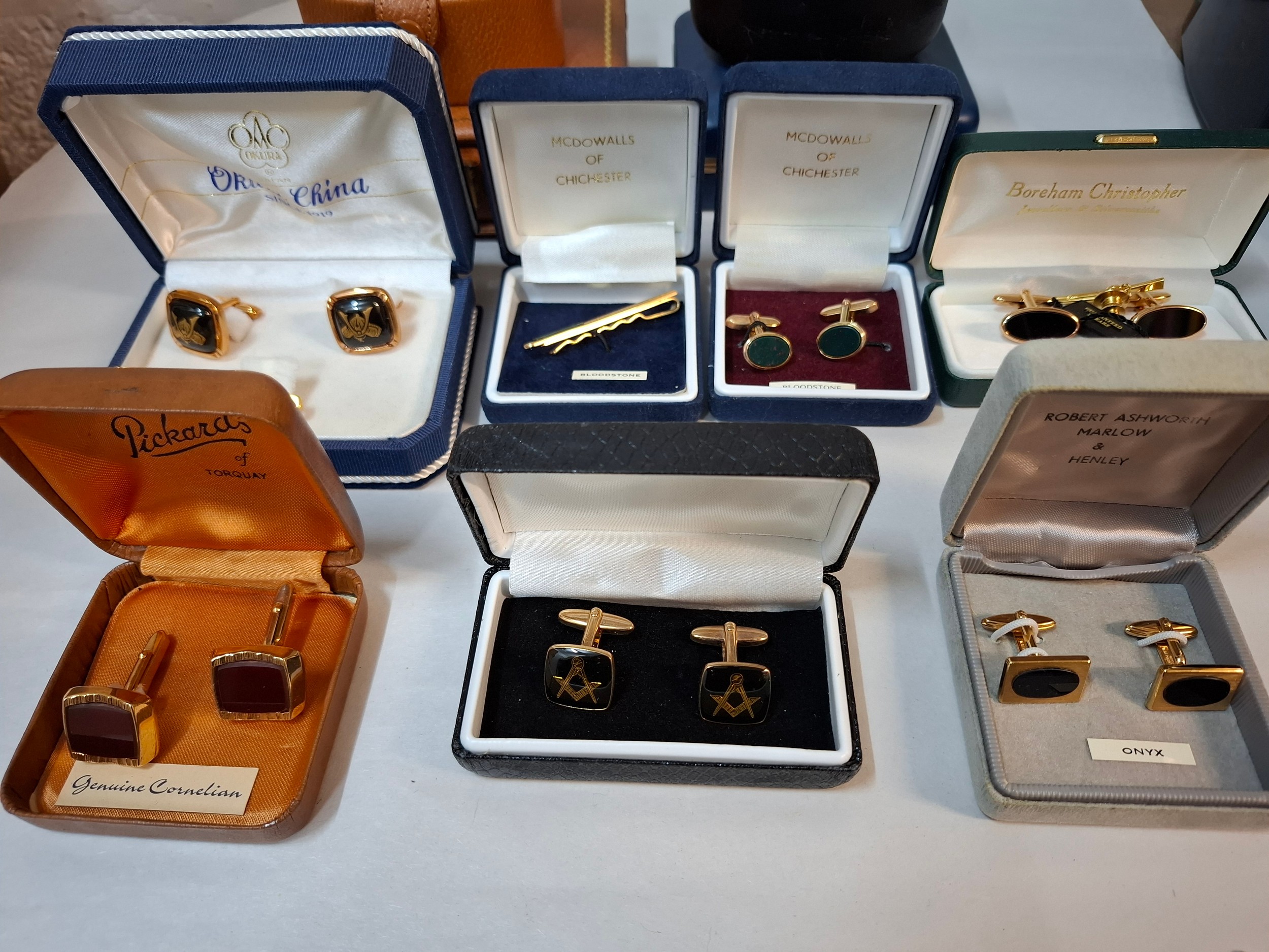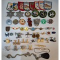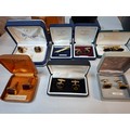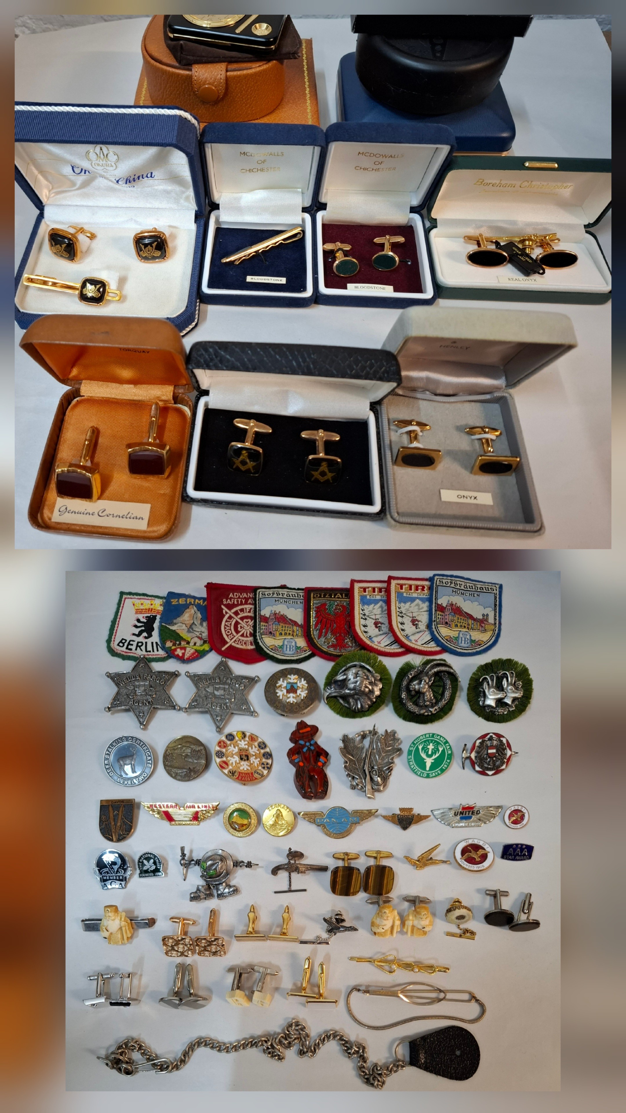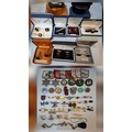 A quantity of cufflinks, cloth badges, sporting brooches and small collectables to include 2 reproduction Wells Fargo Agent badges, airline pilot wings and cufflinks inset with hard stones. Location: R1.3