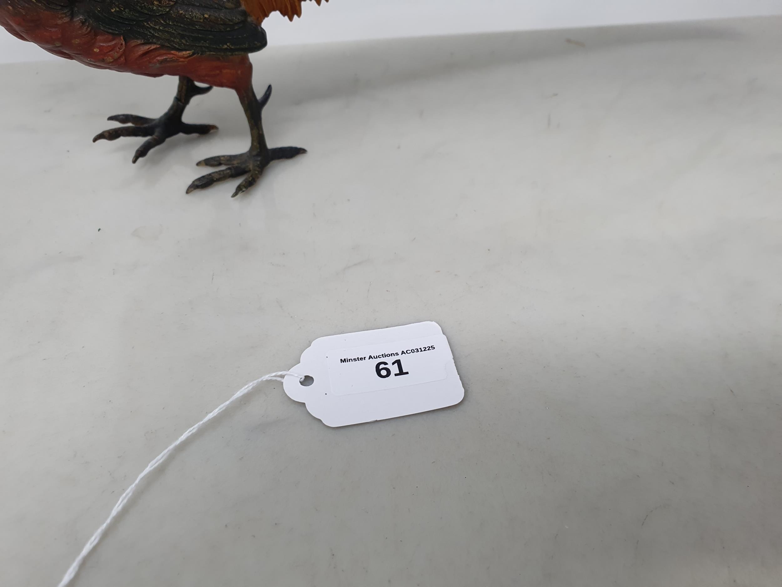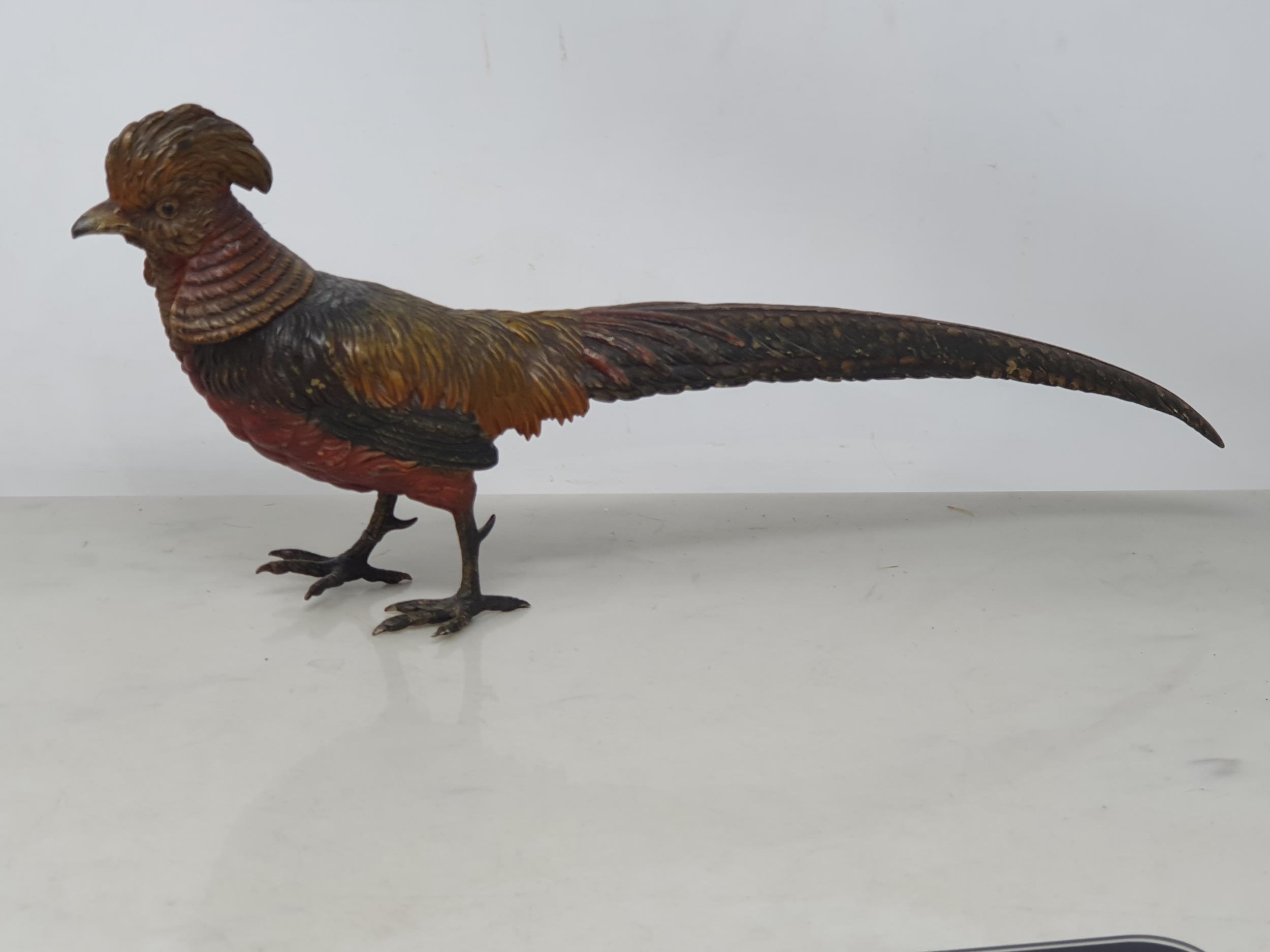 A cold painted bronze type exotic Cock Pheasant, 14 1/2in, one leg A/F