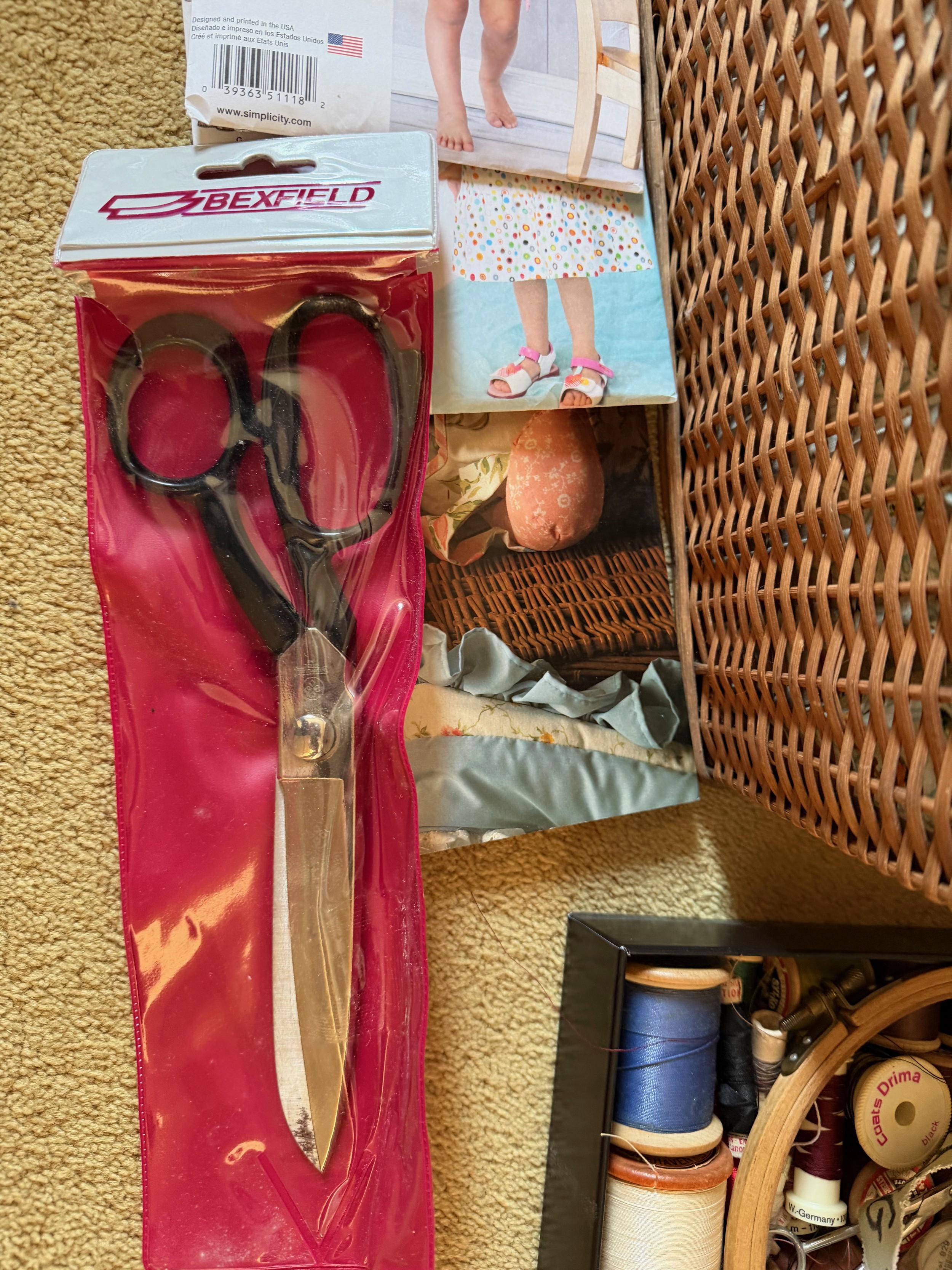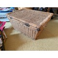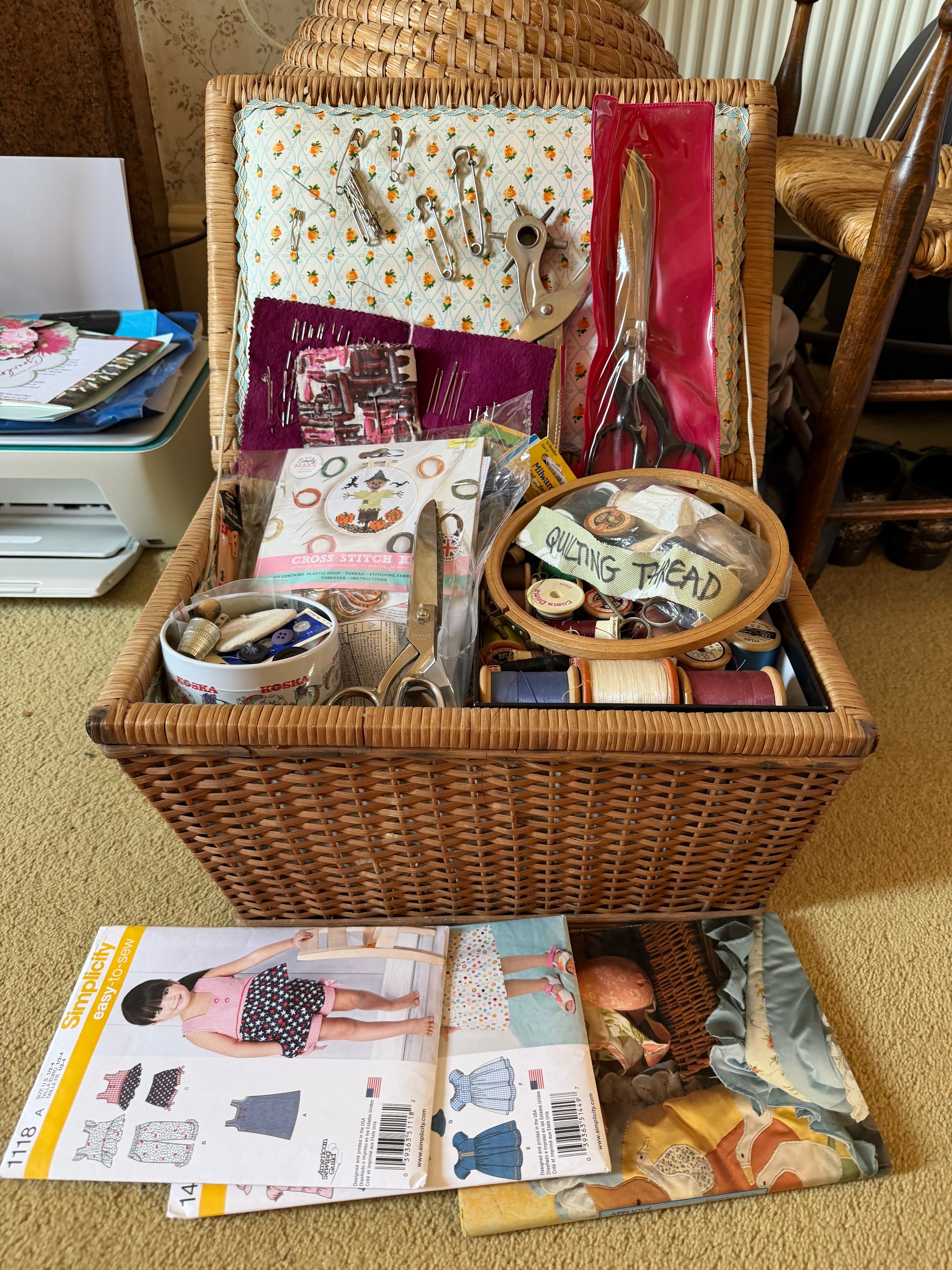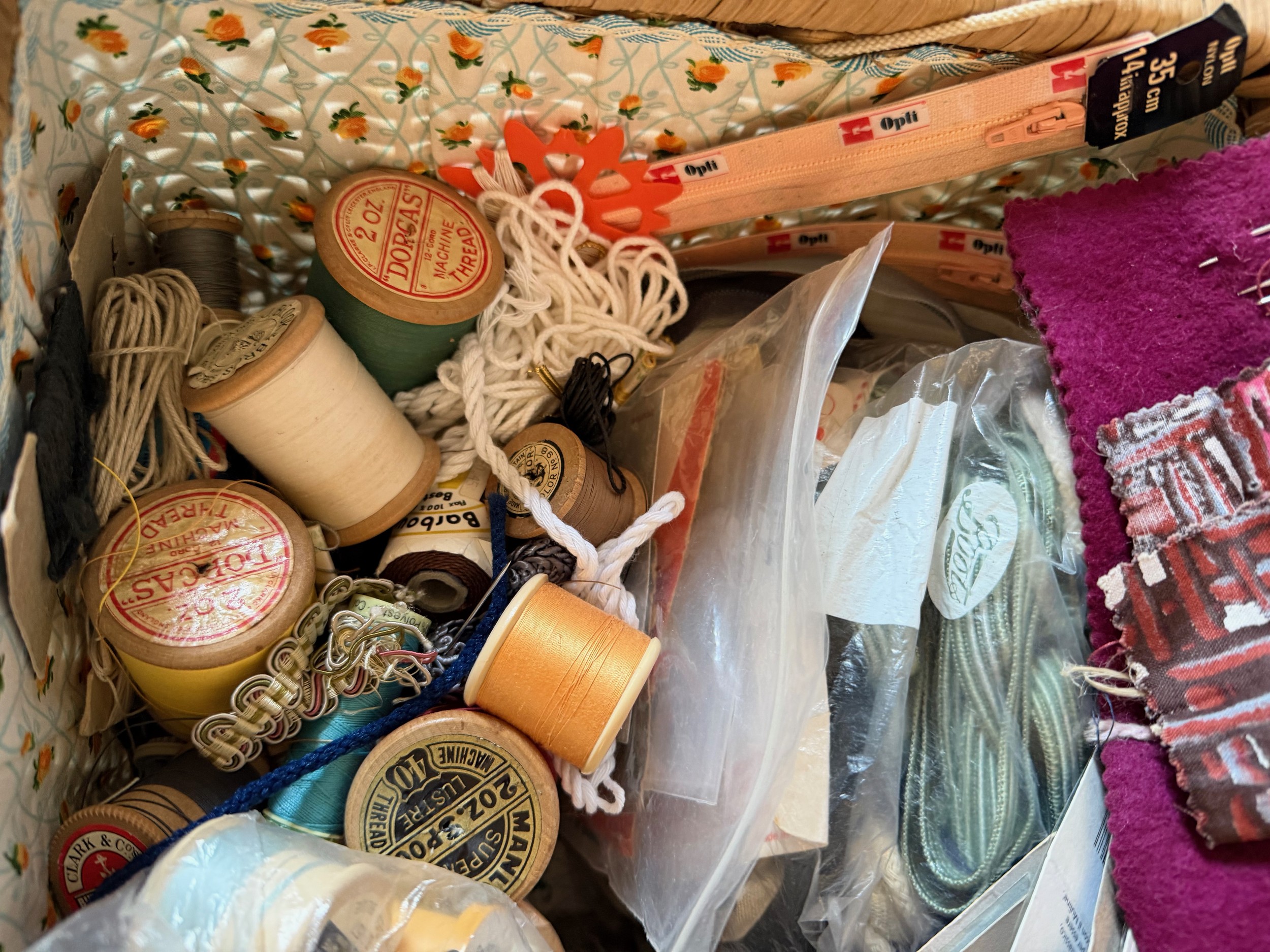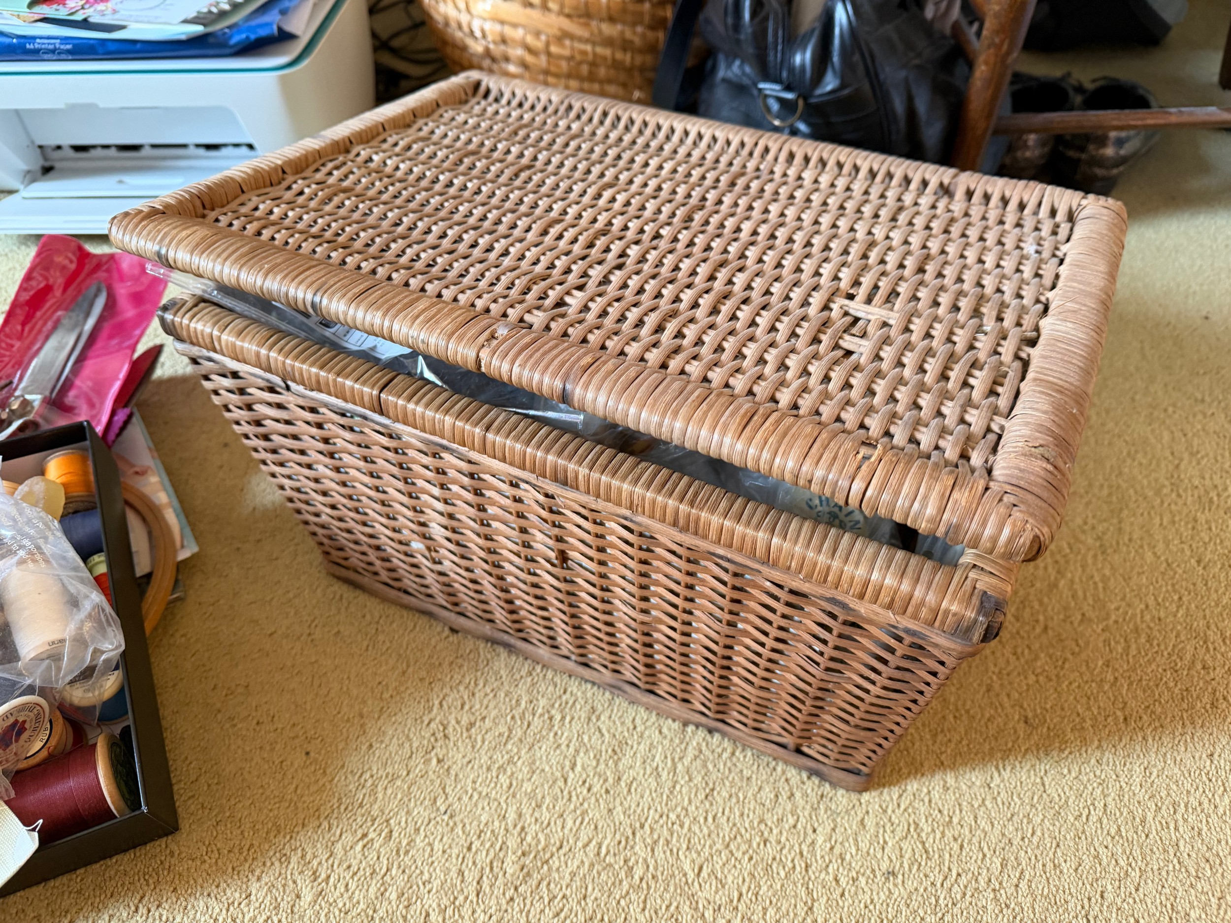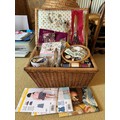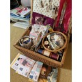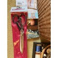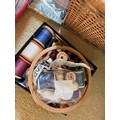 Wicker sewing box and contents, scissors thread etc.This lot is available for in-house shipping